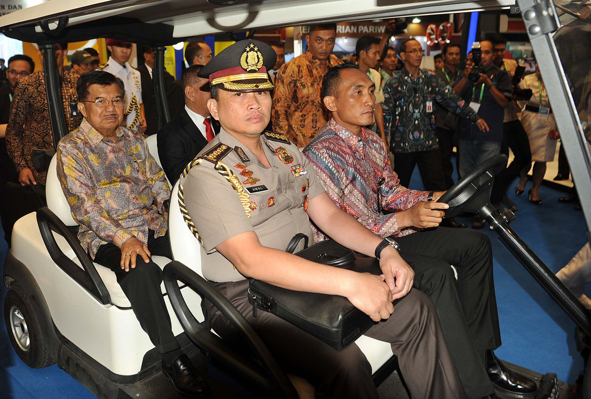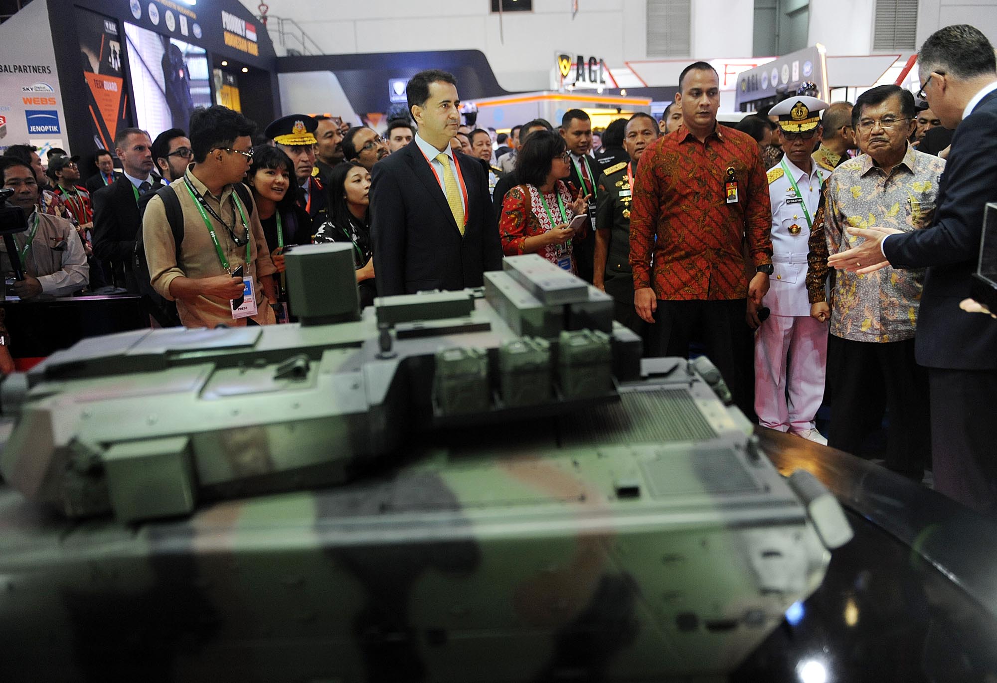 Wakil Presiden Jusuf Kalla meninjau pameran alutsista saat pembukaan Indo Defence 2018 Expo and Forum, di JIExpo Kemayoran, Jakarta, Rabu (7/11/2018). Pameran industri pertahanan yang diselenggarakan oleh Kementerian Pertahanan itu berlangsung hingga 10 November 2018. AKTUAL/Tino Oktaviano