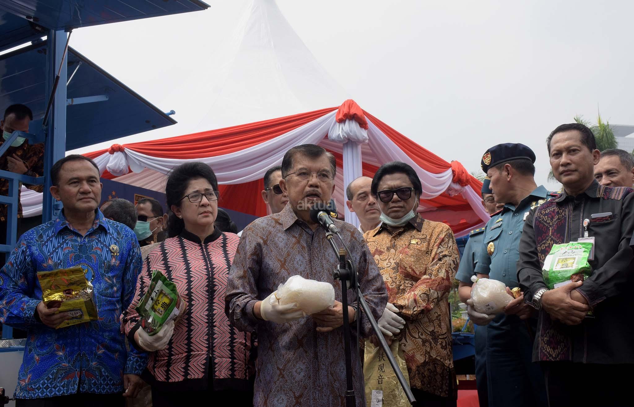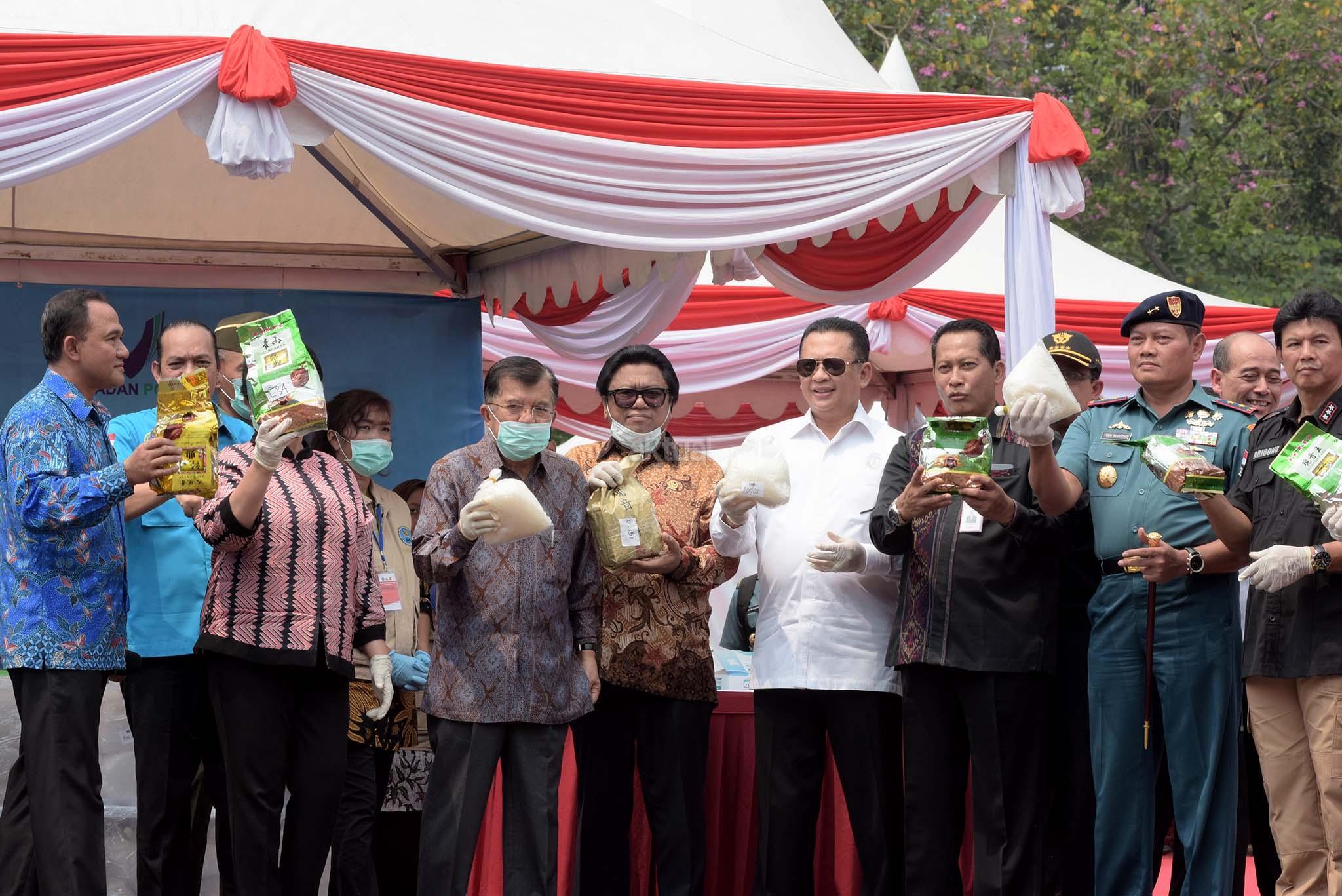 Wakil Presiden Jusuf Kalla (dua kiri) didampingi Deputi Pemberantasan BNN, Irjen Pol Arman Depari (kiri), Ketua DPD Oesman Sapta Odang (ketiga kanan) menghadiri pemusnahan narkotika jenis sabu di lapangan silang Monas, Jakarta, Jumat (4/5/2018). Sebanyak 2,647 ton barang bukti narkotika jenis sabu dimusnahkan dari hasil penyitaan oleh BNN dan Direktorat IV Bareskrim Polri dari delapan tersangka yang diancam hukuman mati. AKTUAL/Tino Oktaviano