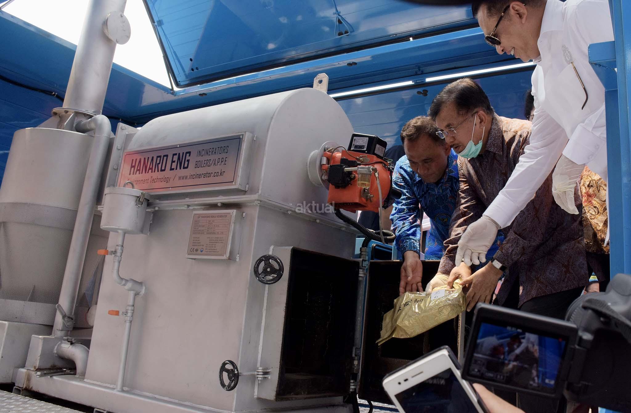 Wakil Presiden Jusuf Kalla (tengah) didampingi Kepala Badan Narkotika Nasional (BNN) Komjen Pol Heru Winarko (kiri) dan Ketua DPR Bambang Soesatyo (kanan) memusnahkan narkotika jenis sabu di lapangan silang Monas, Jakarta, Jumat (4/5/2018). Sebanyak 2,647 ton barang bukti narkotika jenis sabu dimusnahkan dari hasil penyitaan oleh BNN dan Direktorat IV Bareskrim Polri dari delapan tersangka yang diancam hukuman mati. AKTUAL/Tino Oktaviano