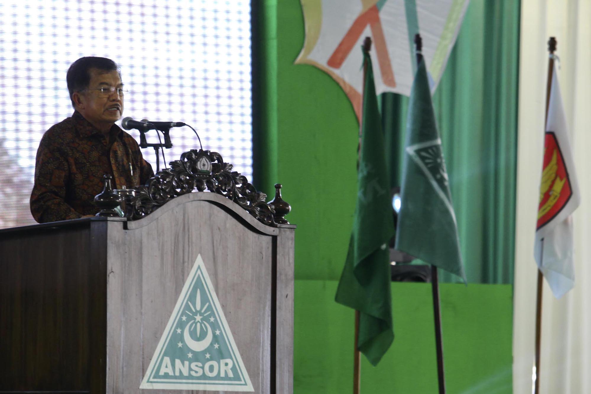 Wakil Presiden RI, Jusuf Kalla berpidato saat membuka acara Silaturahmi Akbar dan Kongres XV GP Ansor di Pondok Pesantren Sunan Pandanaran, Sleman, Yogyakarta (26/11). Kongres GP Ansor XV bertajuk "Menjaga nilai keutuhan bangsa, memperkuat kedaulatan negara dan meluhurkan nilai kemanusiaan" itu berlangsung hingga 28 November 2015. ANTARA FOTO/Andreas Fitri Atmoko/pd/15.