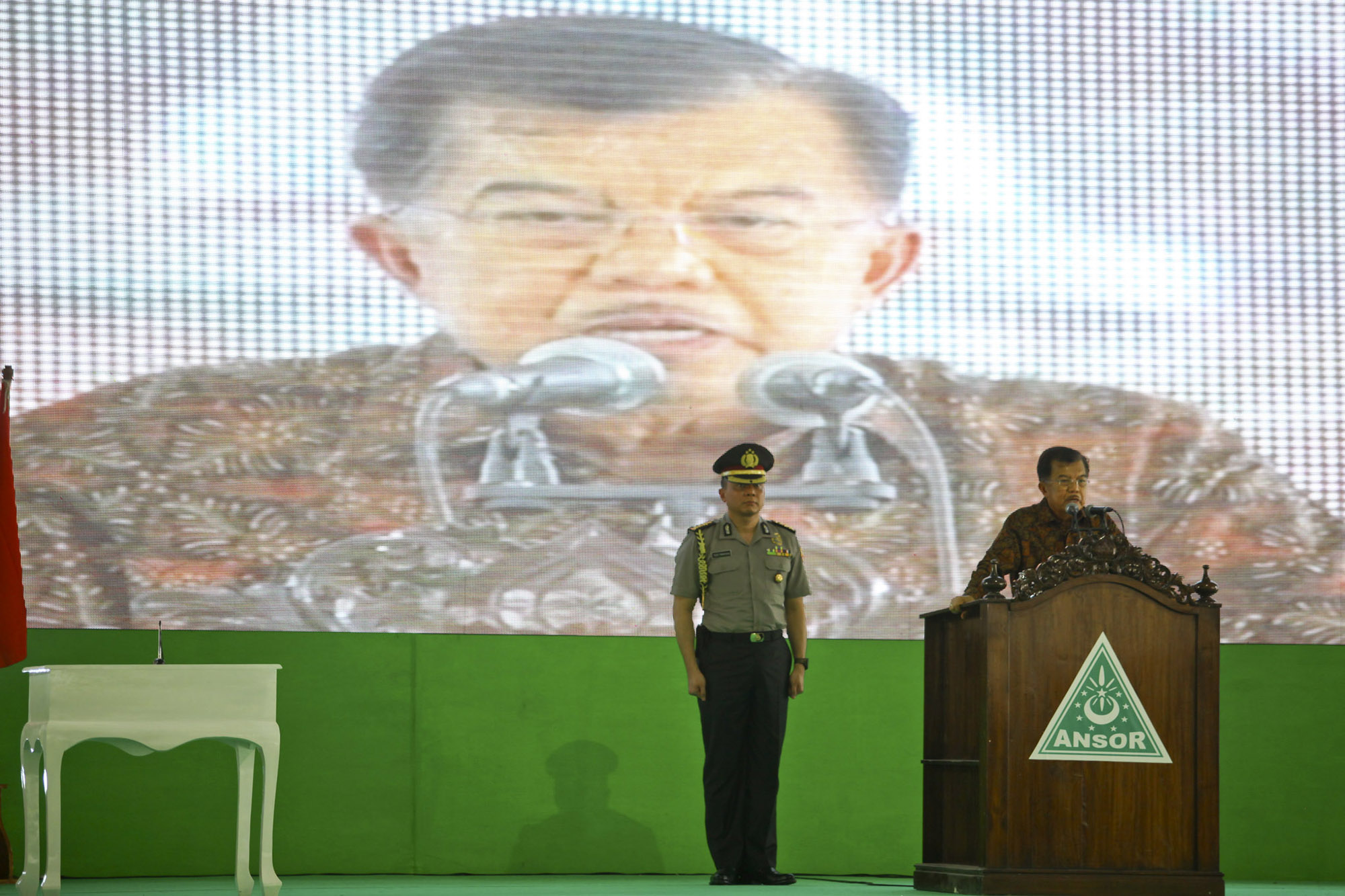Wakil Presiden RI, Jusuf Kalla (kanan) berpidato saat membuka acara Silaturahmi Akbar dan Kongres XV GP Ansor di Pondok Pesantren Sunan Pandanaran, Sleman, Yogyakarta (26/11). Kongres GP Ansor XV bertajuk "Menjaga nilai keutuhan bangsa, memperkuat kedaulatan negara dan meluhurkan nilai kemanusiaan" itu berlangsung hingga 28 November 2015. ANTARA FOTO/Andreas Fitri Atmoko/pd/15.