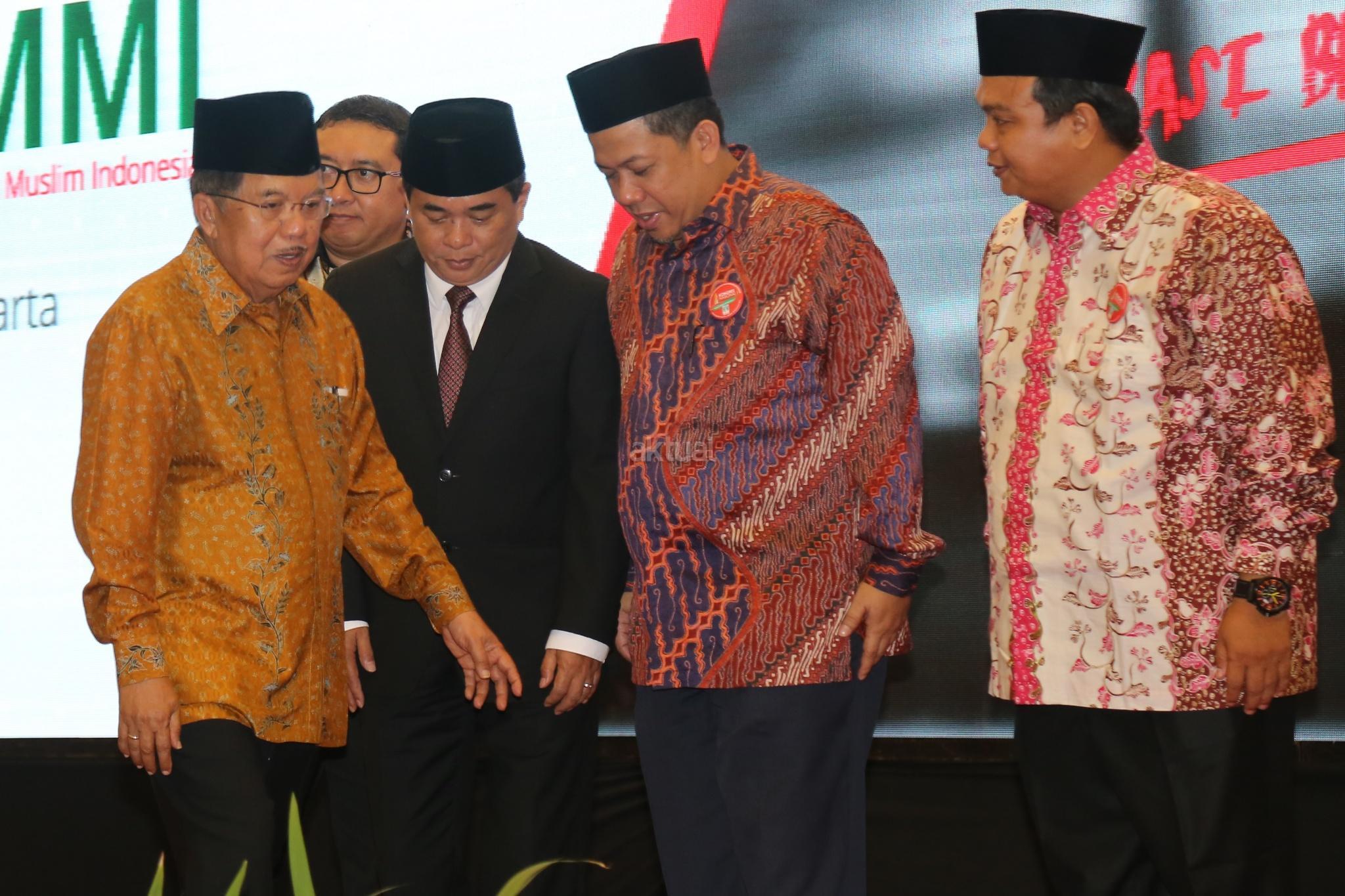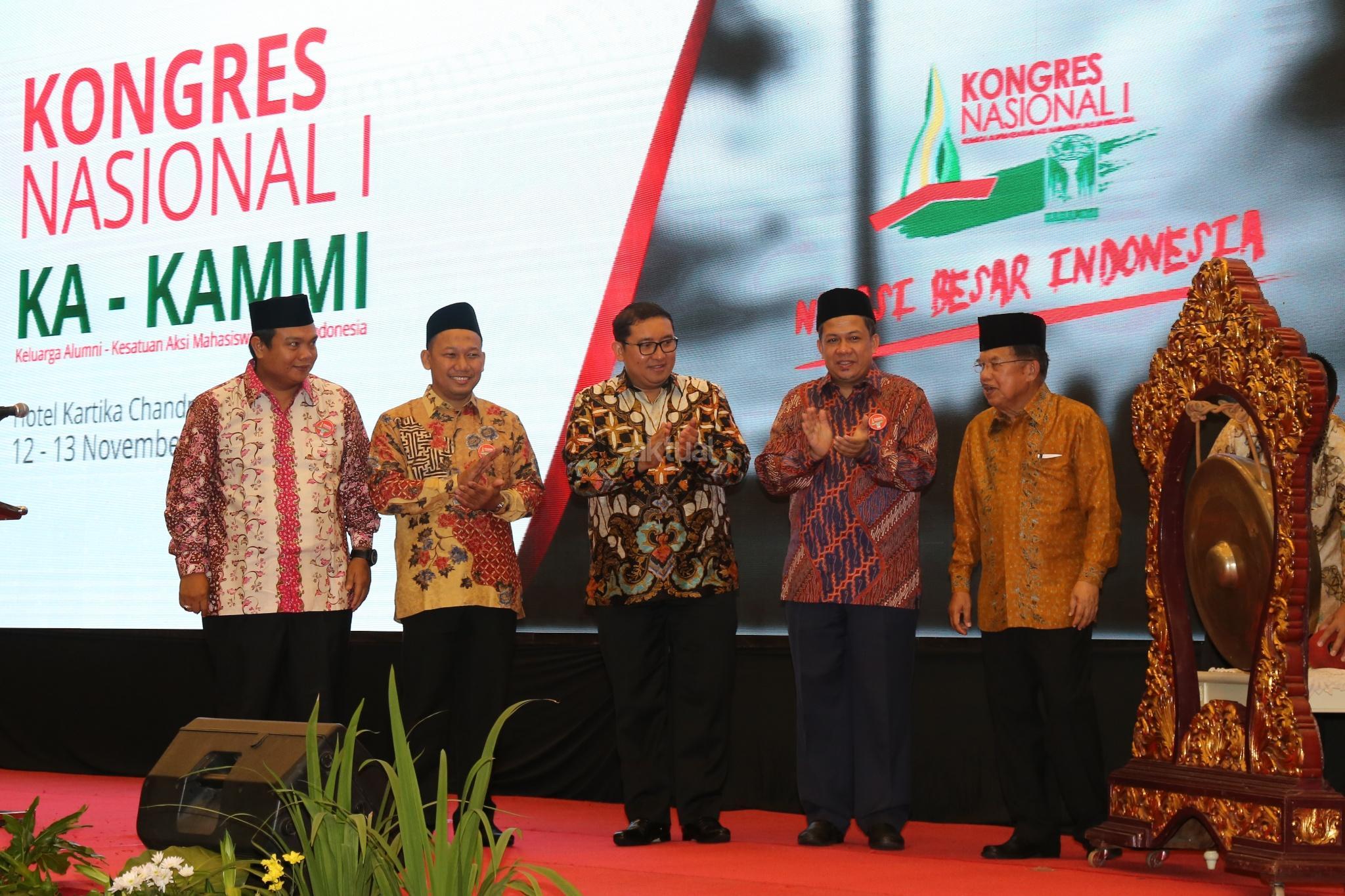 Wakil Presiden Jusuf Kalla didampingi Wakil Ketua DPR Fahri Hamzah dan Wakil Ketua DPR Fadli Zon saat pembukan Kongres I Keluarga Alumni Kesatuan Aksi Mahasiswa Muslim Indonesia (KA KAMMI) didampingi Wakil Ketua DPR Fahri Hamzah dan Wakil Ketua DPR Fadli Zon di Kartika Chadra, Jakarta, Sabtu (12/11). Kongres I dibuka oleh Wakil Presiden Jusuf Kalla Dengan memberikan Pidato Kebangsaan ‘Gerakan Islam dan Cita-cita Kepahlawanan Indonesia’. AKTUAL/Tino Oktaviano