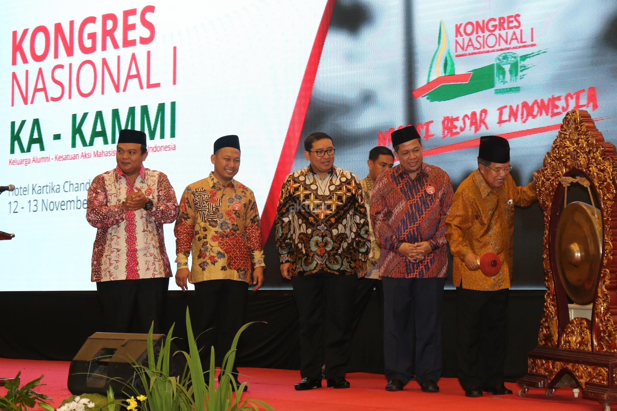 Dari kanan ke kiri, Wakil Presiden Jusuf Kalla memukul gong simbolis pembukan Kongres I Keluarga Alumni Kesatuan Aksi Mahasiswa Muslim Indonesia (KA KAMMI) didampingi Wakil Ketua DPR Fahri Hamzah dan Wakil Ketua DPR Fadli Zon di Kartika Chadra, Jakarta, Sabtu (12/11). Kongres I dibuka oleh Wakil Presiden Jusuf Kalla Dengan memberikan Pidato Kebangsaan ‘Gerakan Islam dan Cita-cita Kepahlawanan Indonesia’. AKTUAL/Tino Oktaviano