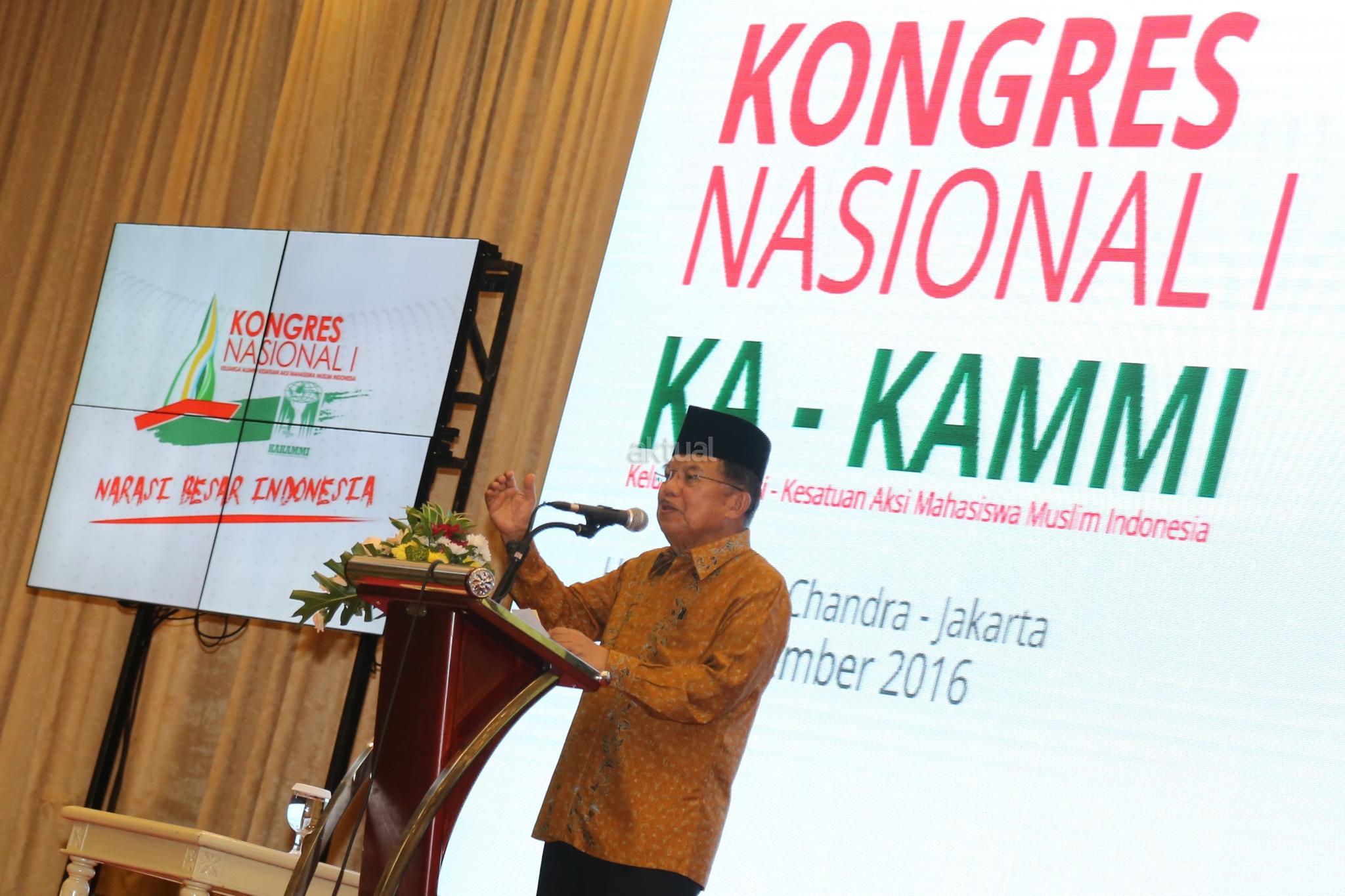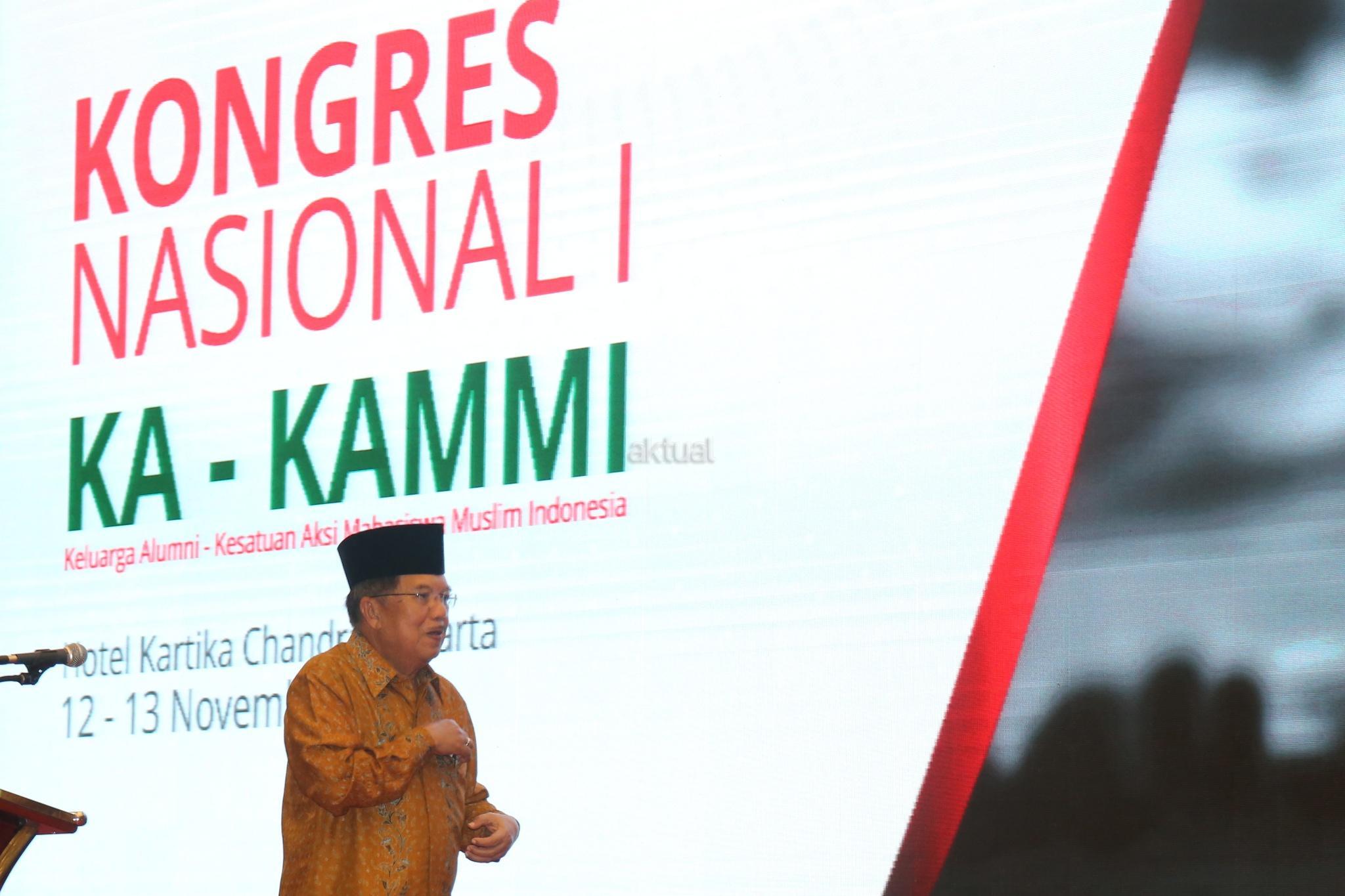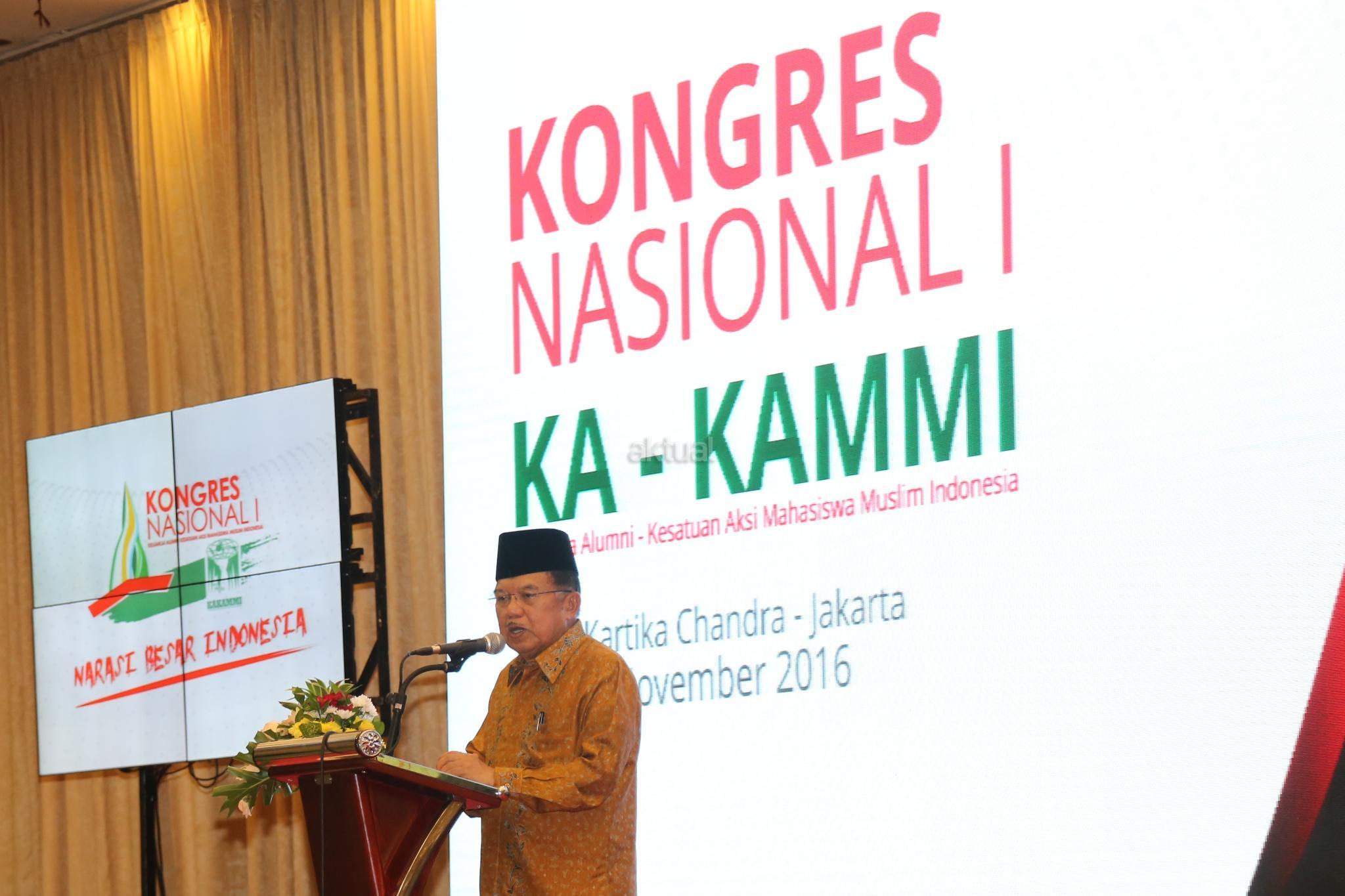 Wakil Presiden Jusuf Kalla menyampaikan sambutan saat membuka kongres nasional I keluarga alumni Kesatuan Aksi Mahasiswa Muslim Indonesia (KA KAMMI) di Hotel Kartika Chandra, Jakarta, Sabtu (12/11/2016). Dalam kesempatan itu hadir ribuan aktivis KAMMI dan alumni KAMMI dari berbagai daerah di Indonesia. Beberapa tokoh dan politikus yang hadir adalah Wakil Ketua DPR RI Fahri Hamzah yang juga deklarator berdirinya KAMMI, Ketua DPR Ade Komarudin, Wakil Ketua DPR Fadli Zon, Tokoh Malari Hariman Siregar. AKTUAL/Tino Oktaviano