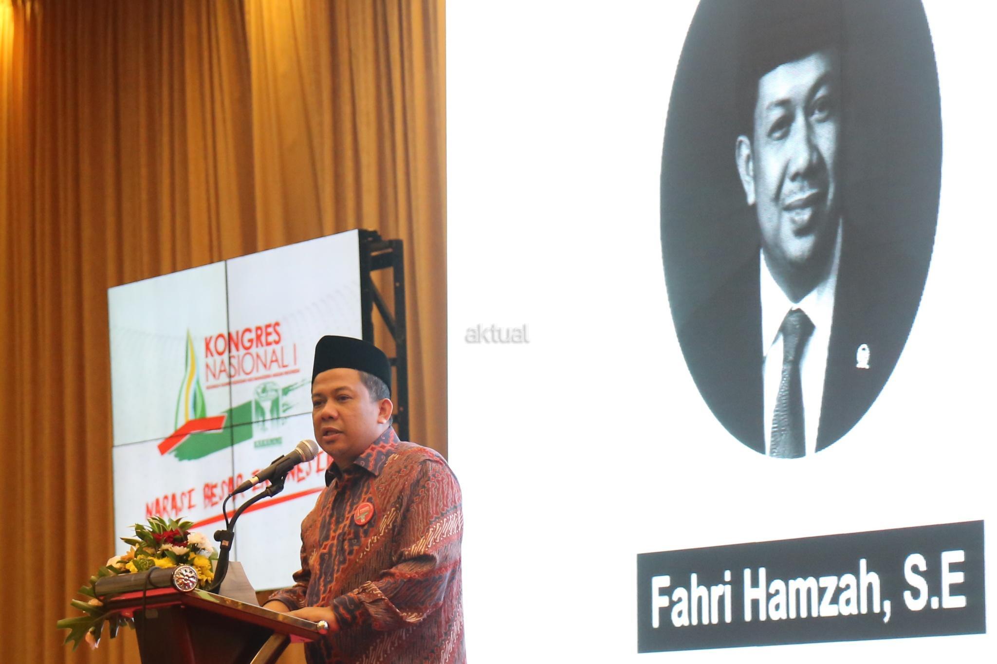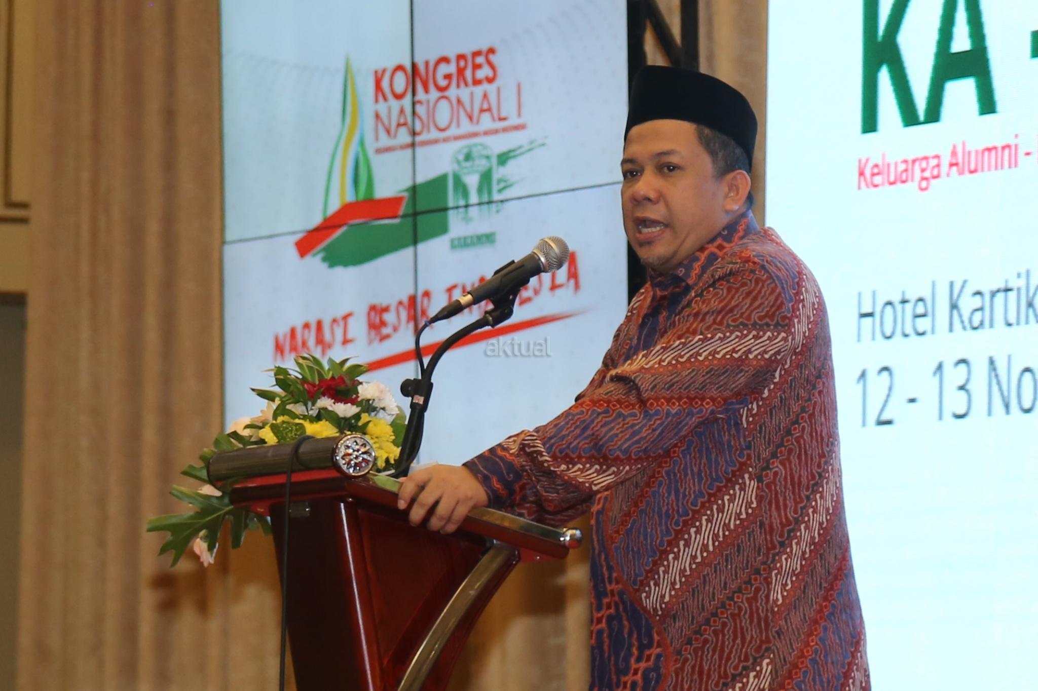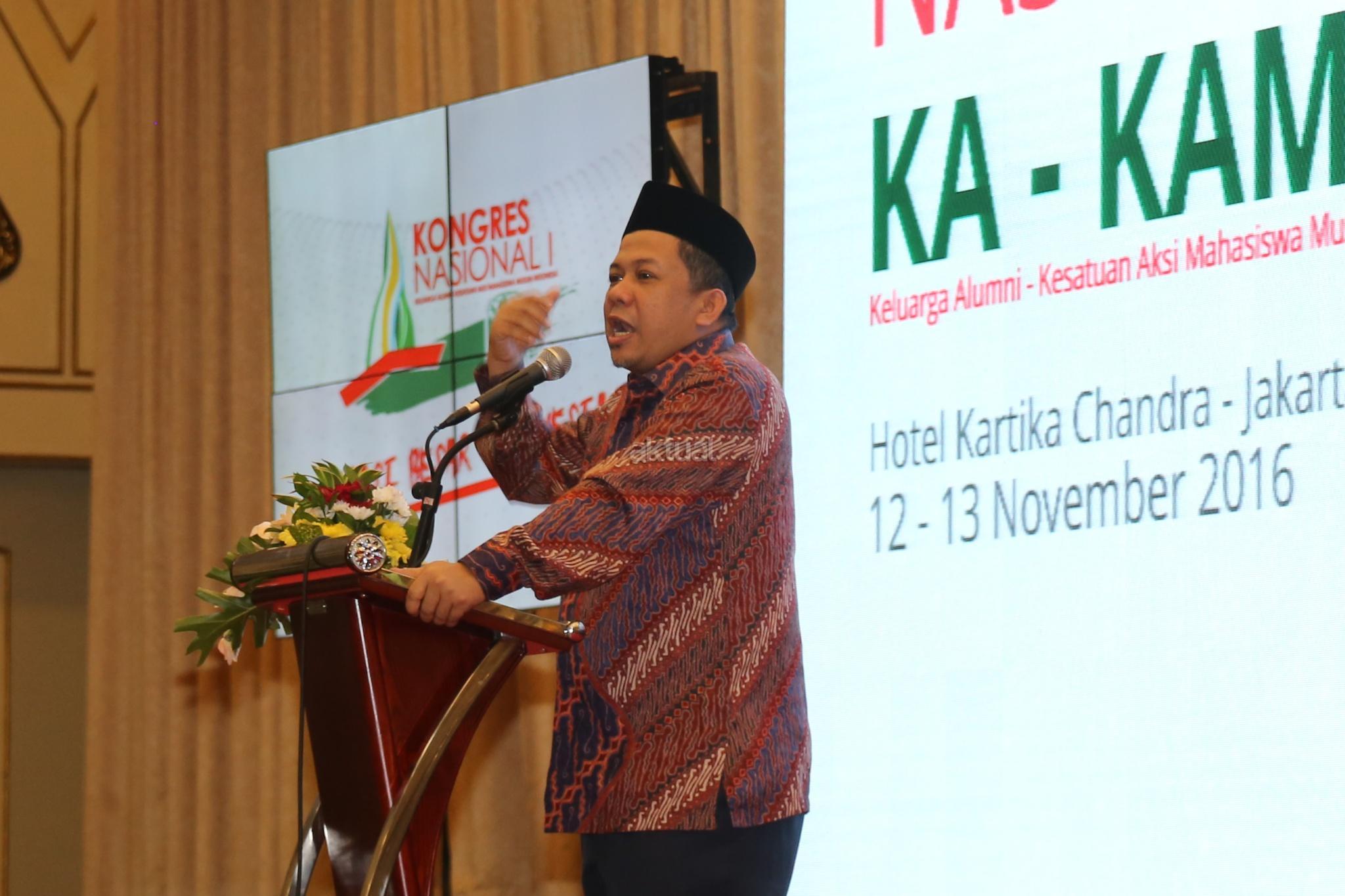 Wakil Ketua DPR Fahri Hamzah, menyampaikan sambutan saat membuka kongres nasional I keluarga alumni Kesatuan Aksi Mahasiswa Muslim Indonesia (KA KAMMI) di Hotel Kartika Chandra, Jakarta, Sabtu (12/11/2016). Dalam kesempatan itu hadir ribuan aktivis KAMMI dan alumni KAMMI dari berbagai daerah di Indonesia. Beberapa tokoh dan politikus yang hadir adalah Wakil Ketua DPR RI Fahri Hamzah yang juga deklarator berdirinya KAMMI, Ketua DPR Ade Komarudin, Wakil Ketua DPR Fadli Zon, Tokoh Malari Hariman Siregar. AKTUAL/Tino Oktaviano
