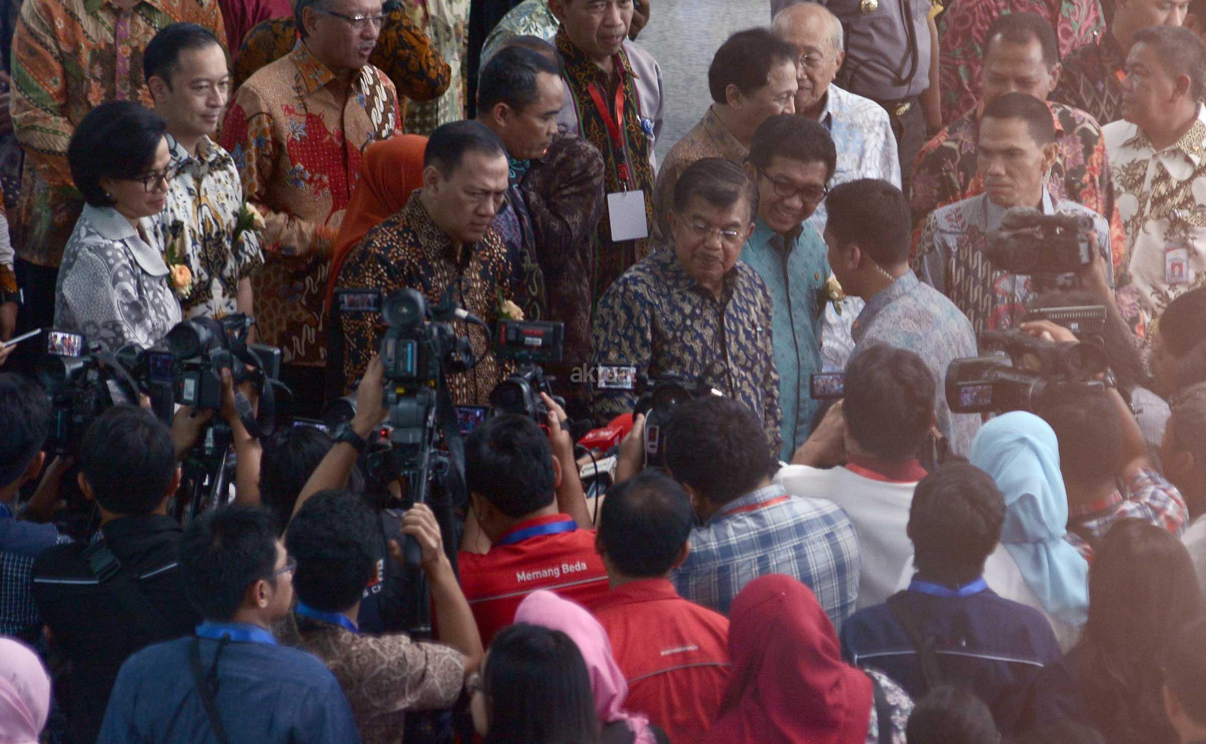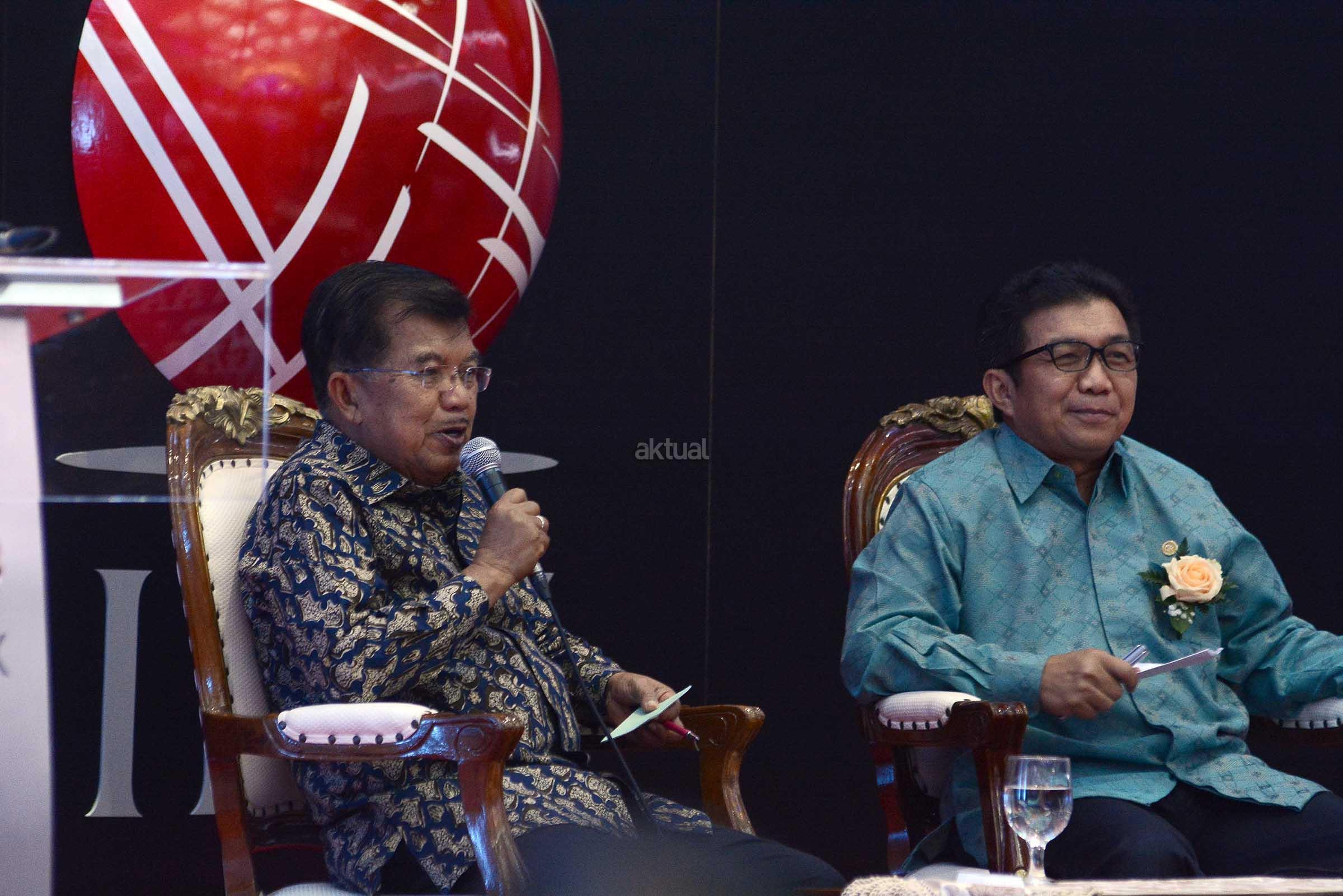 Wakil Presiden Republik Indonesia, Jusuf Kalla didampingi Ketua Dewan Komisioner Otoritas Jasa Keuangan OJK, Muliaman D. Hadad ( kanan) menjawab pertyanyaan para pelaku pasar modal seusai pembukaan pendangangan saham 2017 di Bursa Efek Indonesia (BEI), Jakarta, Selasa 3 Januari 2017. AKTUAL/Eko S Hilman