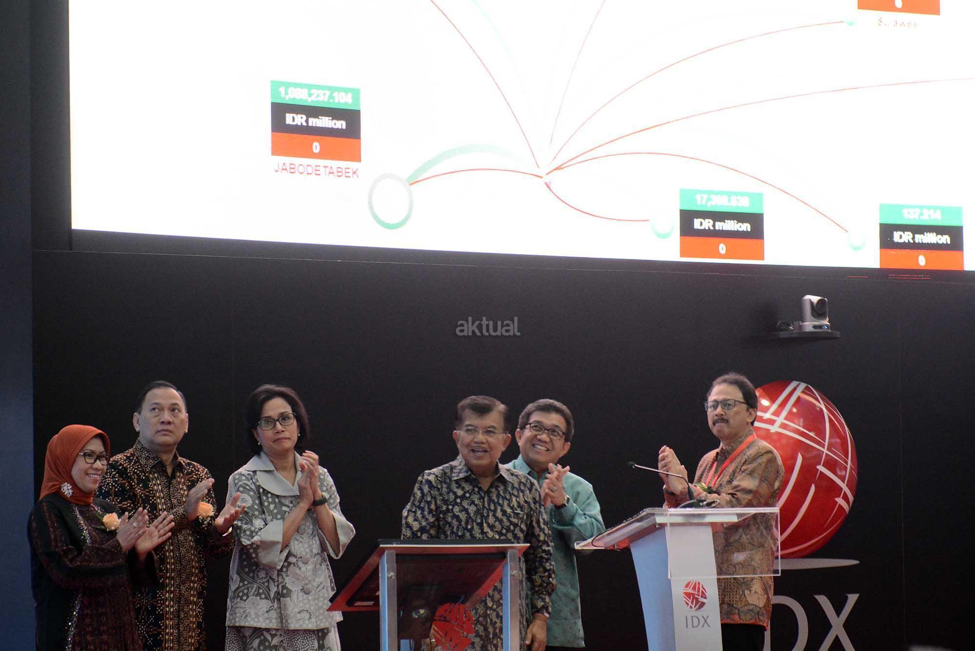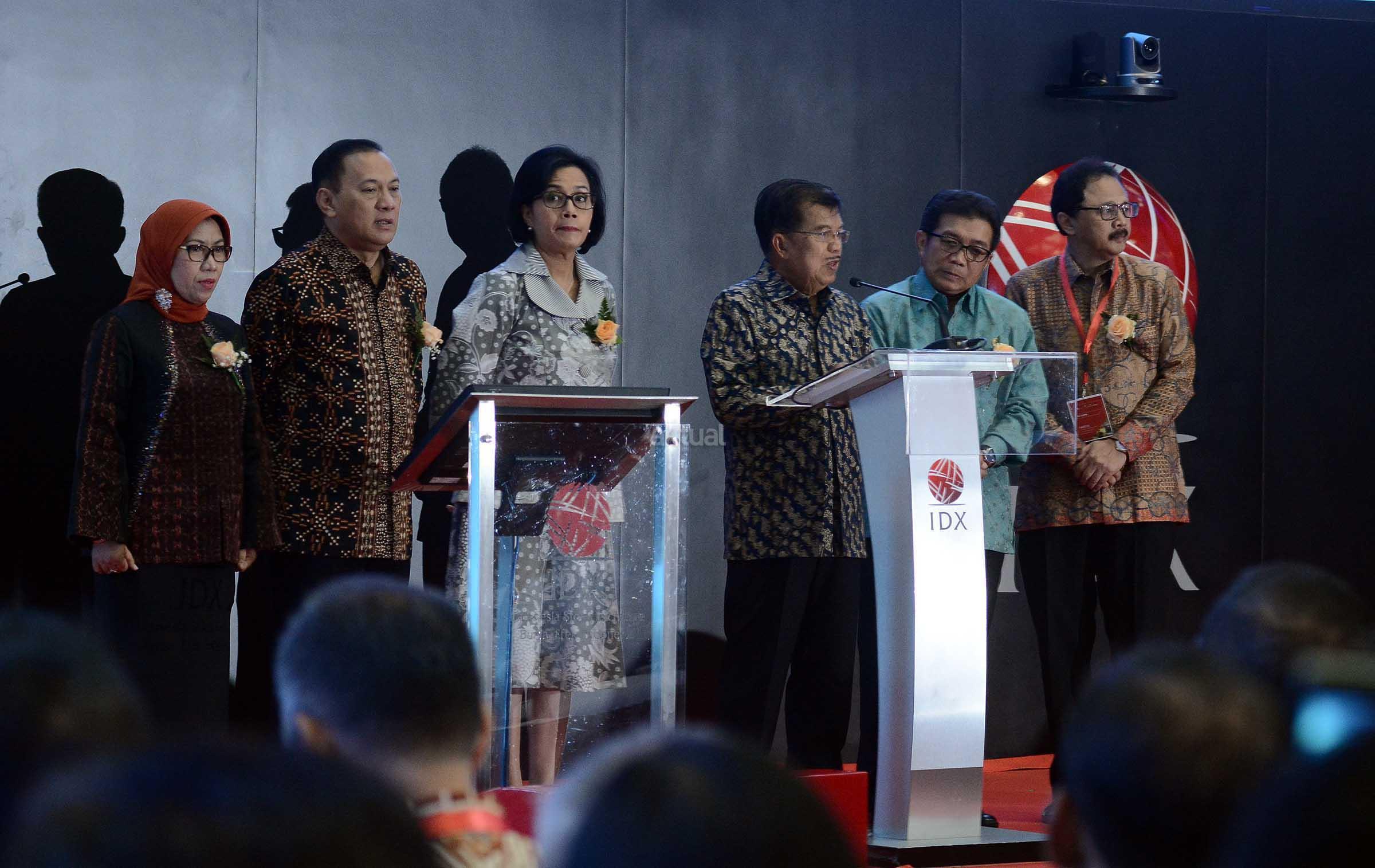 Wakil Presiden Republik Indonesia, Jusuf Kalla (ketiga kanan) menekan tombol disaksikan Menteri Keuangan RI, Sri Mulyani Indrawati (ketiga kiri), Gubernur Bank Indonesia, Agus Martowardojo (kedua kiri), Ketua Dewan Komisioner Otoritas Jasa Keuangan OJK, Muliaman D. Hadad (kedua kanan), Kepala Eksekutif Pengawas Pasar Modal OJK, Nurhaida (kiri), Direktur Utama PT Bursa Efek Indonesia Tito Sulistio (kanan) saat pembukaan pendangangan saham 2017 di Bursa Efek Indonesia (BEI), Jakarta, Selasa 3 Januari 2017.Indeks Harga Saham Gabungan dibuka turun tipis 6,3 poin atau 0,12 persen ke level 5.290,39. AKTUAL/Eko S Hilman