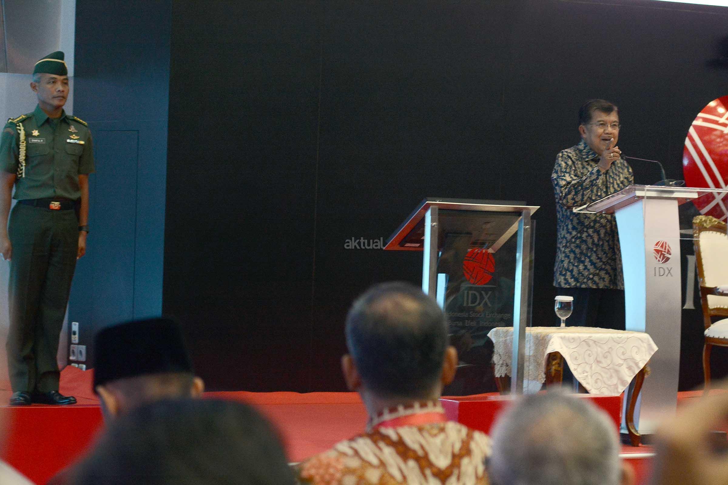 Wakil Presiden Republik Indonesia, Jusuf Kalla menyampaikan sambutan seusai membuka perdagangan saham hari pertama 2017 di BEI, Jakarta, Selasa (3/1). Indeks Harga Saham Gabungan dibuka turun tipis 6,3 poin atau 0,12 persen ke level 5.290,39. AKTUAL/Eko S Hilman