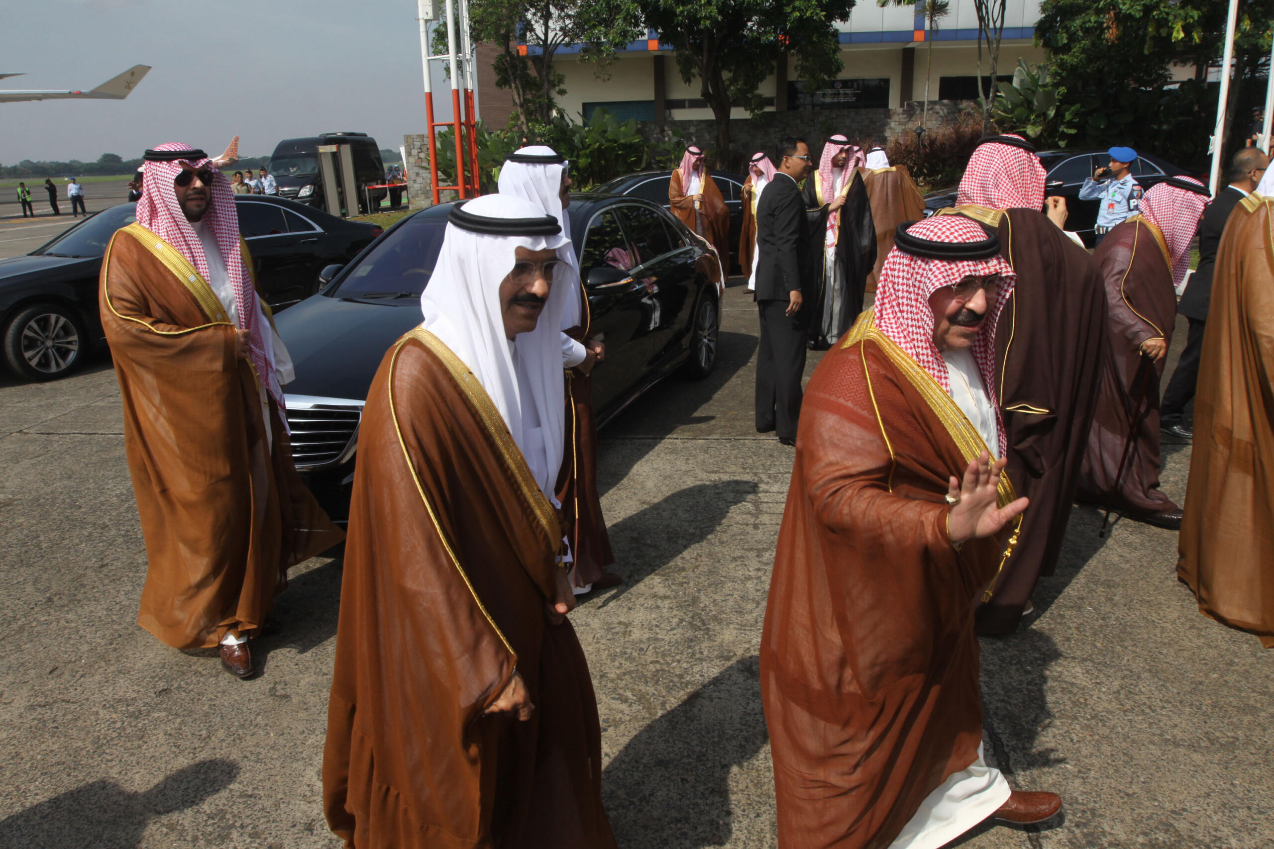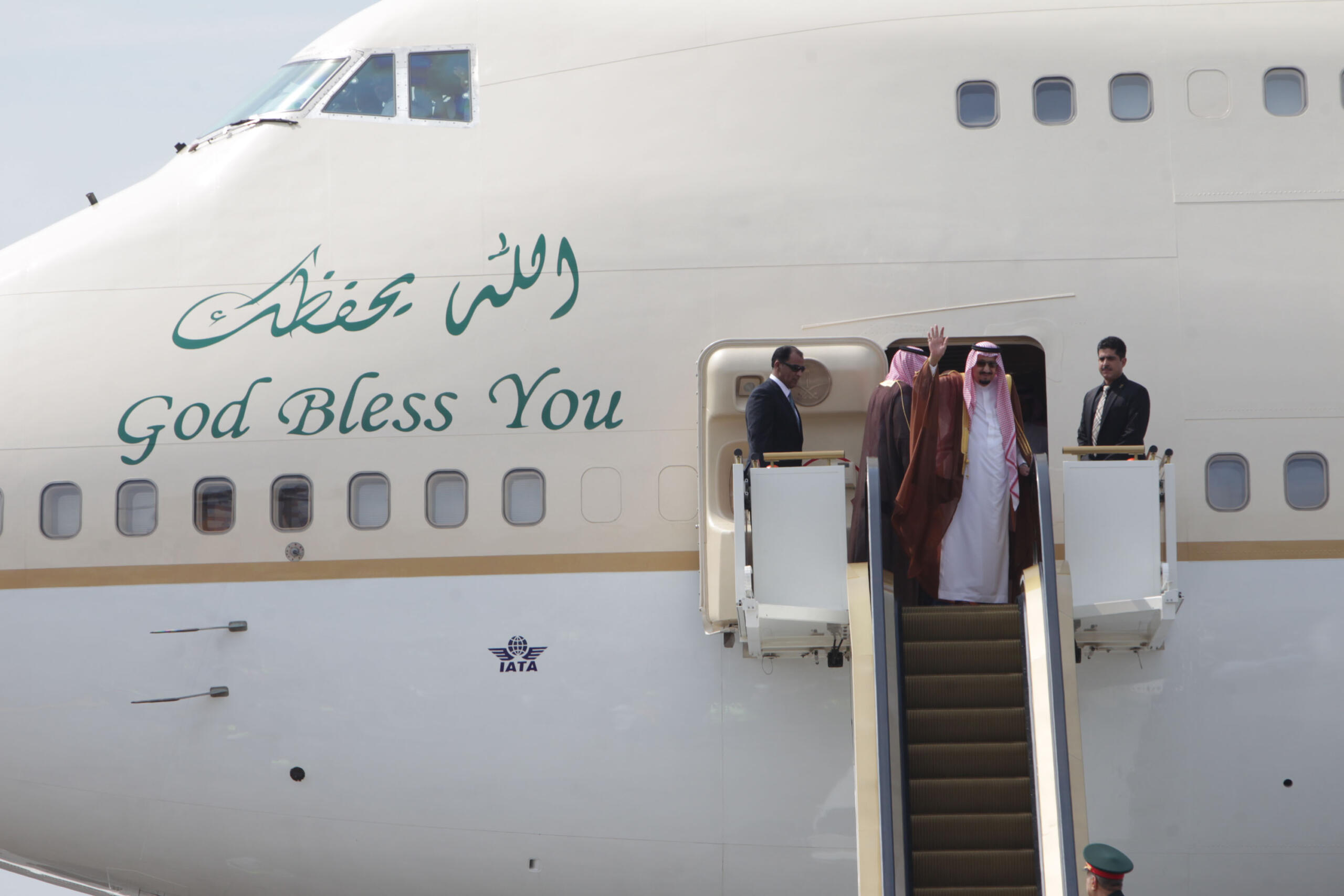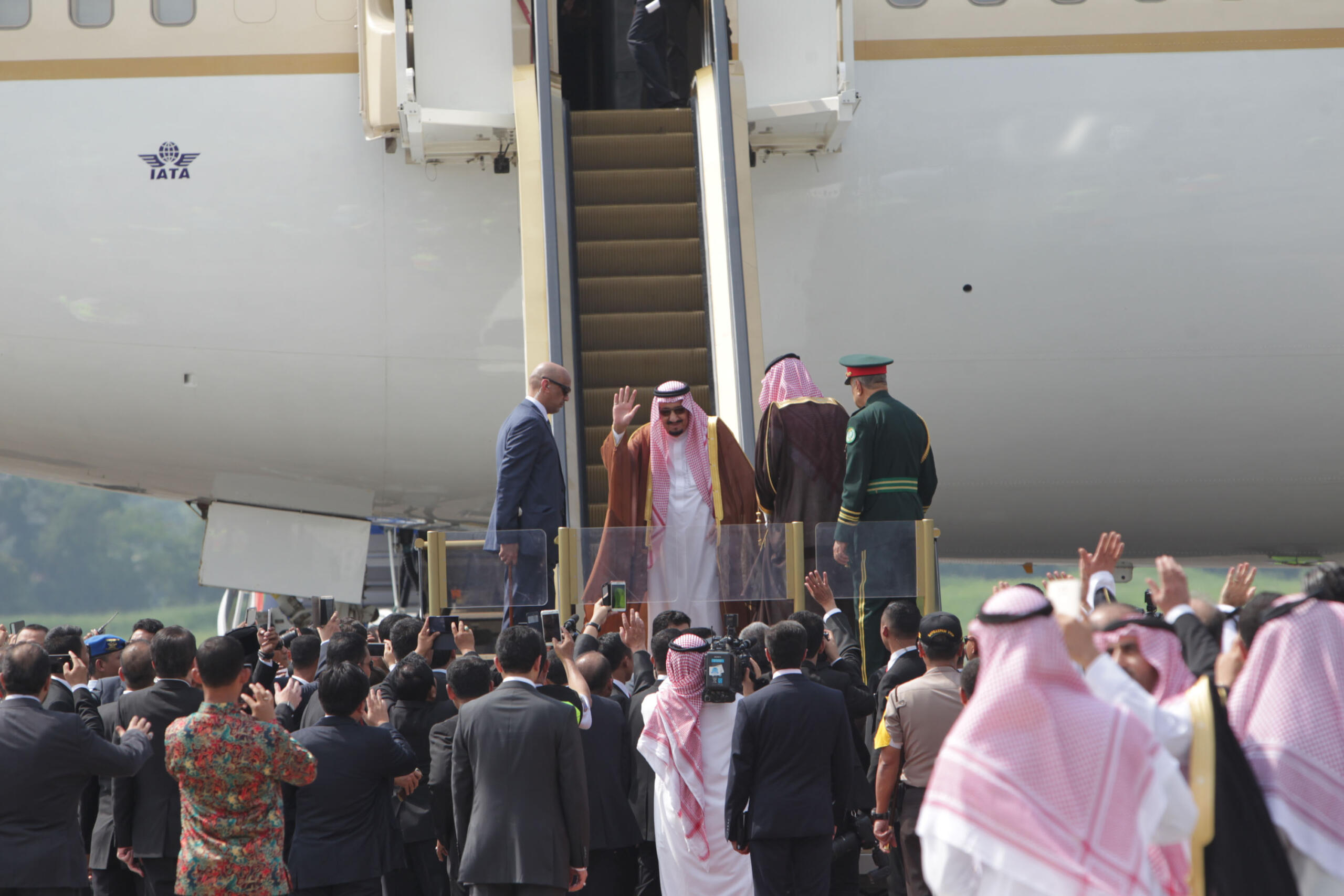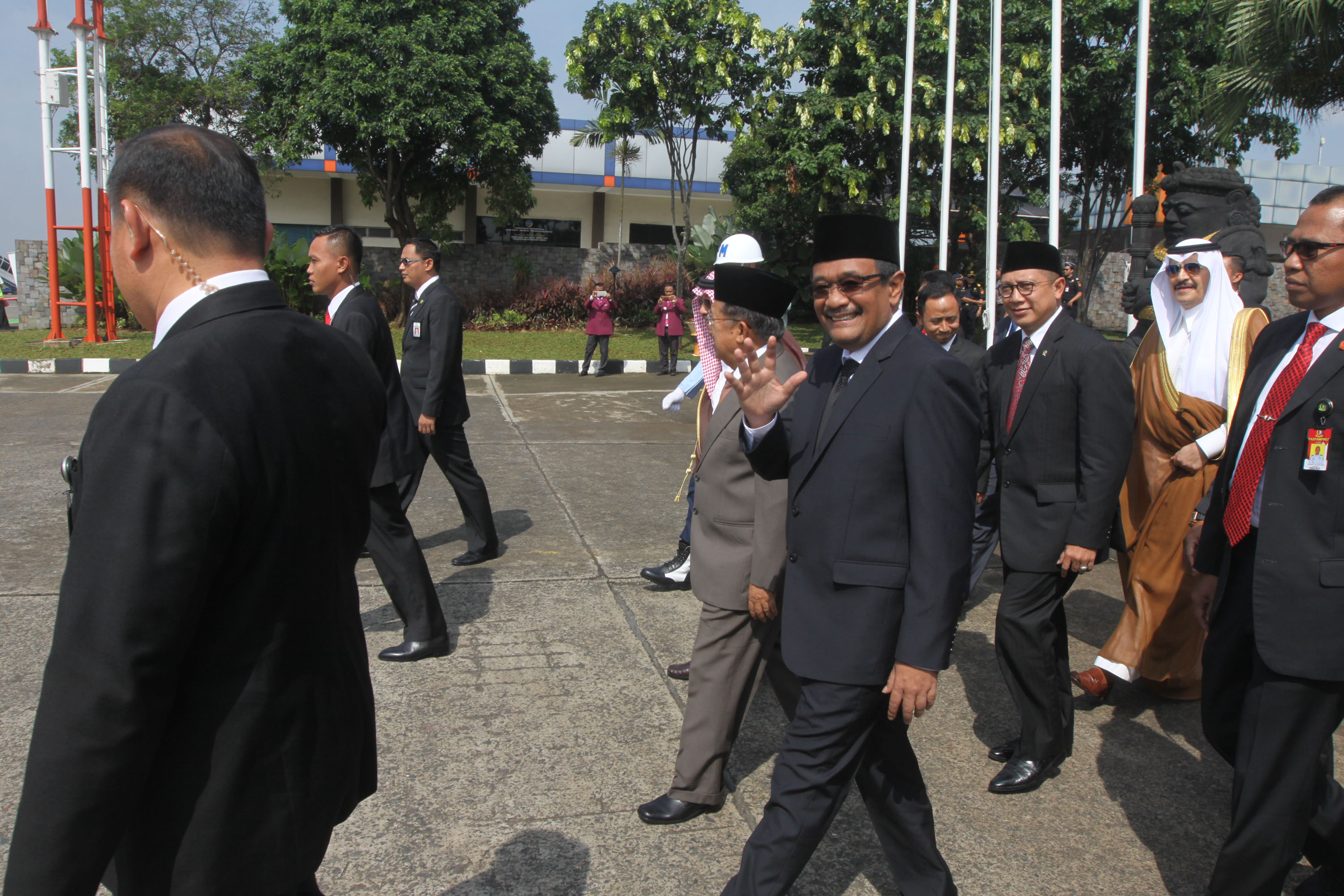 Raja Arab Saudi Salman bin Abdulaziz Al-Saud melambaikan tangan saat meninggalkan Indonesia dan bertolak menuju Brunei Darussalam di Bandara Halim Perdanakusumah, Jakarta Timur, Sabtu (4/3/2017). Kepergian rombongan Raja Salman diantar oleh Wakil Presiden Jusuf Kalla, Menteri Agama Lukman Hakim Saifuddin, dan Wakil Gubernur DKI Jakarta Djarot Saiful Hidayat. Sore nanti setelah kunjungan kenegaraan ke Brunei Darussalam, Raja Salman akan kembali ke Indonesia untuk berlibur selama enam hari di Bali. AKTUAL/Tino Oktaviano