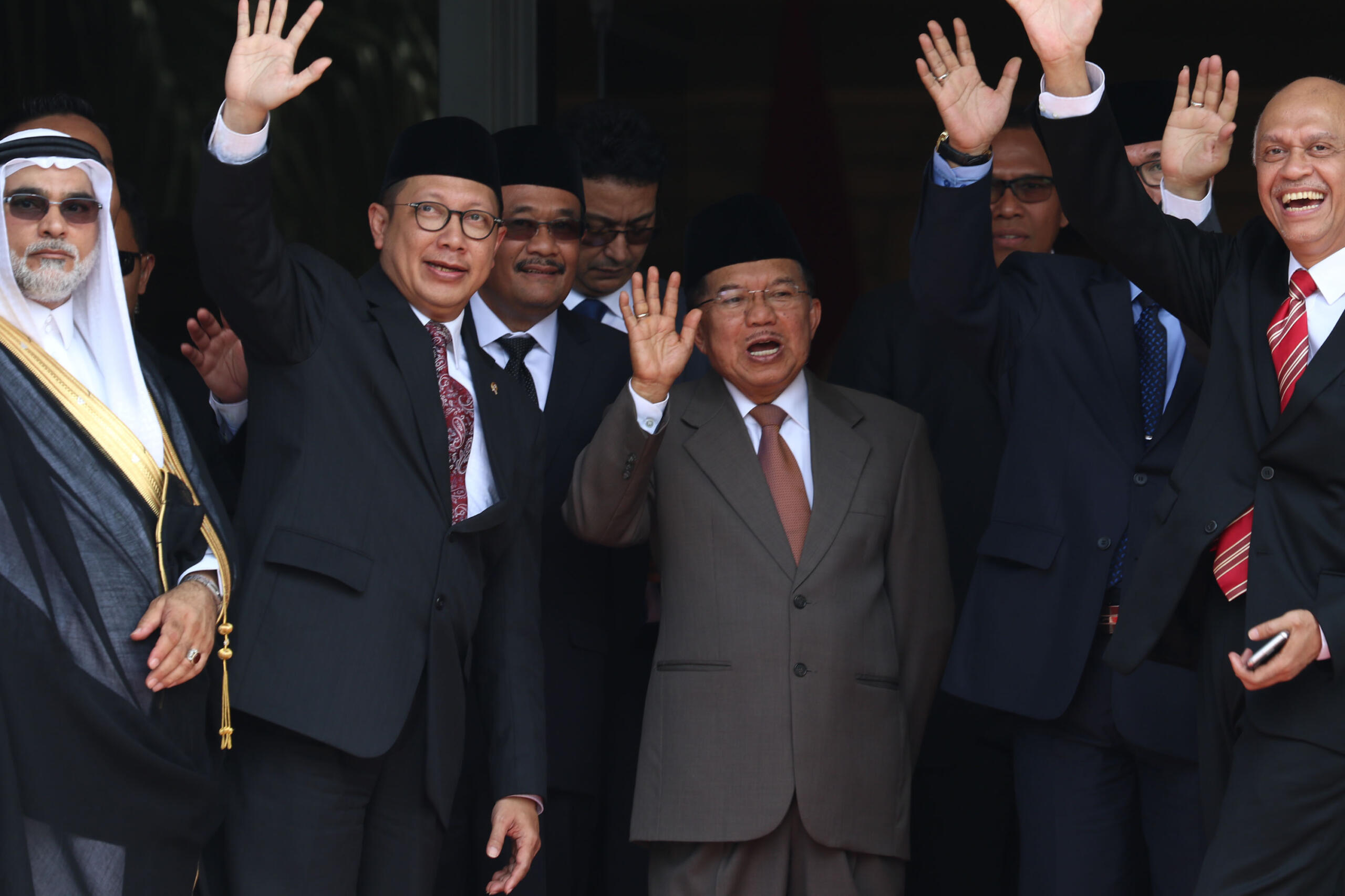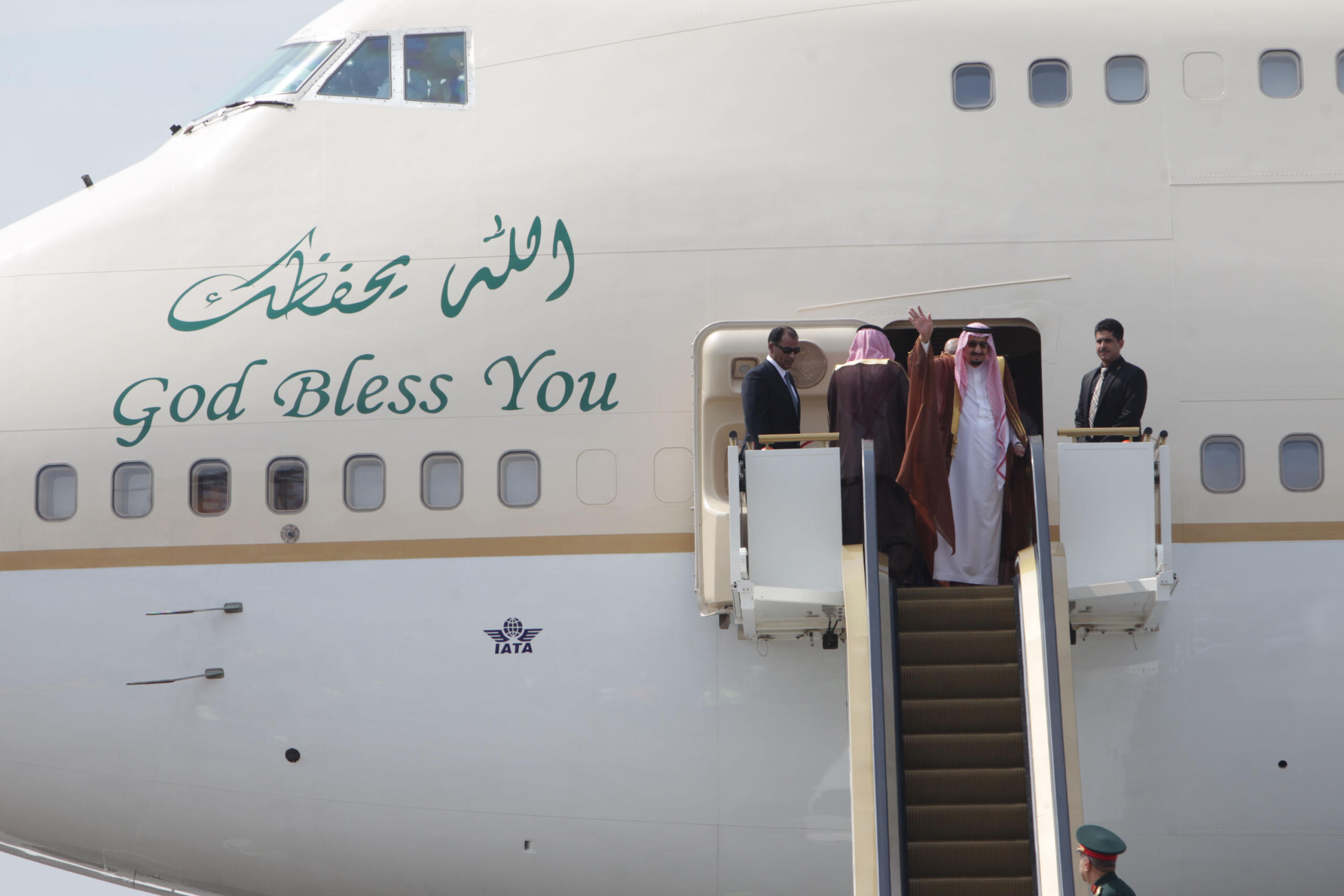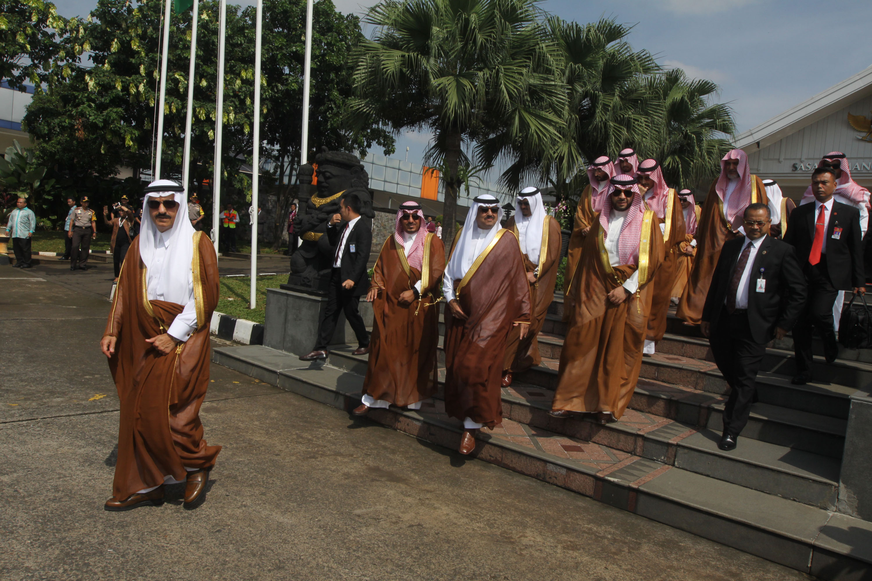 Raja Arab Saudi Salman bin Abdulaziz Al-Saud melambaikan tangan saat meninggalkan Indonesia dan bertolak menuju Brunei Darussalam di Bandara Halim Perdanakusumah, Jakarta Timur, Sabtu (4/3/2017). Kepergian rombongan Raja Salman diantar oleh Wakil Presiden Jusuf Kalla, Menteri Agama Lukman Hakim Saifuddin, dan Wakil Gubernur DKI Jakarta Djarot Saiful Hidayat. Sore nanti setelah kunjungan kenegaraan ke Brunei Darussalam, Raja Salman akan kembali ke Indonesia untuk berlibur selama enam hari di Bali. AKTUAL/Tino Oktaviano