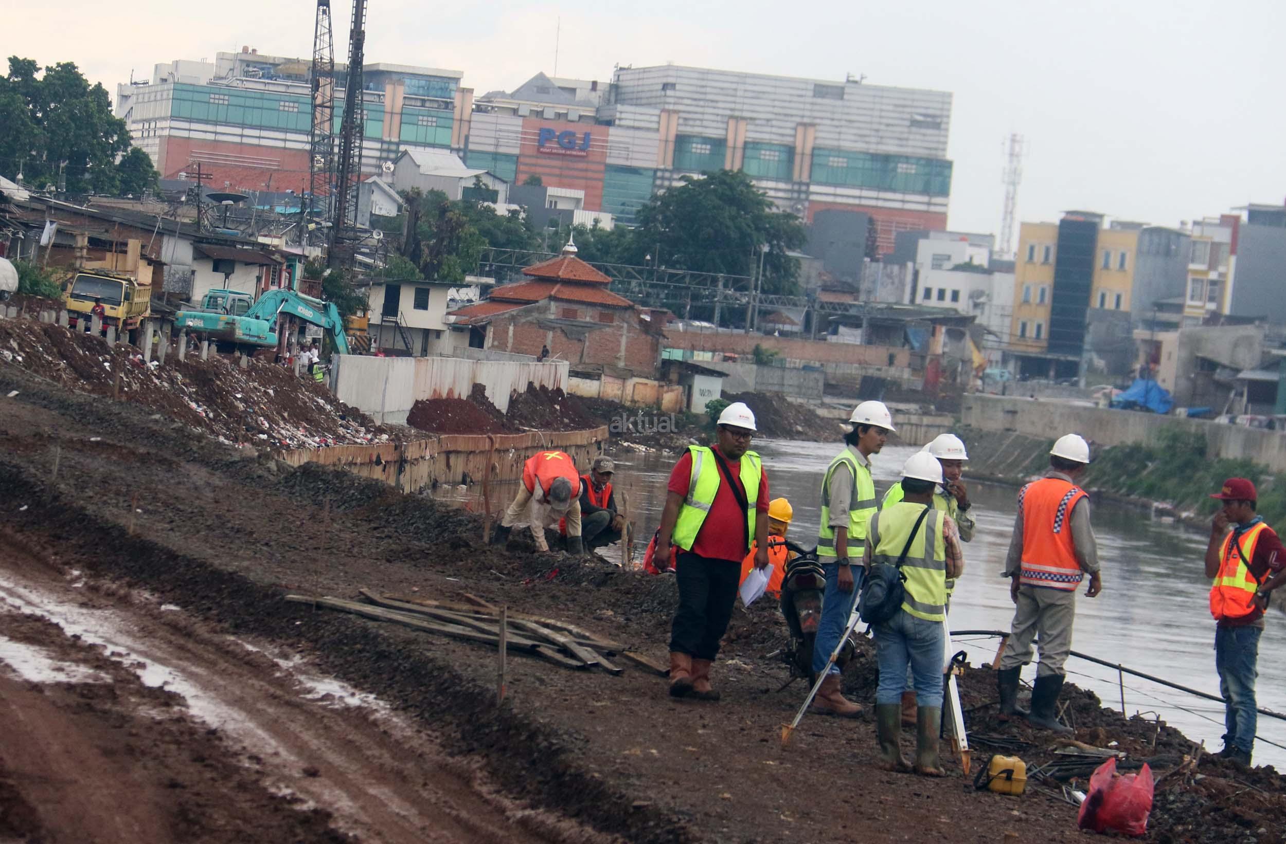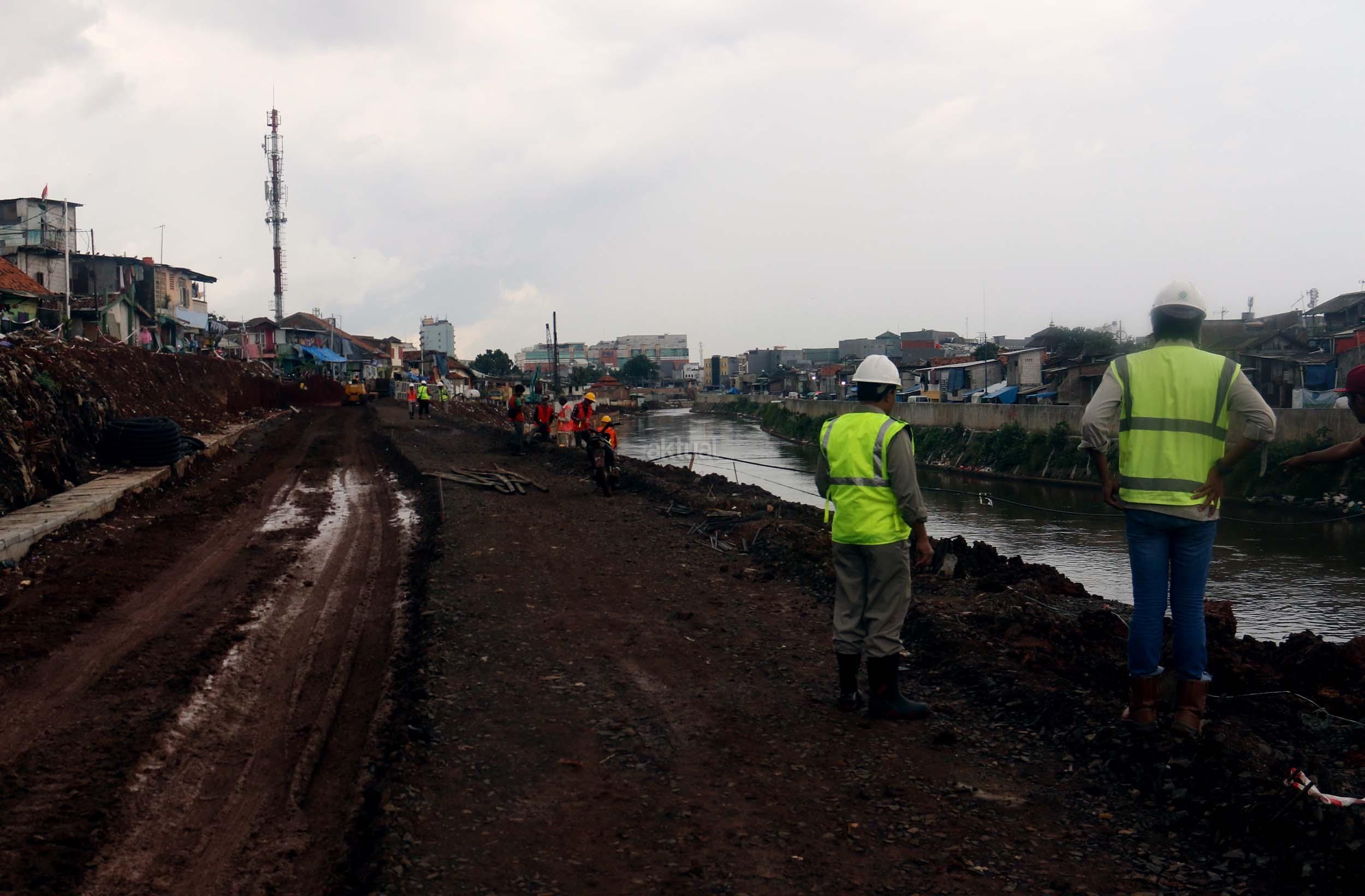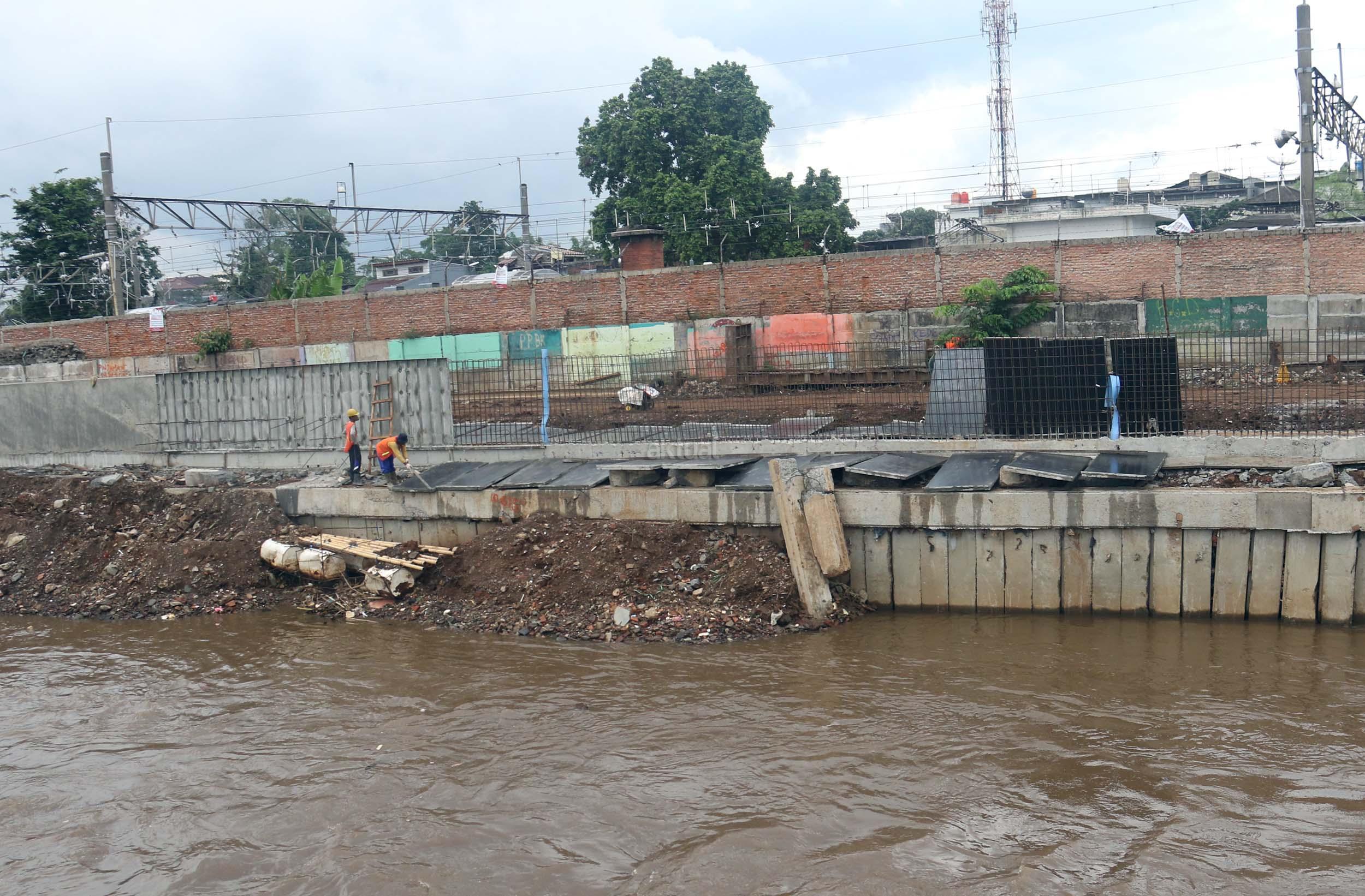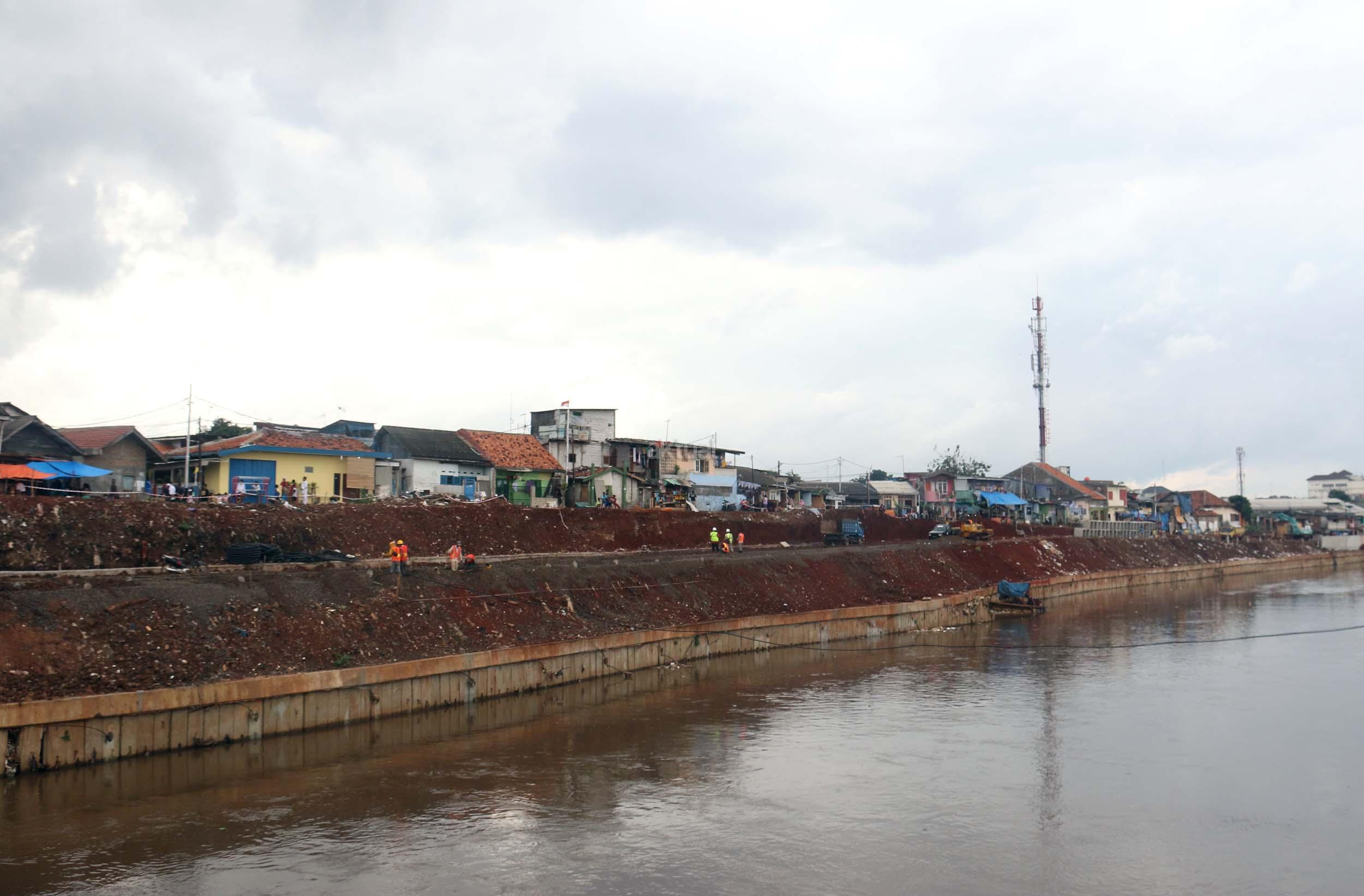 Pekerja menyelesaikan proyek pembangunan normalisasi Kali Ciliwung di Kelurahan Bukit Duri, Jakarta, Selasa (17/1/2017). Meski warga Kelurahan Bukit Duri yang terdampak penggusuran memenangkan gugatan di PTUN Jaksel, proyek tetap dilanjutkan. AKTUAL/Munzir
