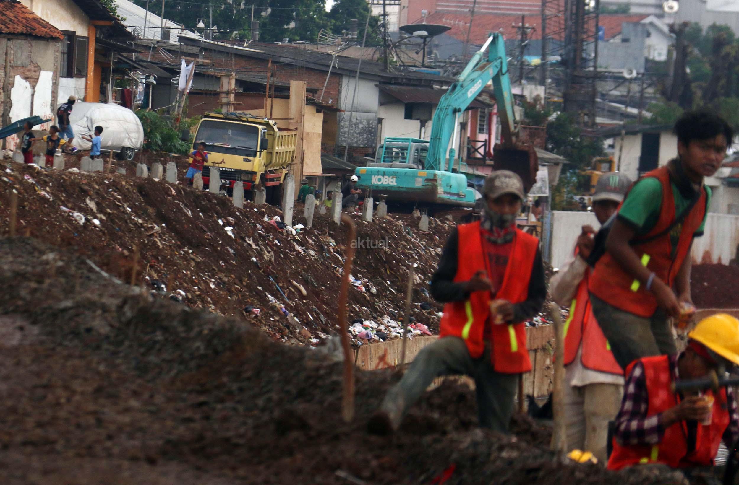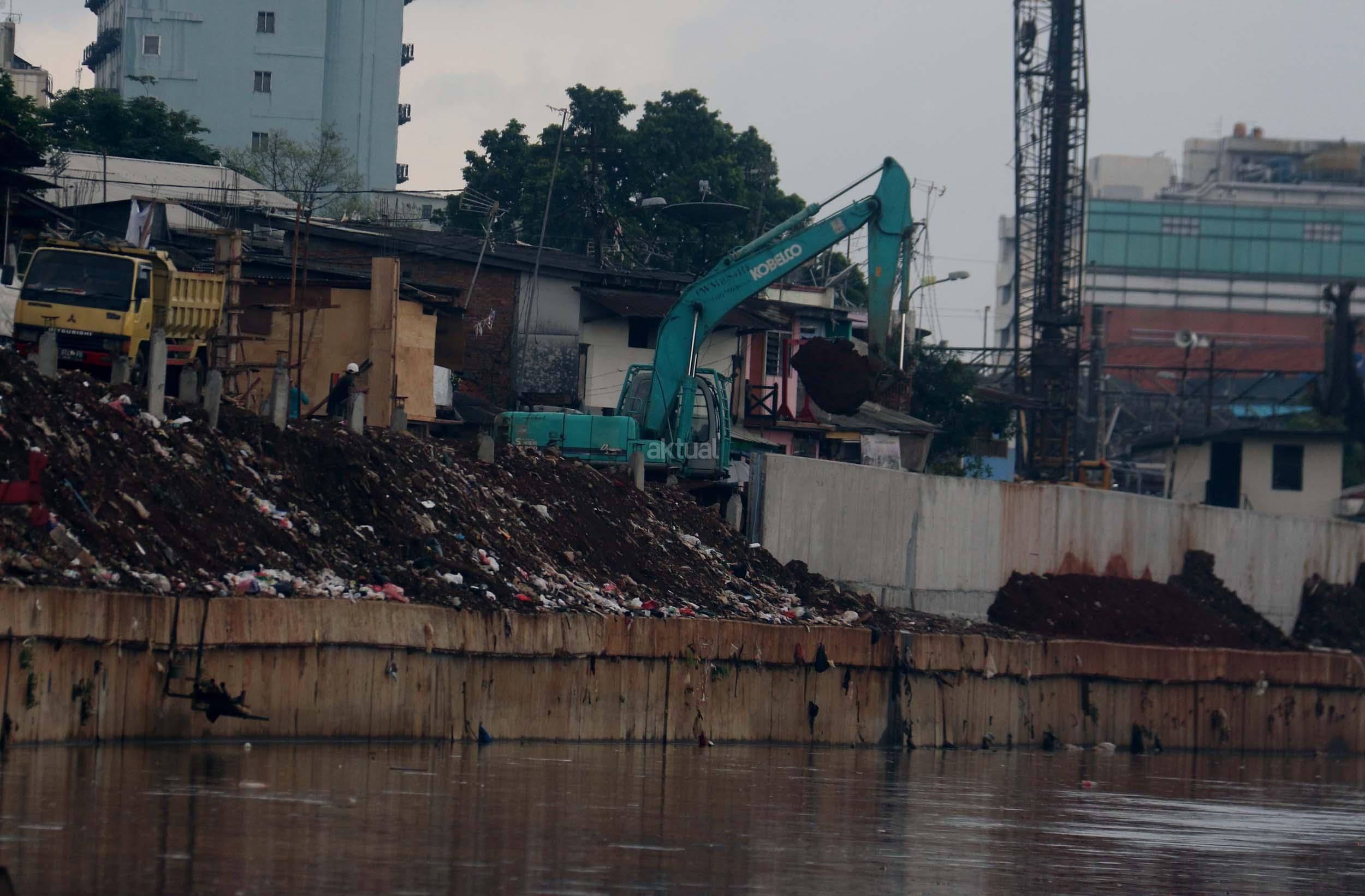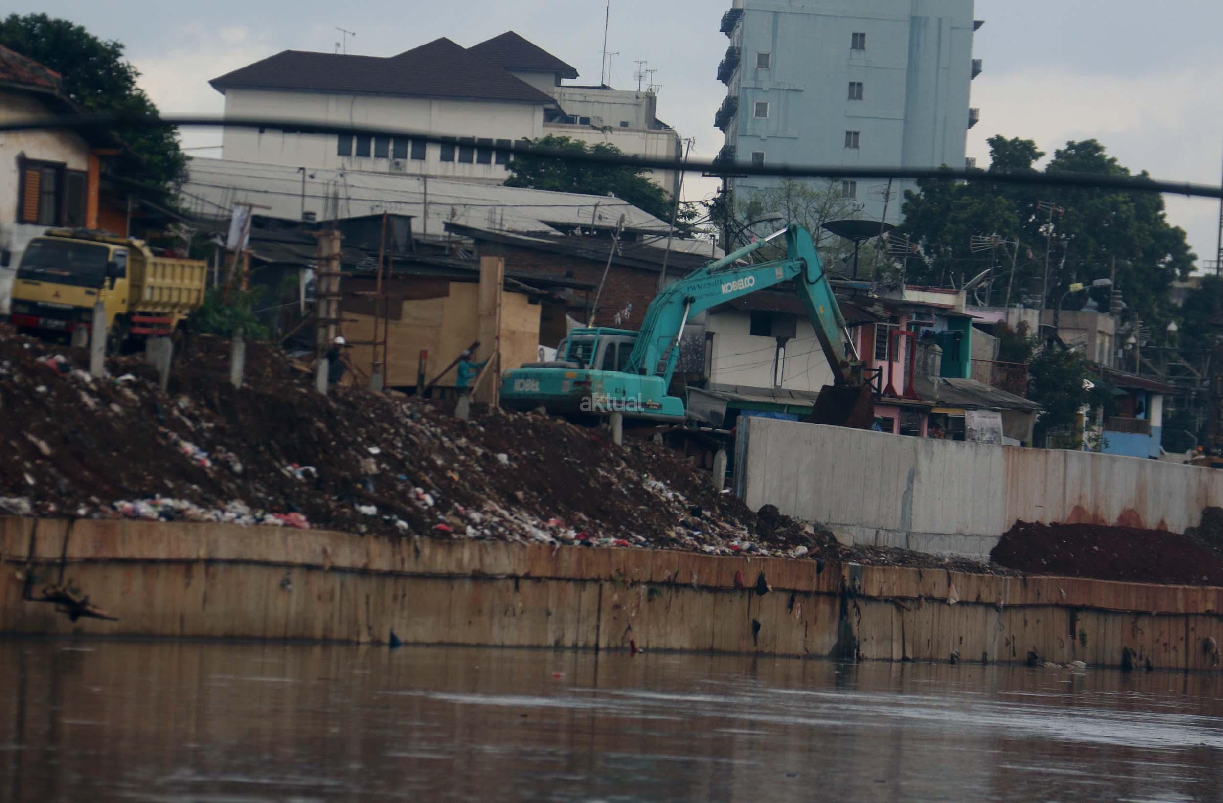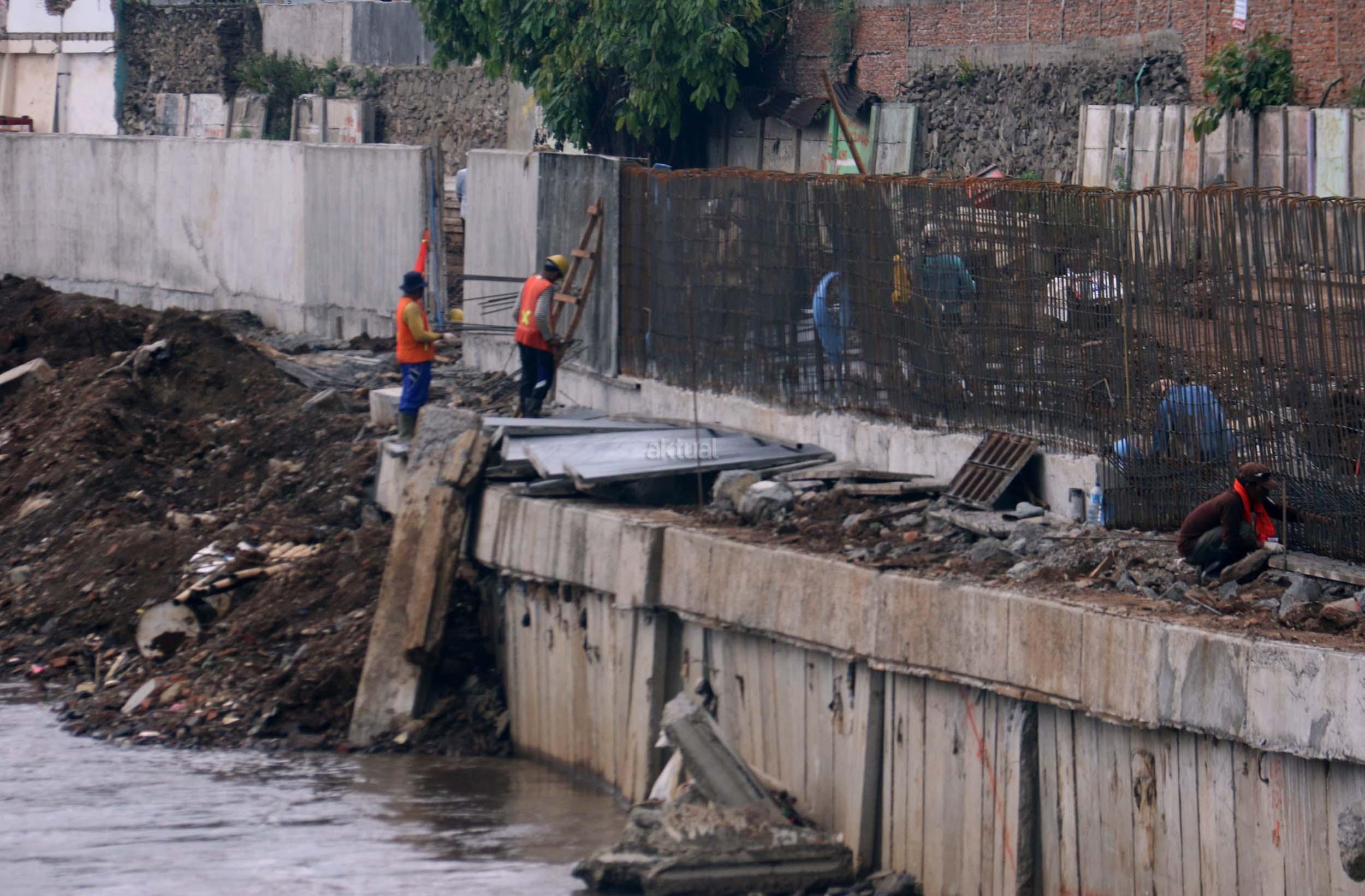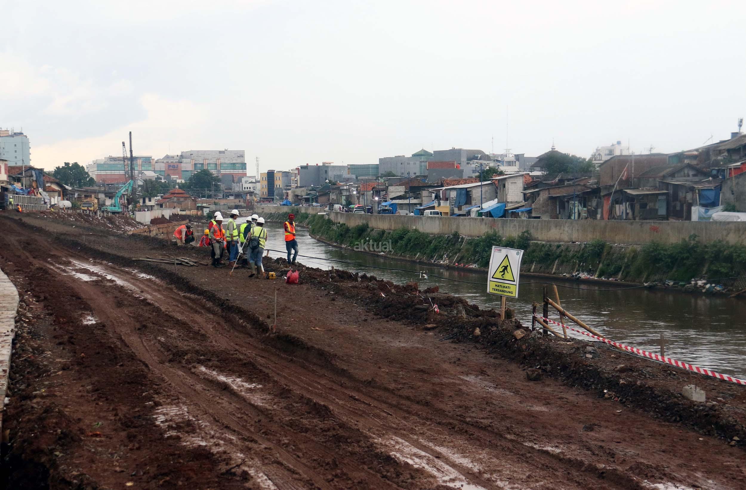 Pekerja menyelesaikan proyek pembangunan normalisasi Kali Ciliwung di Kelurahan Bukit Duri, Jakarta, Selasa (17/1/2017). Meski warga Kelurahan Bukit Duri yang terdampak penggusuran memenangkan gugatan di PTUN Jaksel, proyek tetap dilanjutkan. AKTUAL/Munzir