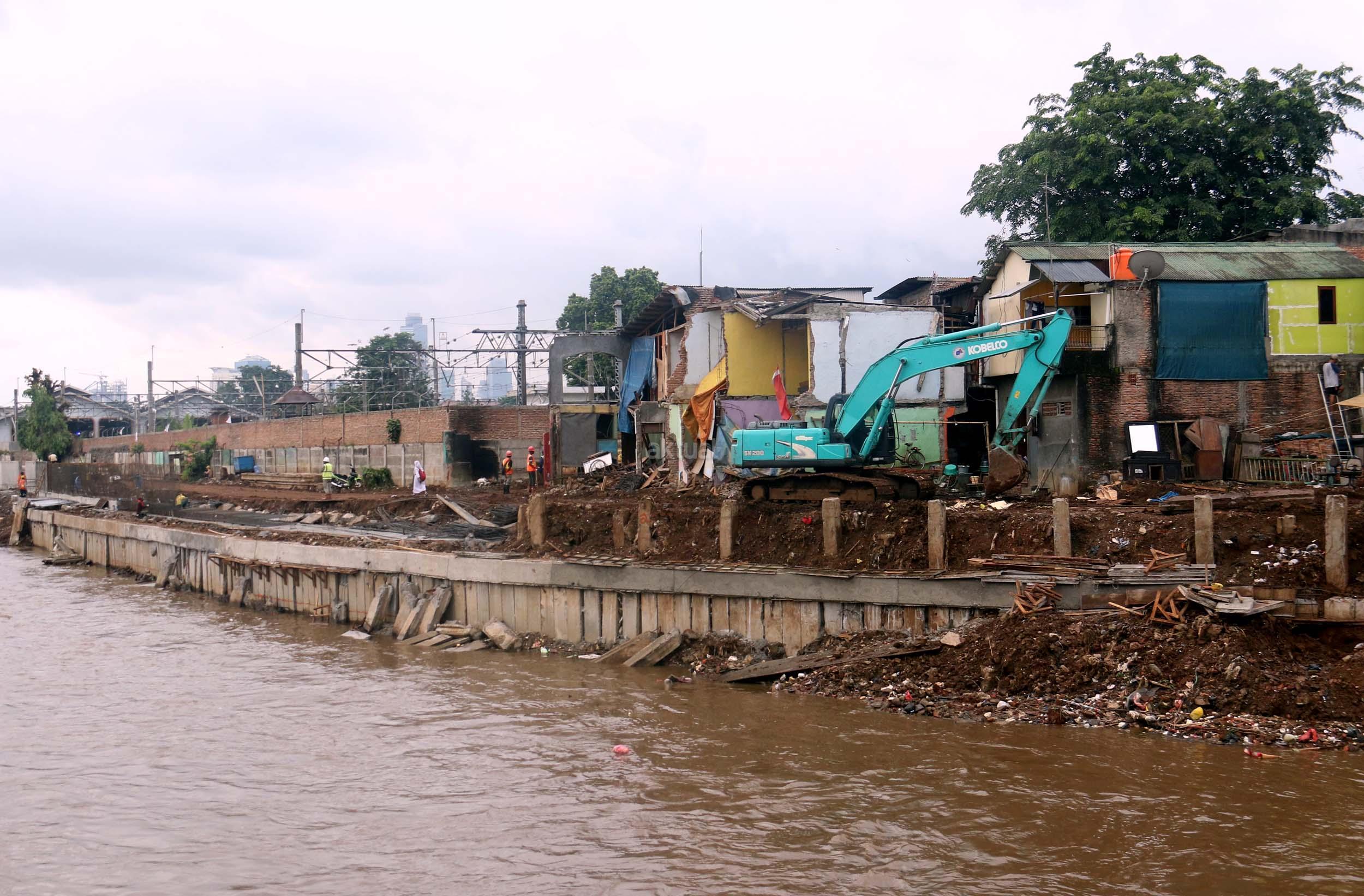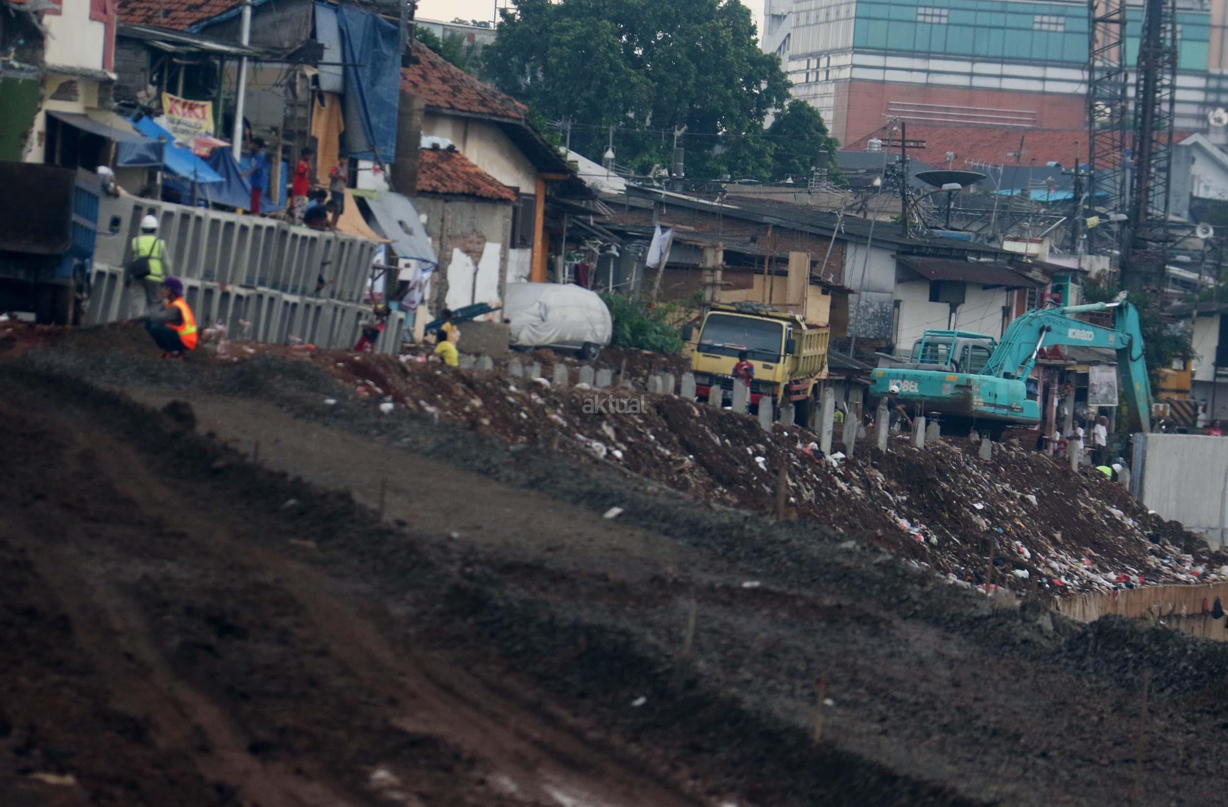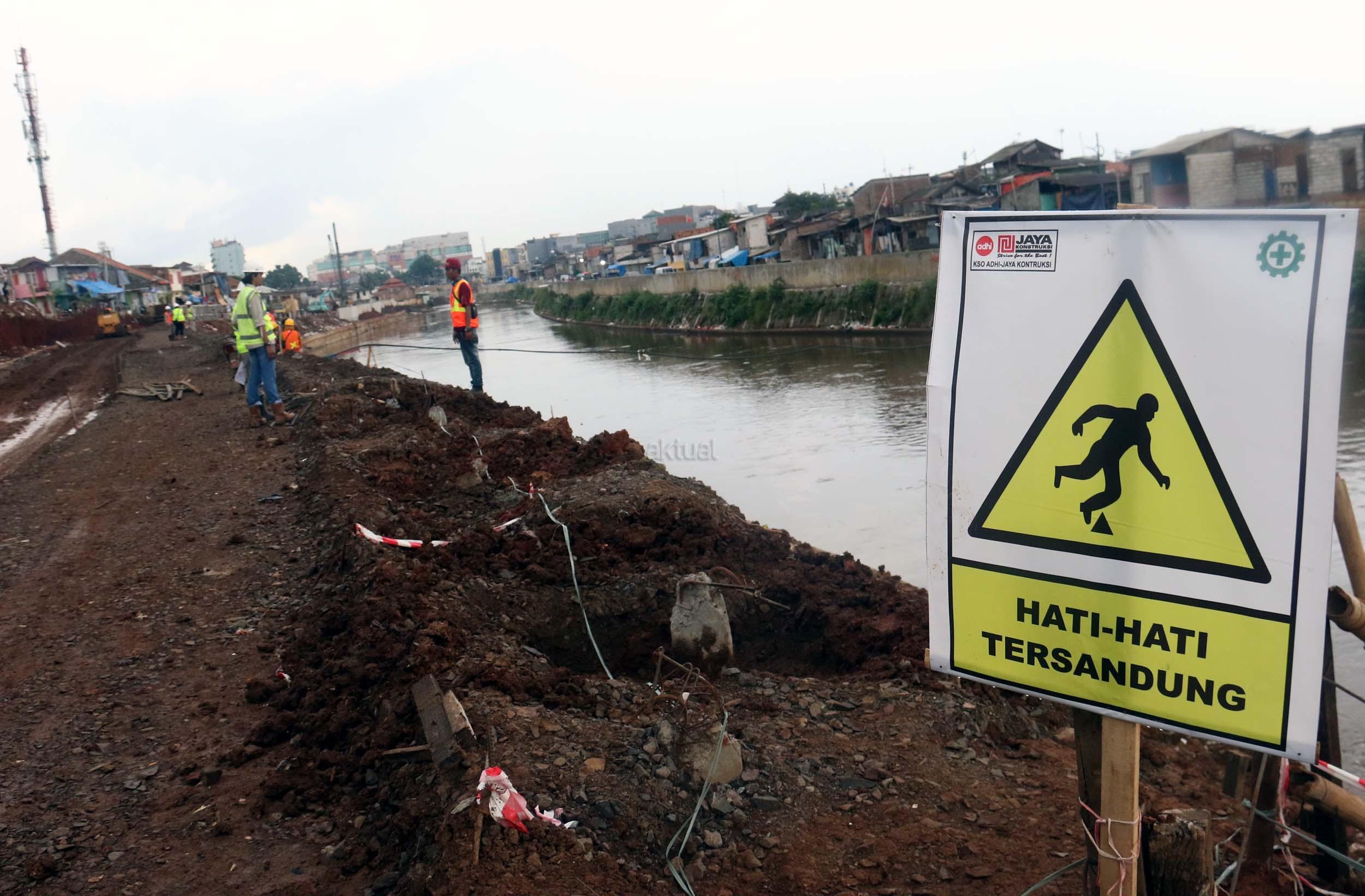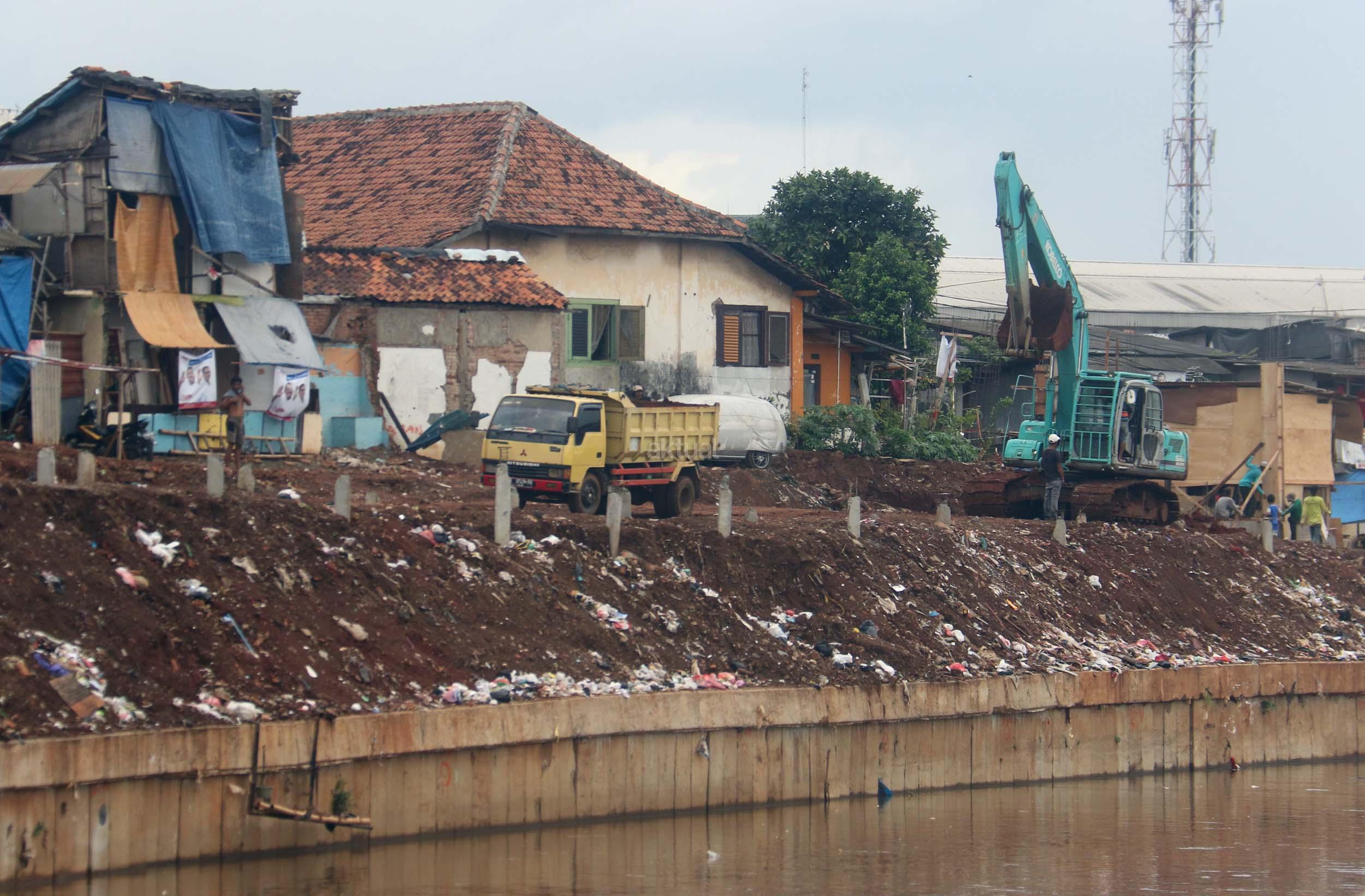 Pekerja menyelesaikan proyek pembangunan normalisasi Kali Ciliwung di Kelurahan Bukit Duri, Jakarta, Selasa (17/1/2017). Meski warga Kelurahan Bukit Duri yang terdampak penggusuran memenangkan gugatan di PTUN Jaksel, proyek tetap dilanjutkan. AKTUAL/Munzir