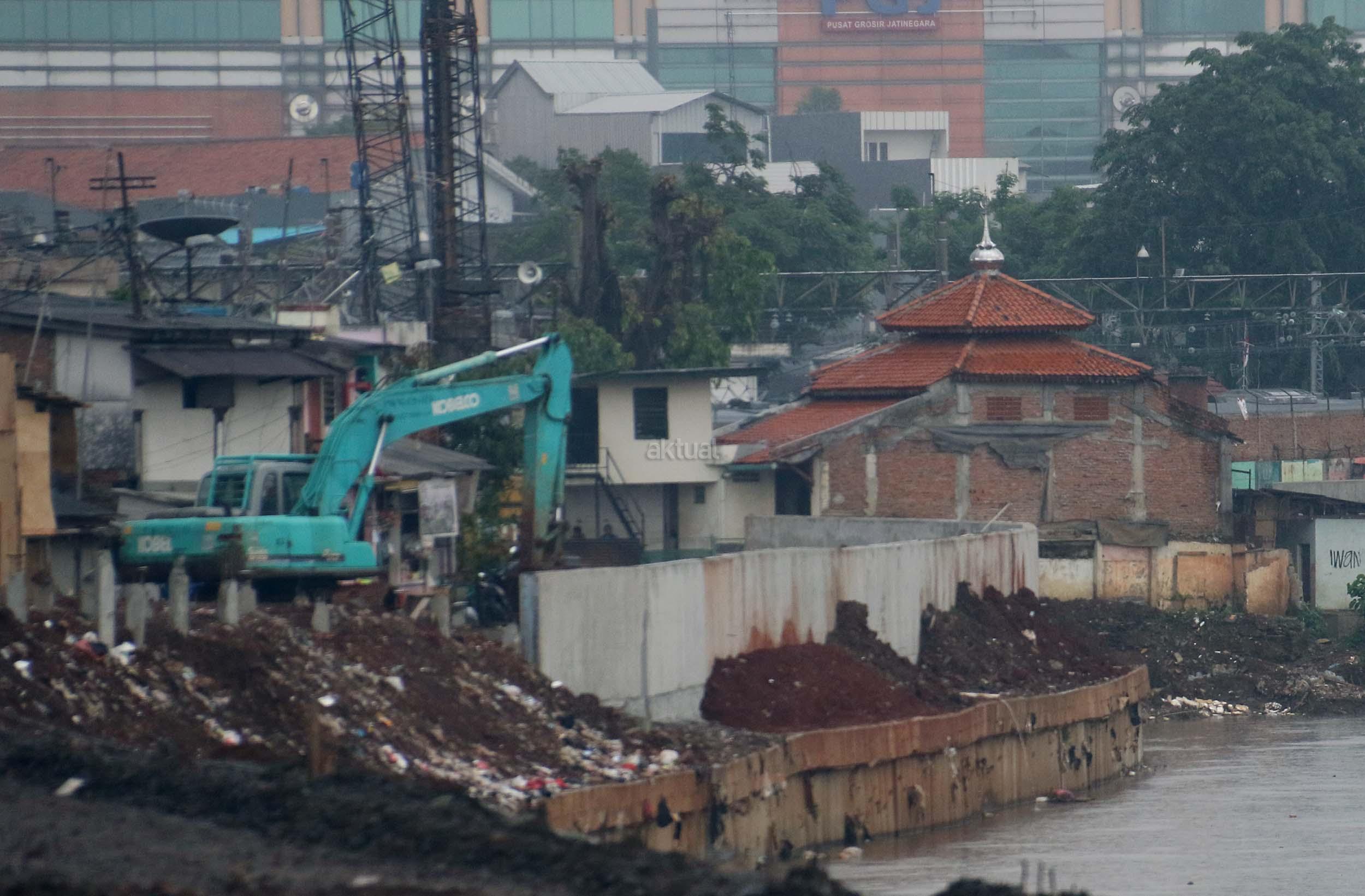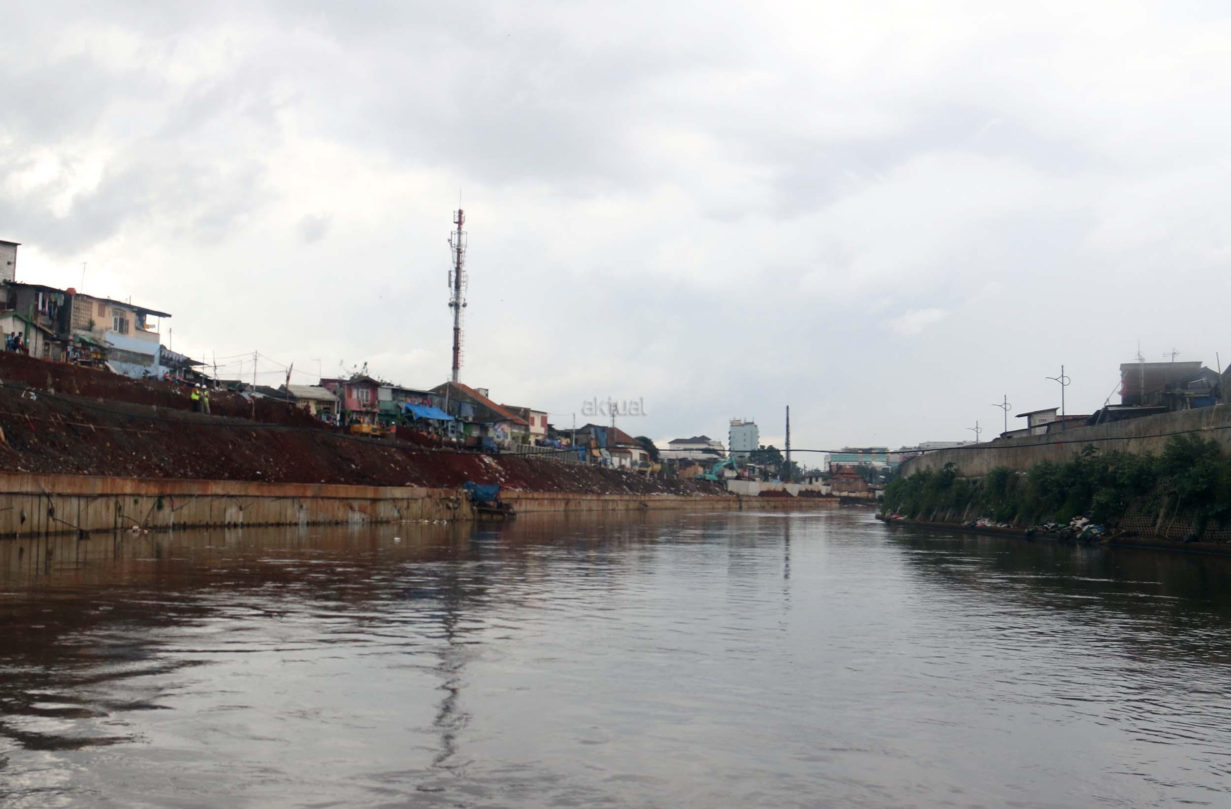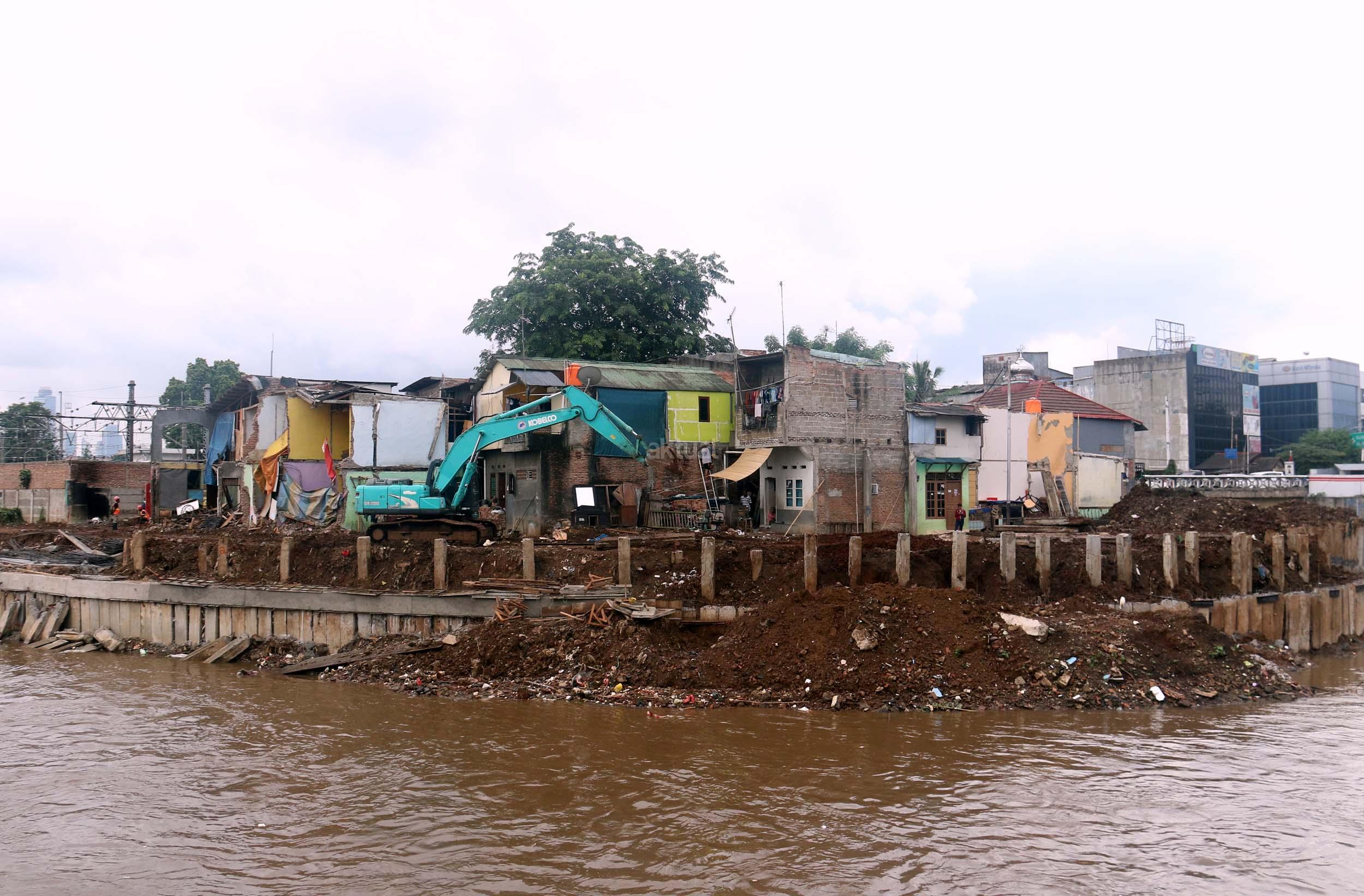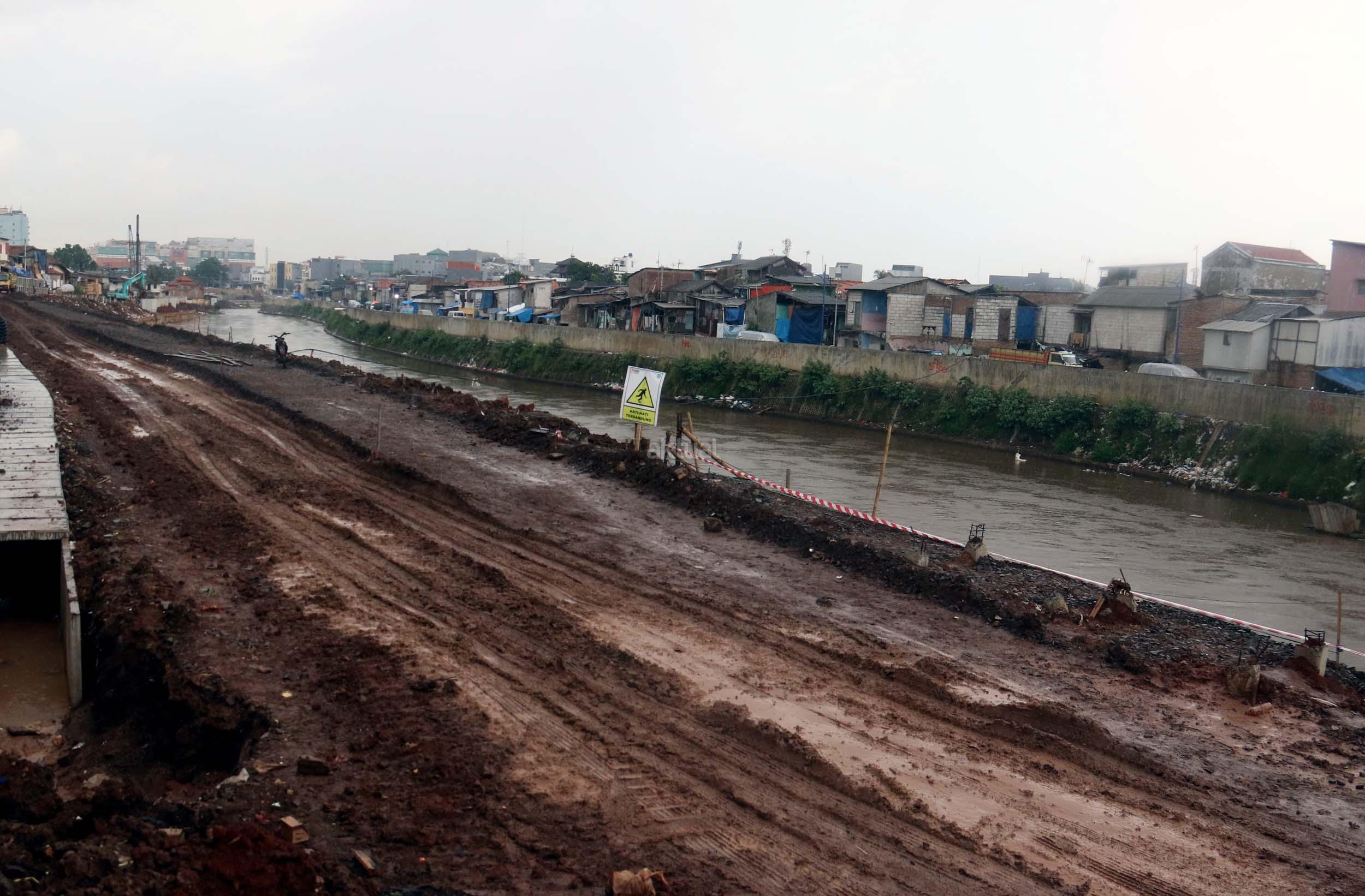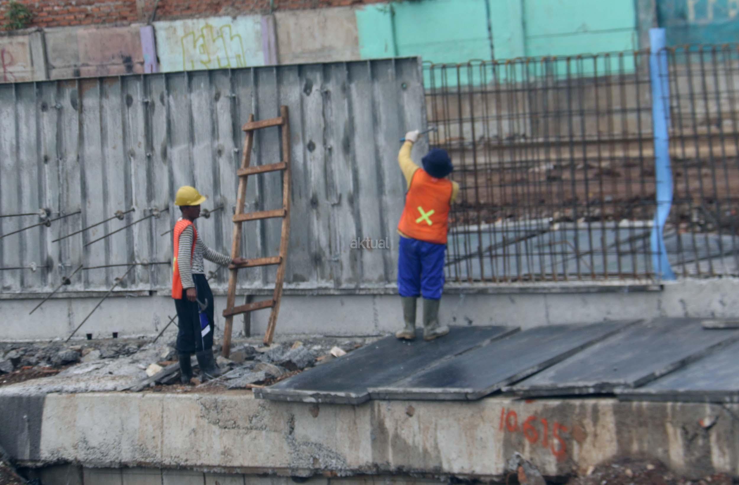 Pekerja menyelesaikan proyek pembangunan normalisasi Kali Ciliwung di Kelurahan Bukit Duri, Jakarta, Selasa (17/1/2017). Meski warga Kelurahan Bukit Duri yang terdampak penggusuran memenangkan gugatan di PTUN Jaksel, proyek tetap dilanjutkan. AKTUAL/Munzir