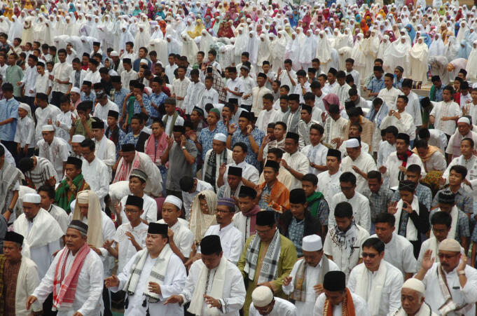 Ribuan umat muslim melaksanakan salat minta hujan (Istisqa) di Alun-alun Ciamis, Jawa Barat, Kamis (10/9). Salat Istisqa guna memohon diturunkannya hujan di kawasan tersebut karena lahan pertanian yang mengering di Ciamis mencapai 5.000 hektar dimana 1.500 hektar dilanda puso. ANTARA FOTO/Adeng Bustomi/aww/15.