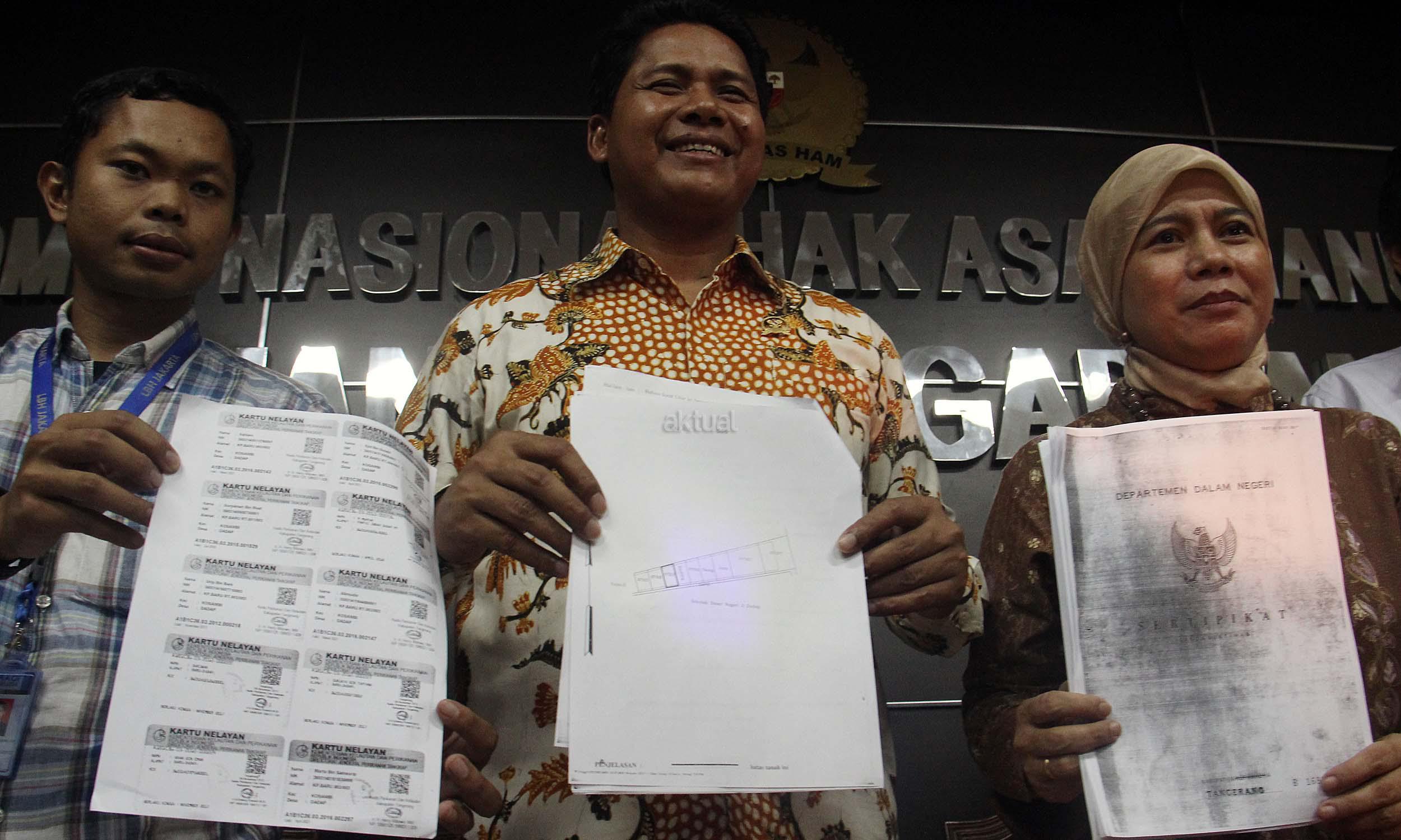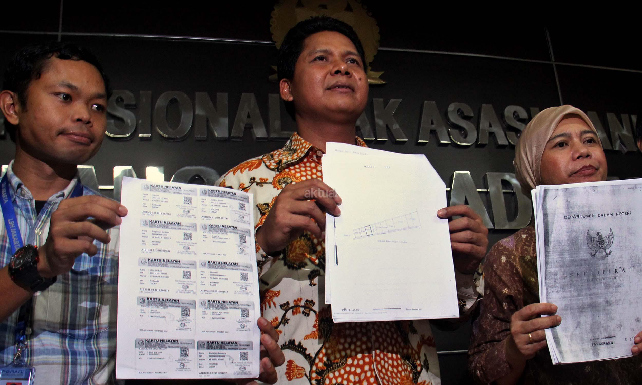 Pengacara warga Dadap Tigor Hutapea (kiri),Komisioner Komnas HAM Imadudin Rahmat (tengah), Komisioner Komnas HAM Imadudin Roichatul Aswidah menunjukan kepemilikan tanah secara legal warga Dadap, Kosambi Tangerang. di kantor Komnas HAM, Jakarta, Minggu (23/5/2016). Komnas HAM mengaku akan mengambil sejumlah tindakan. Selain mengirimkan surat kepada Pemkab dan Bupati Tangerang, Komnas HAM juga meminta klarifikasi dan penjelasan dari Pemkab.