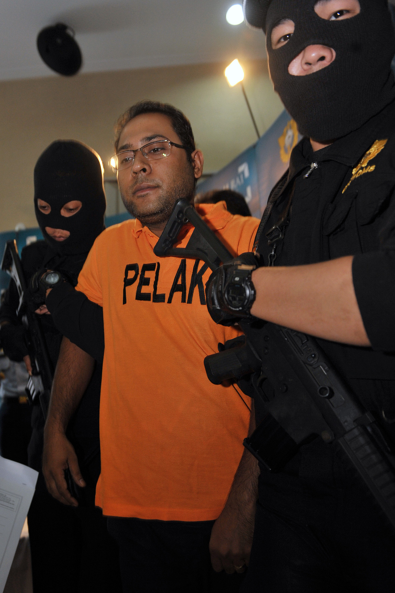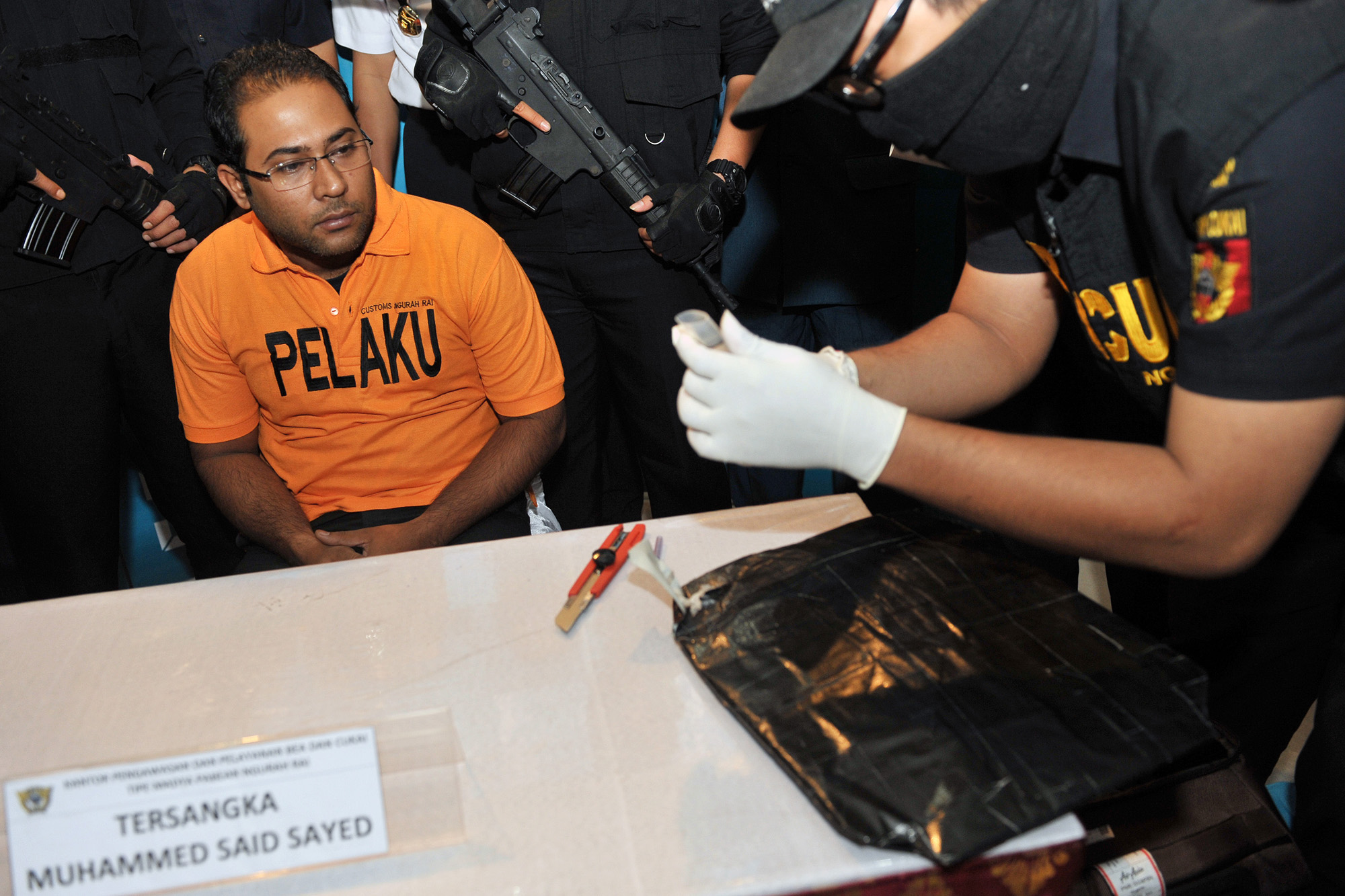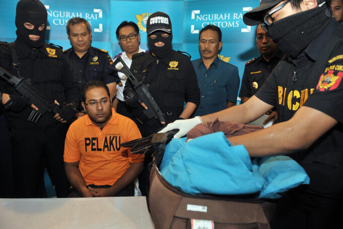 Warga India Mohammed Said Sayed (tengah) digiring petugas bea cukai saat pengungkapan kasus penyelundupan narkoba di Kantor Bea Cukai Bandara Ngurah Rai, Denpasar, Selasa (8/9). Warga India yang menempuh penerbangan Bangkok-Denpasar dengan Air Asia QZ521 itu ditangkap petugas Bea Cukai Bandara Ngurah Rai karena berupaya menyelundupkan 1,5 Kg sabu-sabu dengan cara disembunyikan di dinding tas bawaannya. FOTO ANTARA/Nyoman Budhiana/aww/15.