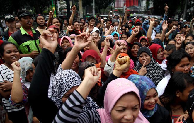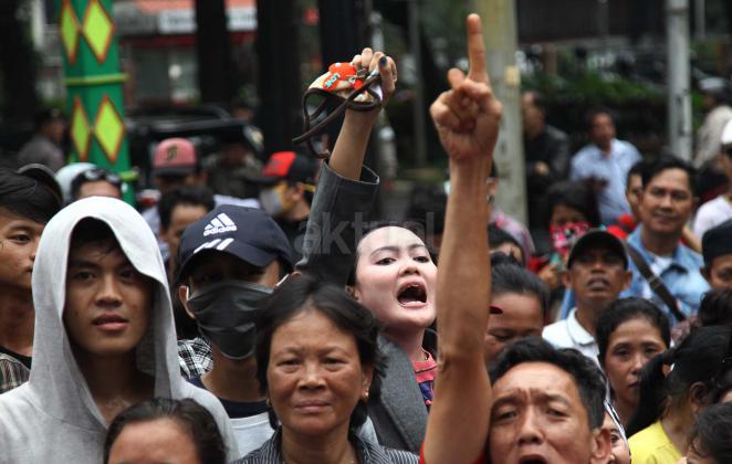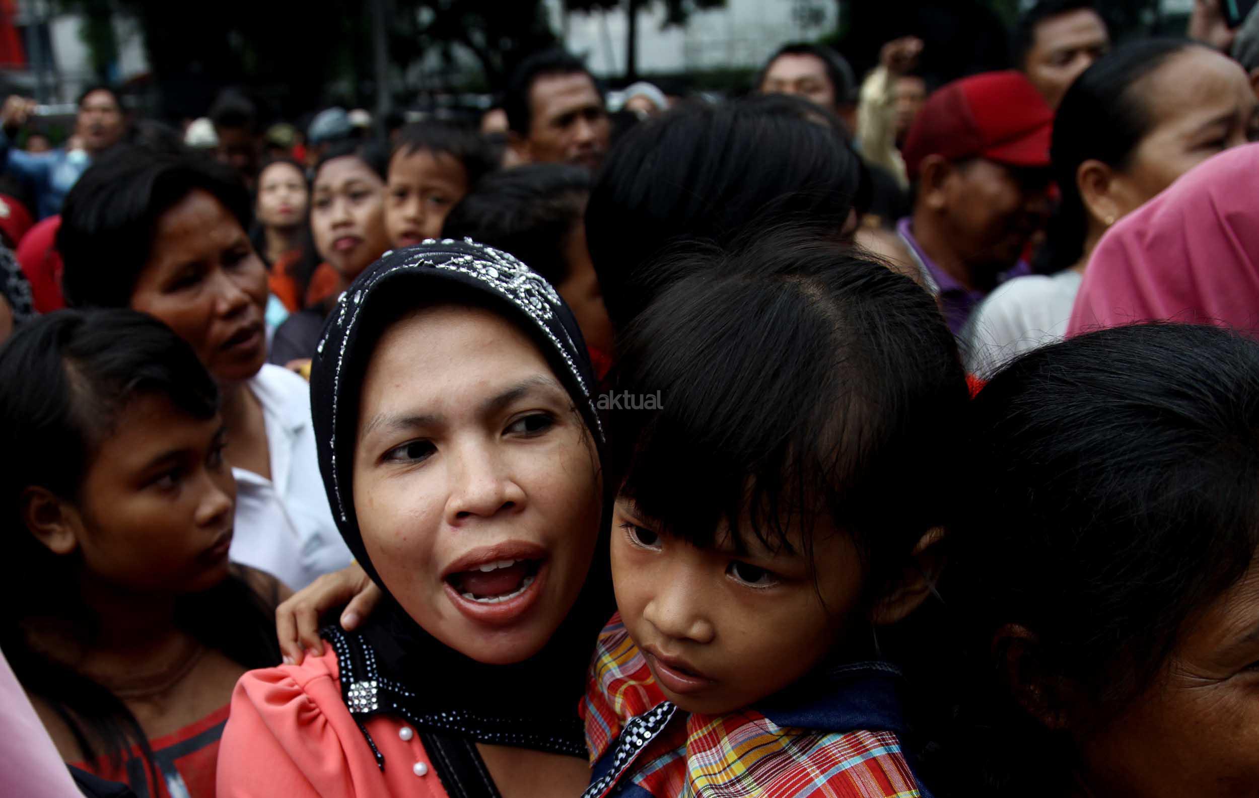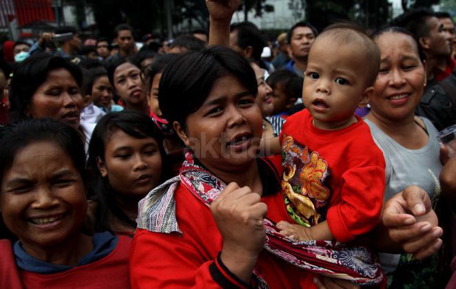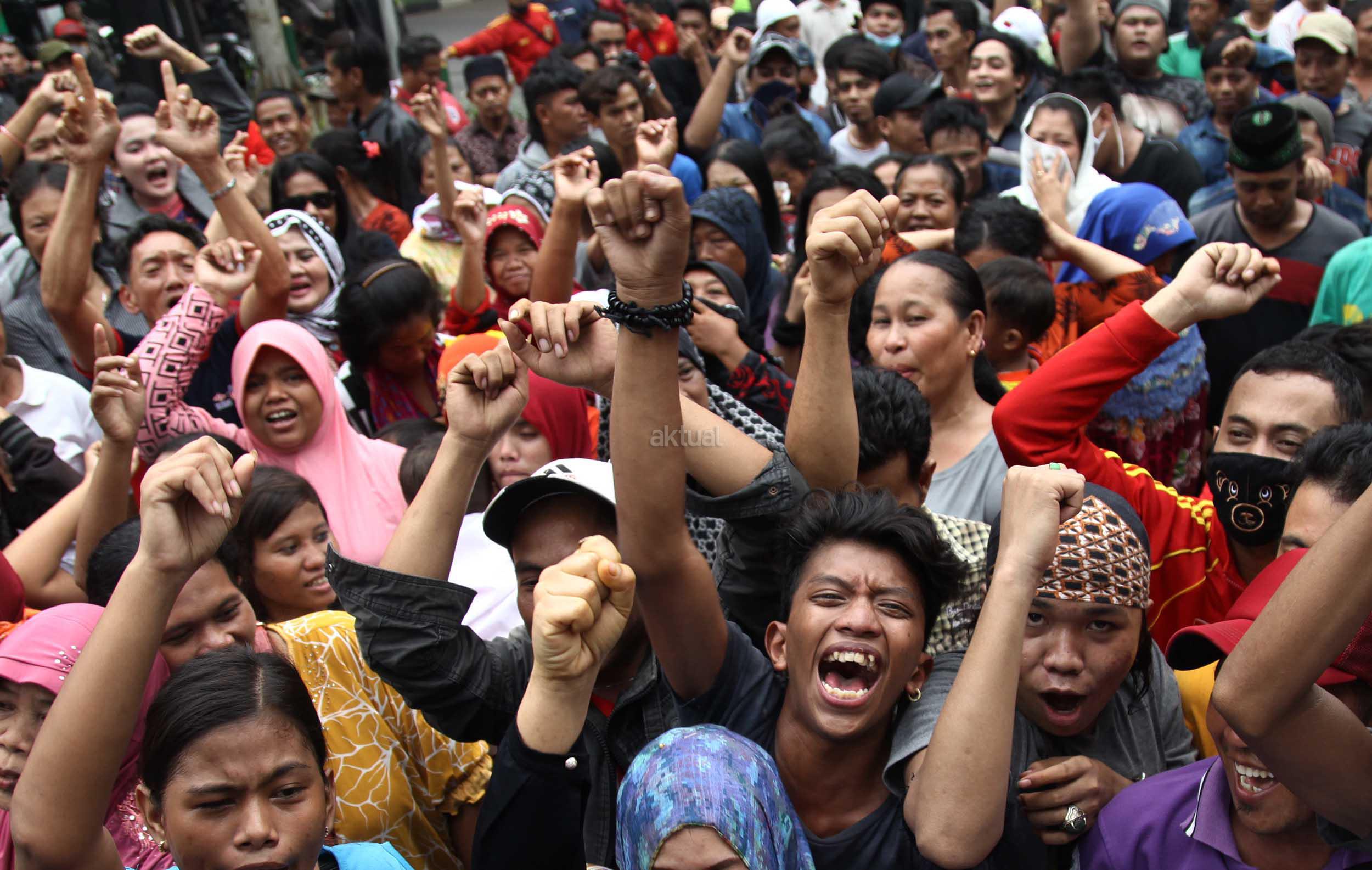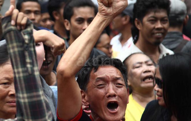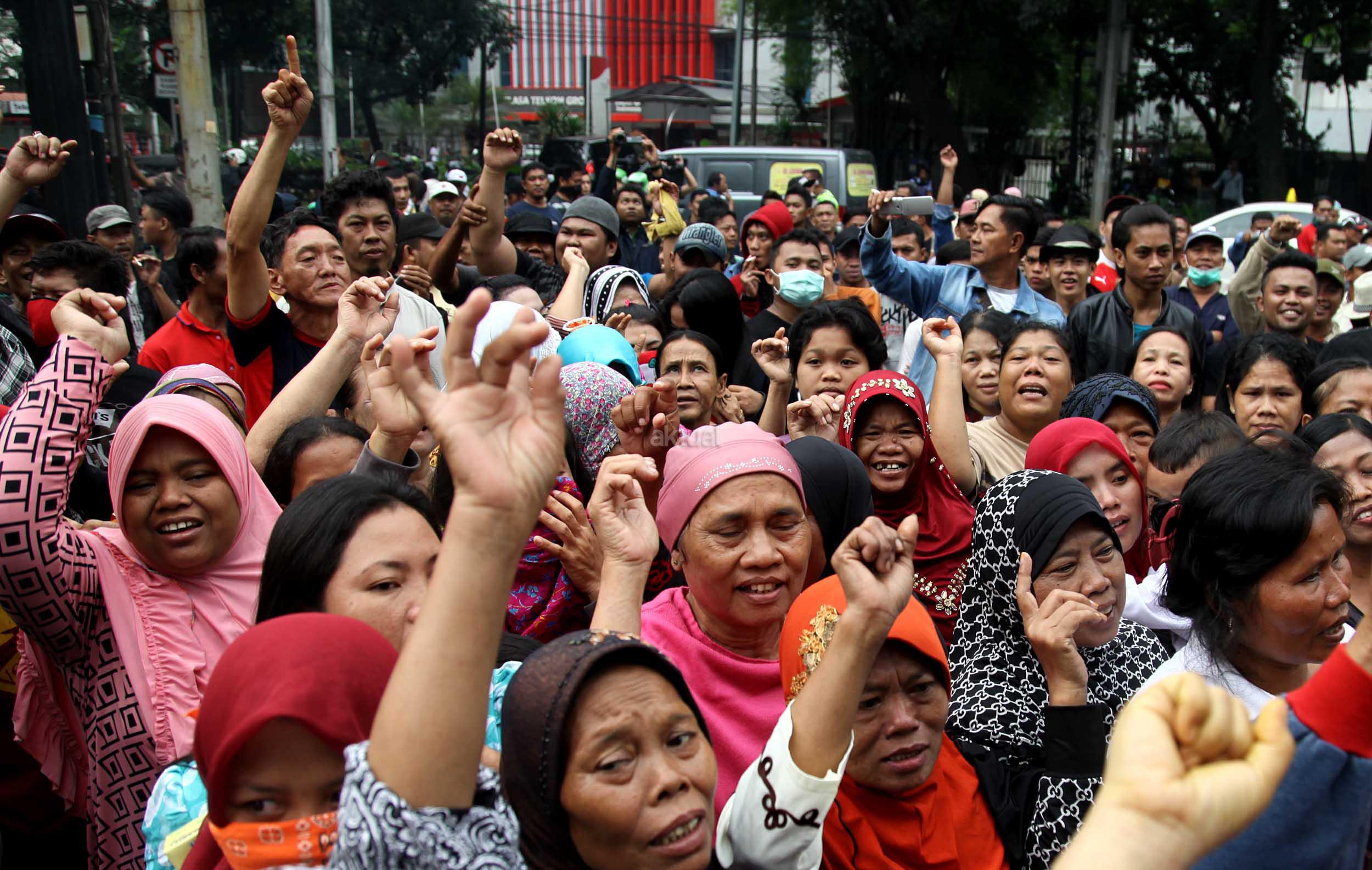 Ratusan warga Kalijodo melakukan aksi demontrasi depan kantor DPRD DKI,Jalan Kebon Sirih, Jakarta Pusat, Jumat (19/2/2016). Dalam aksinya ratusan warga Kalijodo menuntut ganti rugi lahan dan bangunan yang telah mereka tinggali berpuluh tahun itu yang hendak disulap Ahok untuk ruang terbuka hijau sesuai peruntukannya.