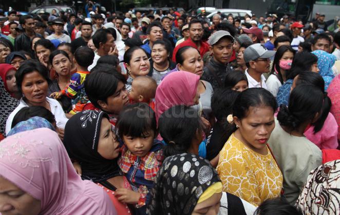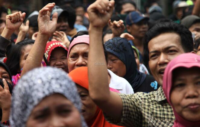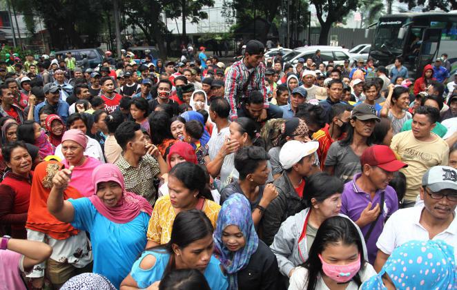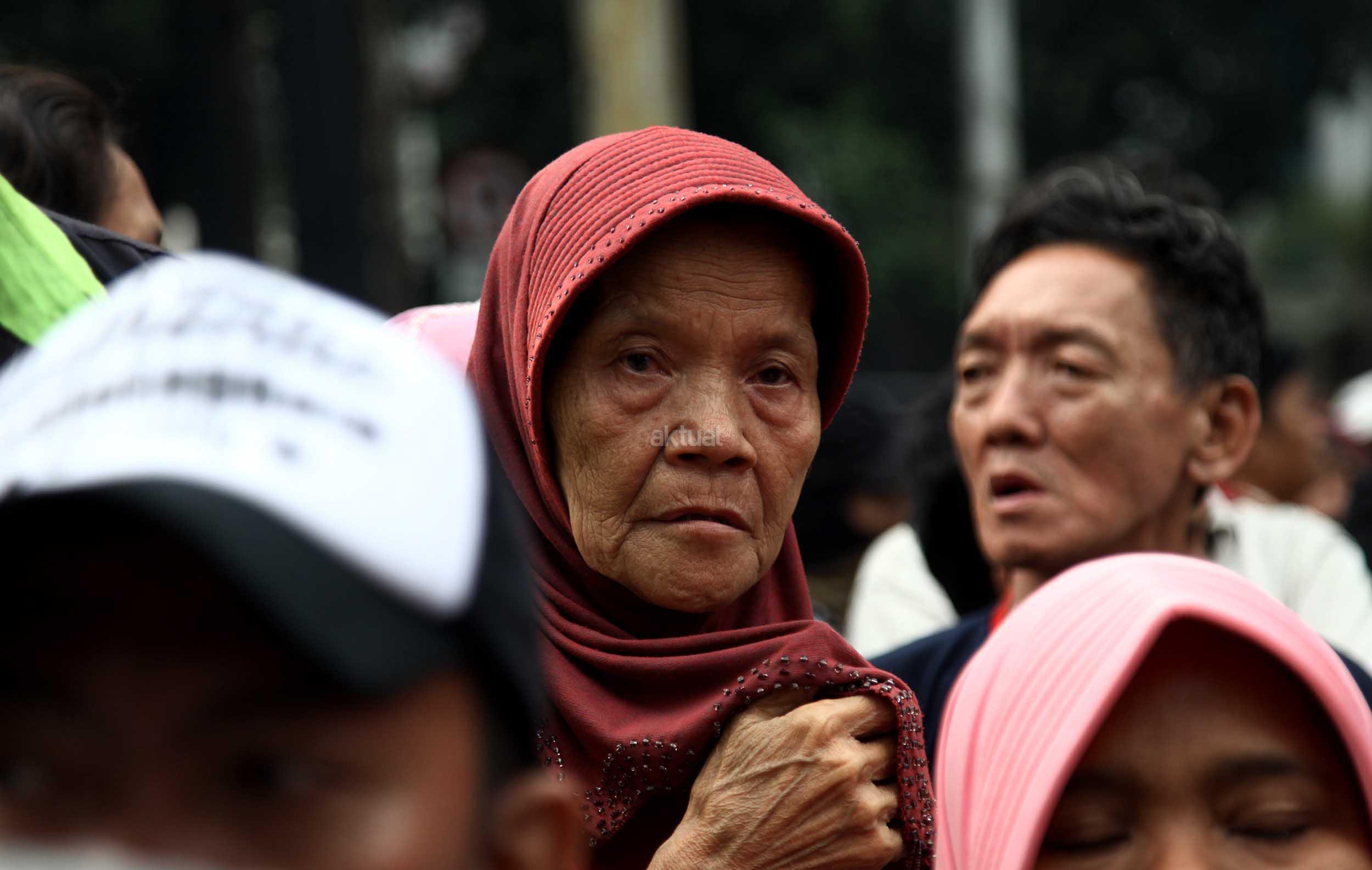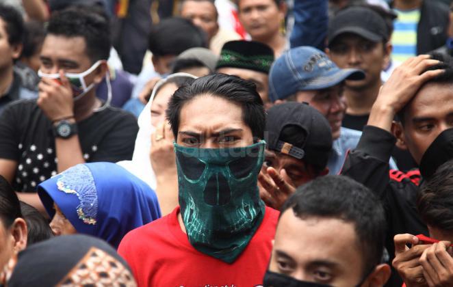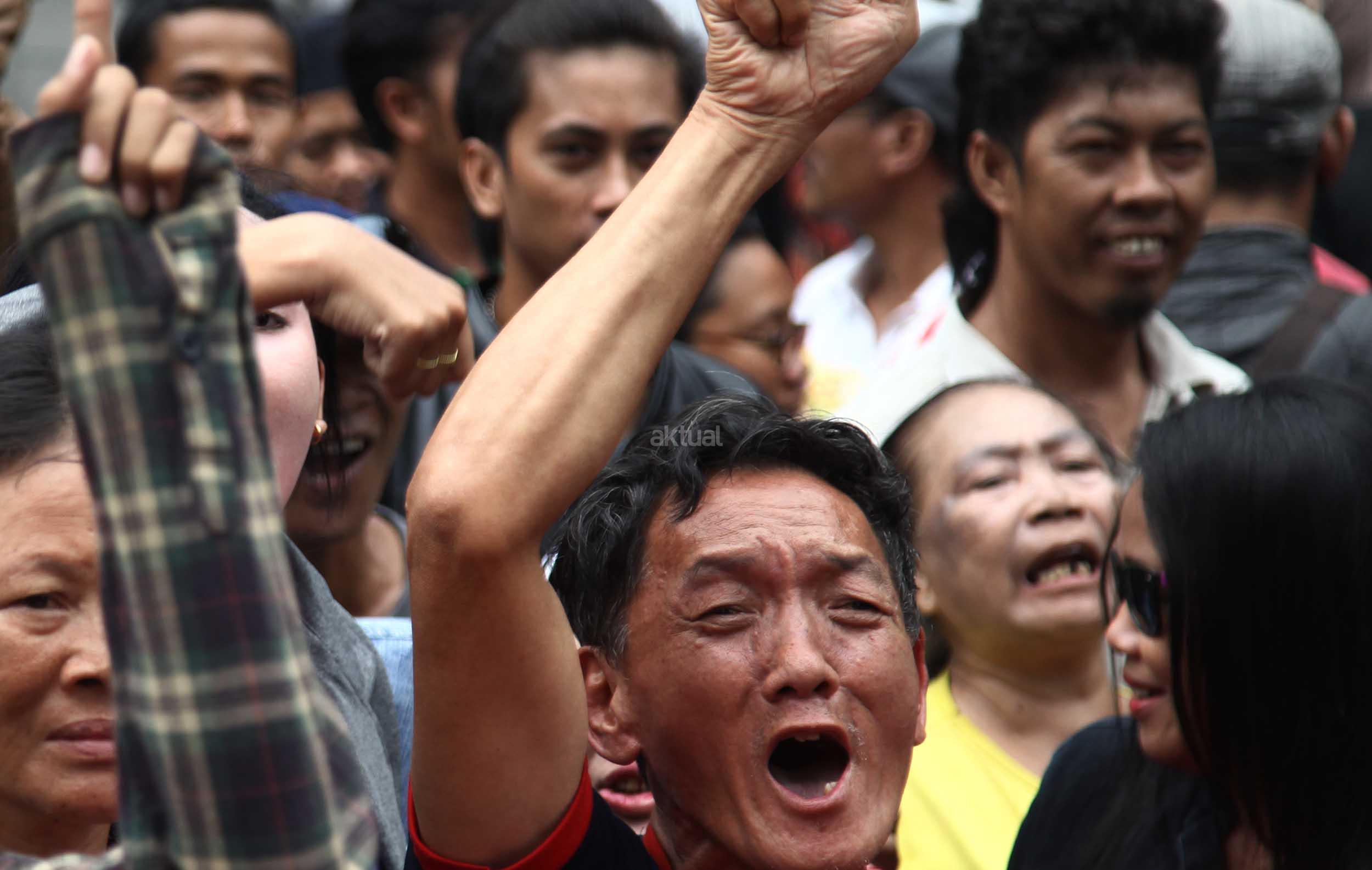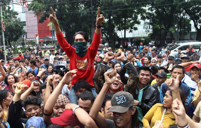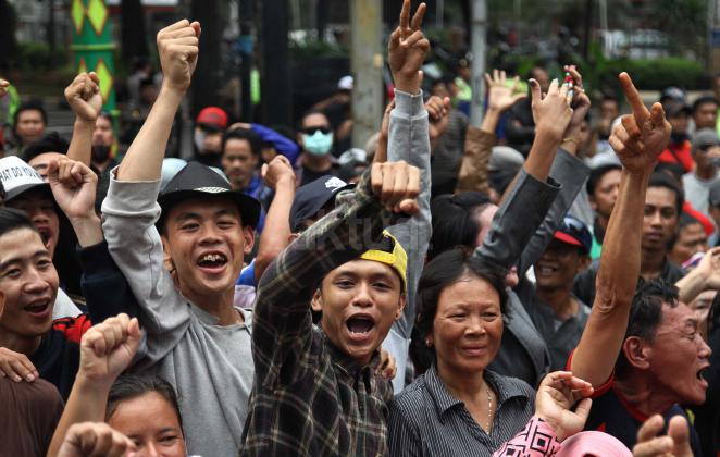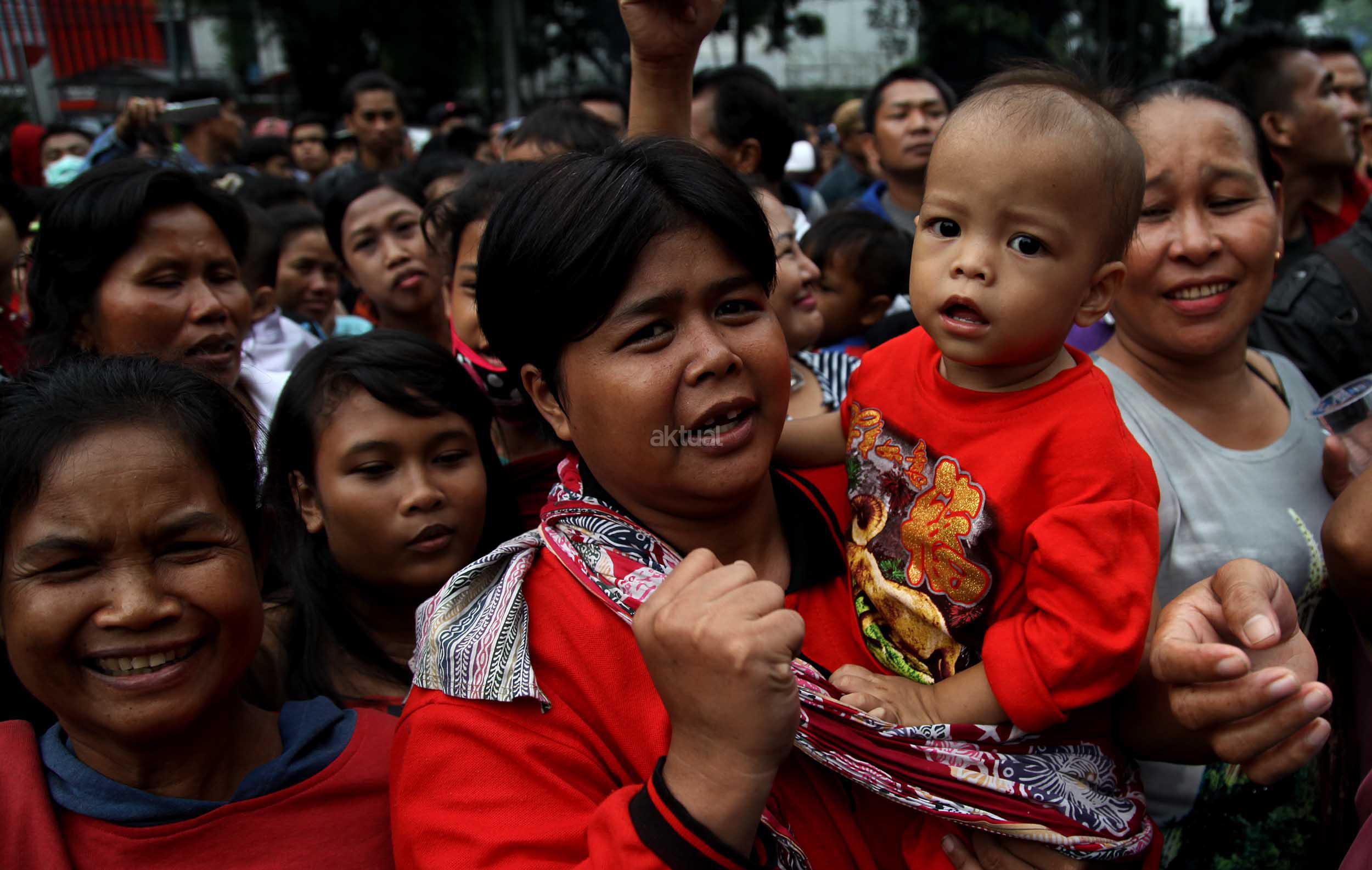 Ratusan warga Kalijodo melakukan aksi demontrasi depan kantor DPRD DKI,Jalan Kebon Sirih, Jakarta Pusat, Jumat (19/2/2016). Dalam aksinya ratusan warga Kalijodo menuntut ganti rugi lahan dan bangunan yang telah mereka tinggali berpuluh tahun itu yang hendak disulap Ahok untuk ruang terbuka hijau sesuai peruntukannya.
