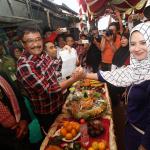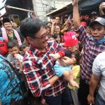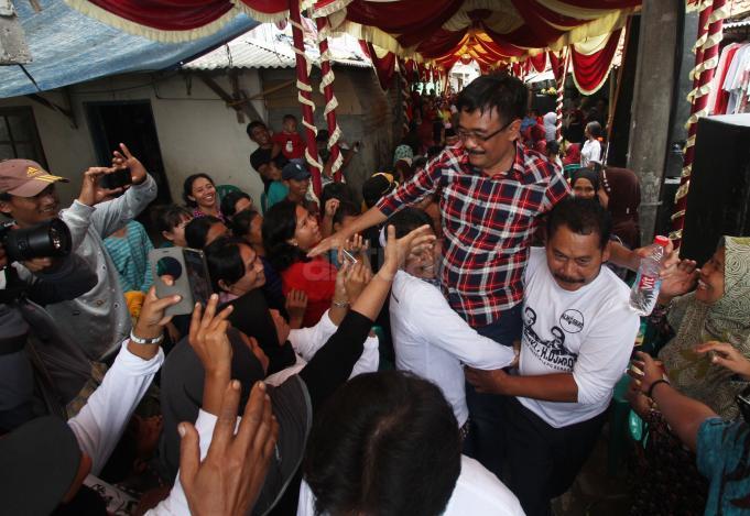 Cawagub DKI Jakarta Djarot Saiful Hidayat diarak oleh warag saat mengunjungi kawasan Kapuk, Cengkareng, Jakarta Barat, Minggu (30/10). Wagub DKI Jakarta nonaktif itu turut menerima deklarasi dukungan Aliansi Masyarakat Sipil Untuk Indonesia Hebat (Almisbat) dari 30 kelurahan untuk pemenangan Ahok-Djarot di kawasan Kapuk. AKTUAL/Tino Oktaviano