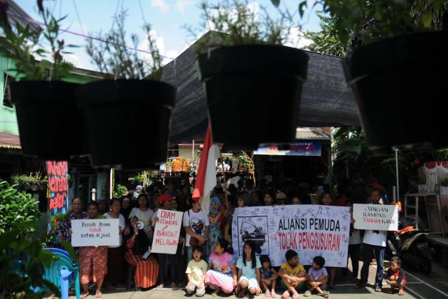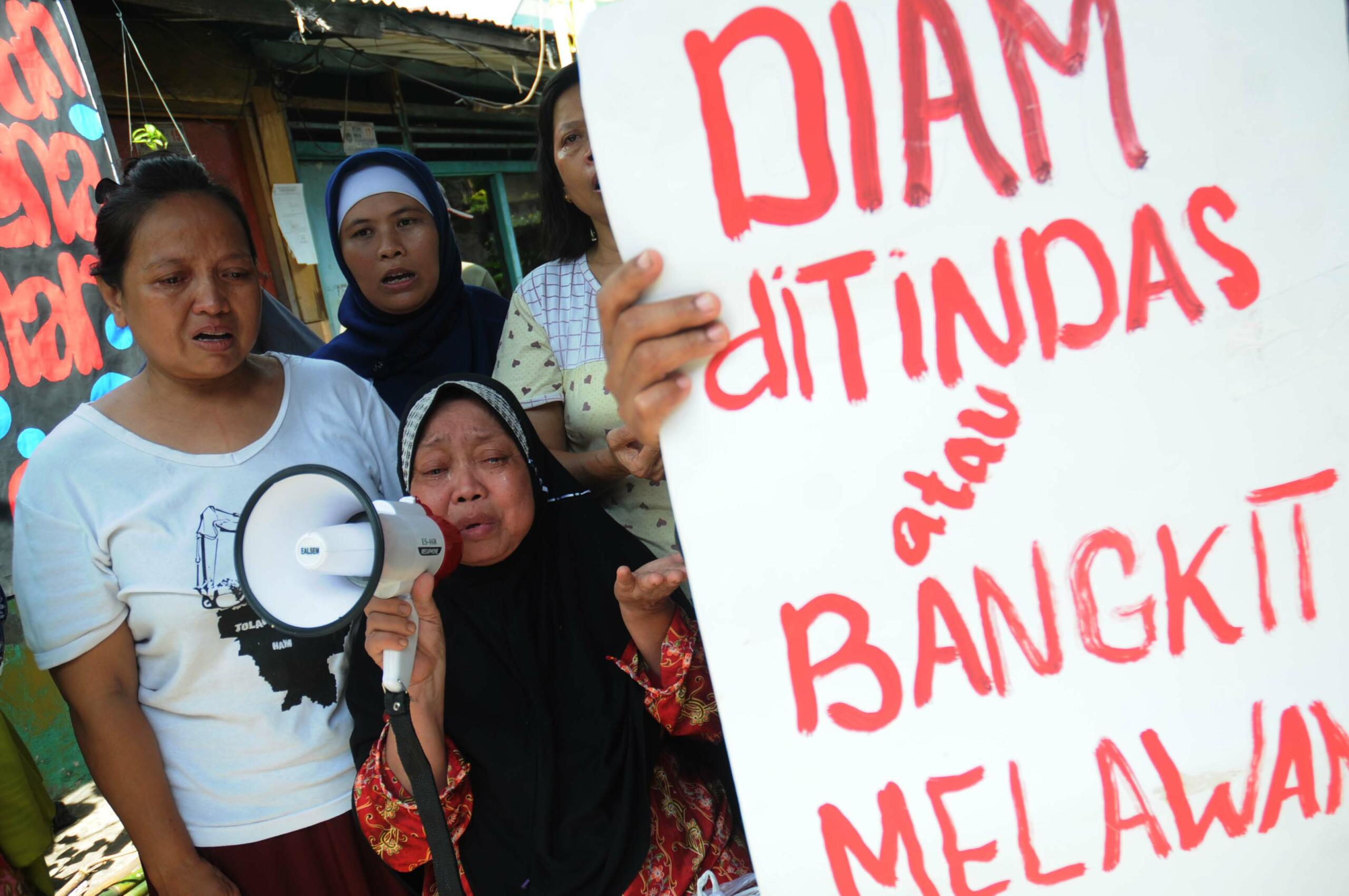 Sejumlah warga berorasi saat aksi menolak penggusuran di kawasan RT08/08 Jalan Lauser, Jakarta, Senin (9/5). Aksi penolakan tersebut digelar terkait rencana pelayangan surat peringatan kedua penggusuran kawasan tersebut yang akan dijadikan ruang terbuka hijau. ANTARA FOTO/Teresia May/16