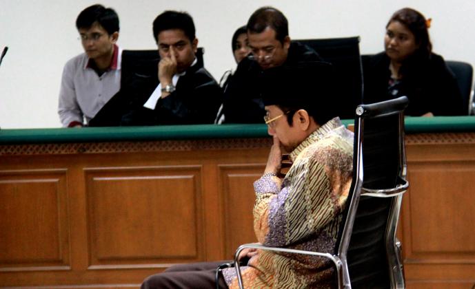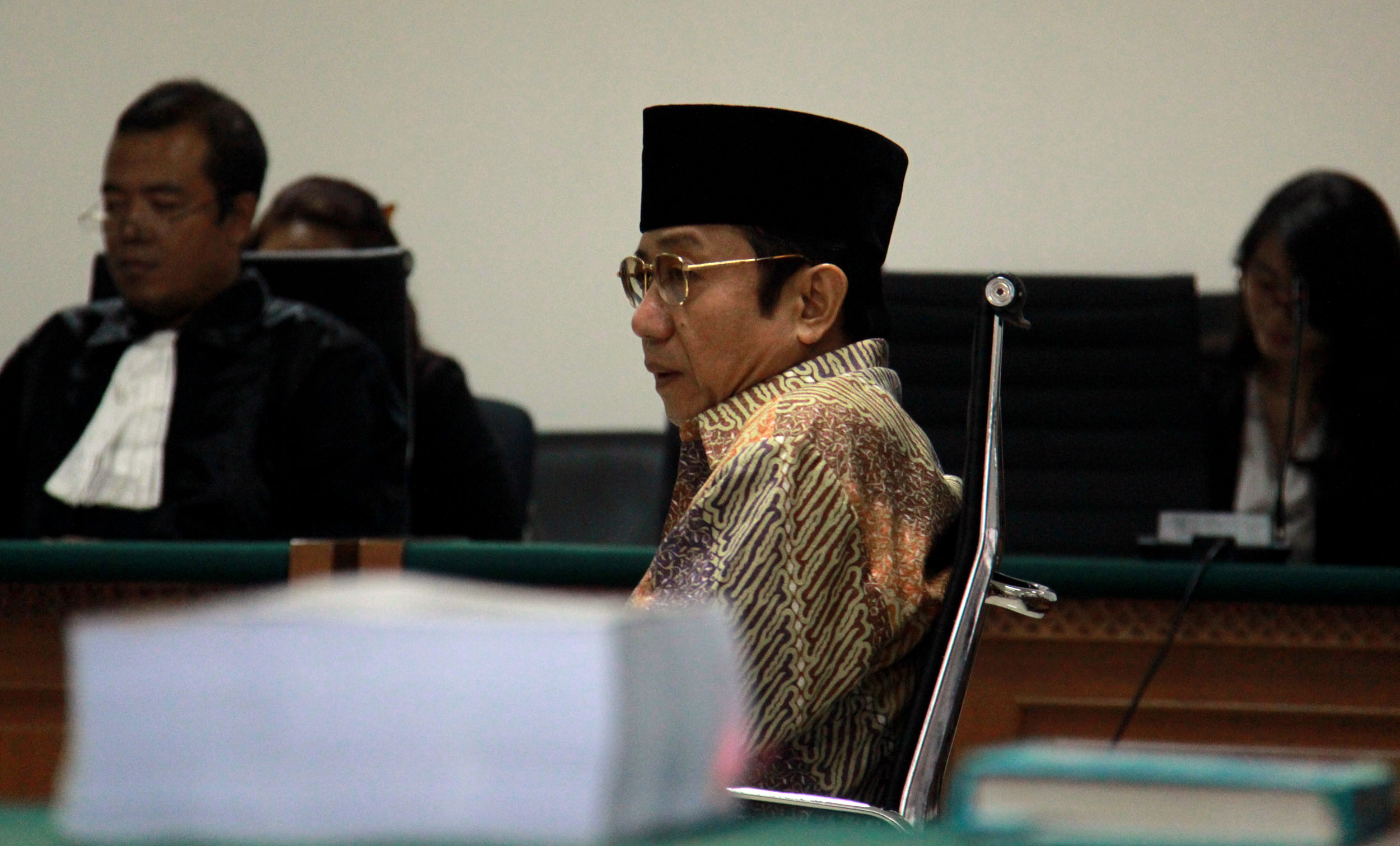 Mantan Sekjen ESDM Waryono Karno (WK) saat mendengarkan pembacaan vonis terhadap dirinya yang dibacakan oleh Hakim anggota, di Jakarta, Rabu (16/9/2015). antan Sekjen Kementerian Energi dan Sumber Daya Mineral (ESDM) Waryono Karno dihukum 6 tahun penjara, denda Rp 300 juta subsidair 3 bulan kurungan. Waryono terbukti bersalah melakukan tindak pidana korupsi dalam kegiatan Setjen ESDM, menyuap Sutan Bhatoegana dan menerima uang gratifikasi.