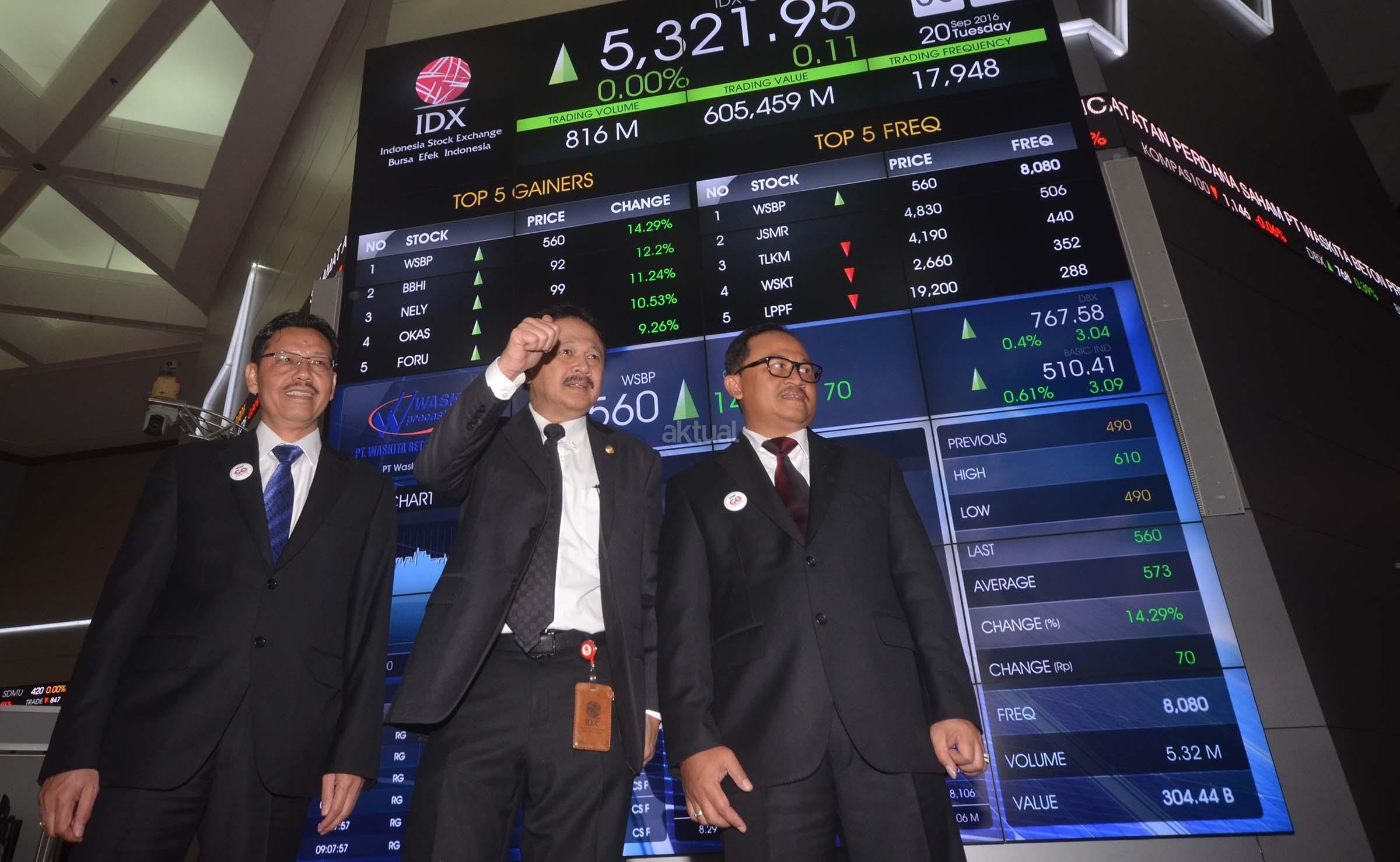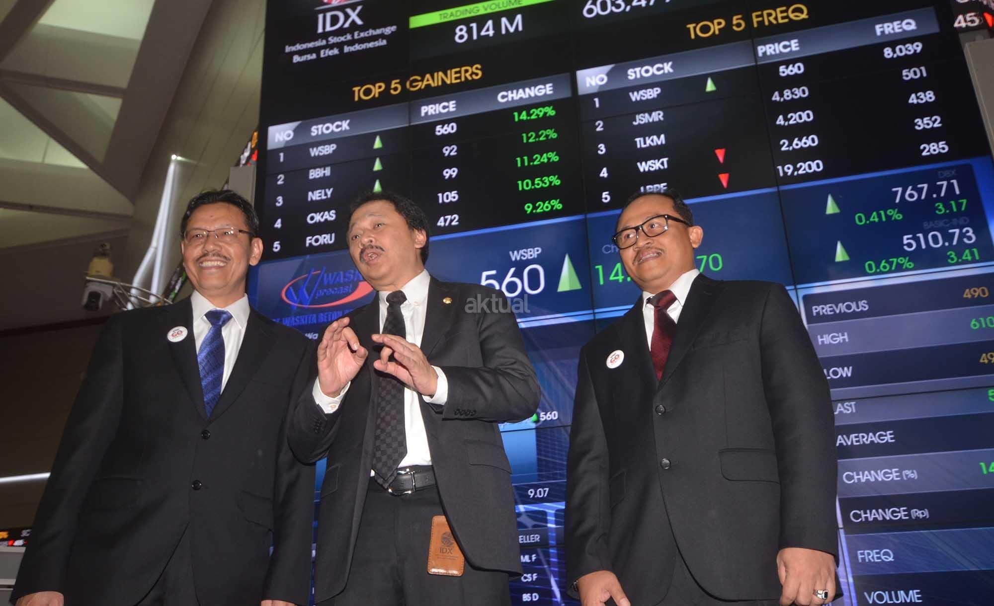 Direktur Utama PT Bursa Efek Indonesia, Tito Sulistio (kanan) didampingi Komisaris Utama PT Waskita Beton Precast Tbk (WBSP), Tunggul Radjagukguk (tengah) dan Direktur Utama PT Waskita Beton Precast Tbk, Jarot Subana (kiri) sesaat sebelum membuka perdagangan saham perdana di Bursa Efek Indonesia, Selasa (20/9).WBSP secara resmi mencatatkan namanya menjadi emiten ke 532 di Bursa Efek Indonesia (BEI). Anak usaha PT Waskita Karya Tbk (WSKT) ini juga menargetkan menghimpun dana Rp 5,1 triliun dari hasil IPO.Anak usaha BUMN yang fokus pada produksi beton ini tercatat hingga pertengahan September 2016 telah mengantongi kontrak baru hampir mencapai Rp 7 triliun. Capaian kontrak baru tersebut sudah mendekati target kontrak baru hingga akhir tahun sebesar Rp 7,6 triliun dengan sisa kontrak tahun 2015 sebesar Rp 3,2 triliun.Selanjutnya, hingga akhir 2016 perseroan menargetkan laba bersih sebesar Rp 620 miliar dengan total keuntungan mencapai Rp 4,7 triliun.