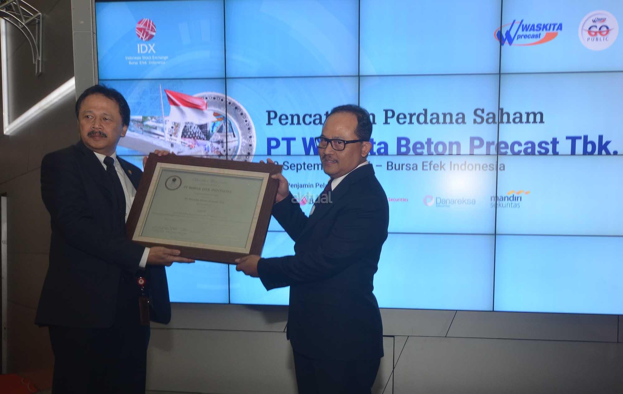 Direktur Utama PT Bursa Efek Indonesia, Tito Sulistio (kiri) menyerahkan sertifikat pencatatan saham perdana kepada Direktur Utama PT Waskita Beton Precast Tbk, Jarot Subana (kanan) seusai membuka perdagangan saham perdana di Bursa Efek Indonesia, Selasa (20/9).WBSP secara resmi mencatatkan namanya menjadi emiten ke 532 di Bursa Efek Indonesia (BEI). Anak usaha PT Waskita Karya Tbk (WSKT) ini juga menargetkan menghimpun dana Rp 5,1 triliun dari hasil IPO.Anak usaha BUMN yang fokus pada produksi beton ini tercatat hingga pertengahan September 2016 telah mengantongi kontrak baru hampir mencapai Rp 7 triliun. Capaian kontrak baru tersebut sudah mendekati target kontrak baru hingga akhir tahun sebesar Rp 7,6 triliun dengan sisa kontrak tahun 2015 sebesar Rp 3,2 triliun.Selanjutnya, hingga akhir 2016 perseroan menargetkan laba bersih sebesar Rp 620 miliar dengan total keuntungan mencapai Rp 4,7 triliun.