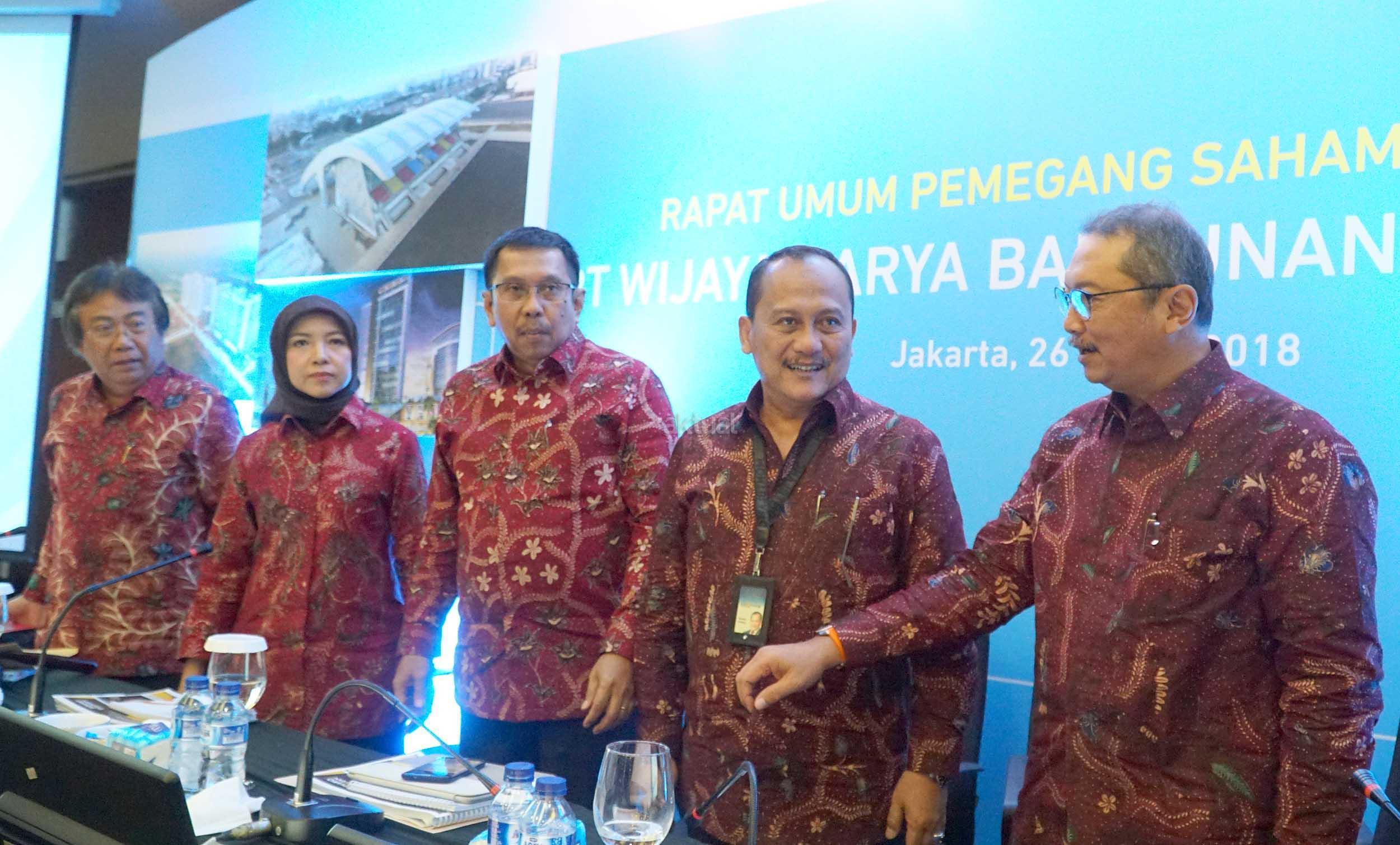 Dirut PT Wijaya Karya Bangunan Gedung Tbk (WEGE), Nariman Prasetyo (keempat kiri) bersama (dari kiri) Komisaris Independen Adji Firmantoro, Komisaris Independen Dini Yulianti, Komut Destiawan Soewardjono, Direktur Independen Abirayadi Riyanto berbincang usai Rapat Umum Pemegang Saham Tahunan, di Jakarta, Senin (26/3). PT Wijaya Karya Bangunan Gedung Tbk membagi deviden sebesar Rp56,570,520,000 dari laba bersih per Juli-Desember 2017 sebesar Rp188,476,461,138. AKTUAL/Eko S Hilman