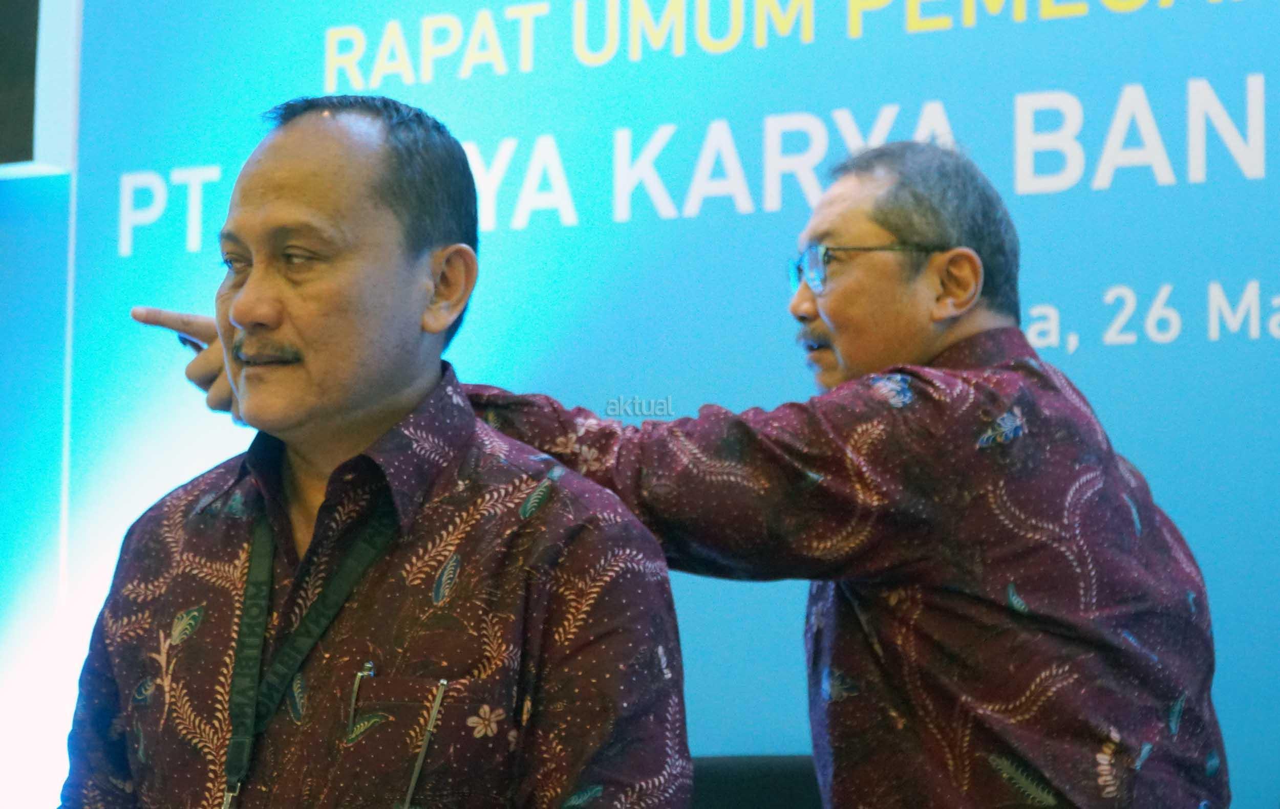 Dirut PT Wijaya Karya Bangunan Gedung Tbk (WEGE), Nariman Prasetyo (kiri) dan Direktur Independen Abirayadi Riyanto usai Rapat Umum Pemegang Saham Tahunan, di Jakarta, Senin (26/3). PT Wijaya Karya Bangunan Gedung Tbk membagi deviden sebesar Rp56,570,520,000 dari laba bersih per Juli-Desember 2017 sebesar Rp188,476,461,138. AKTUAL/Eko S Hilman