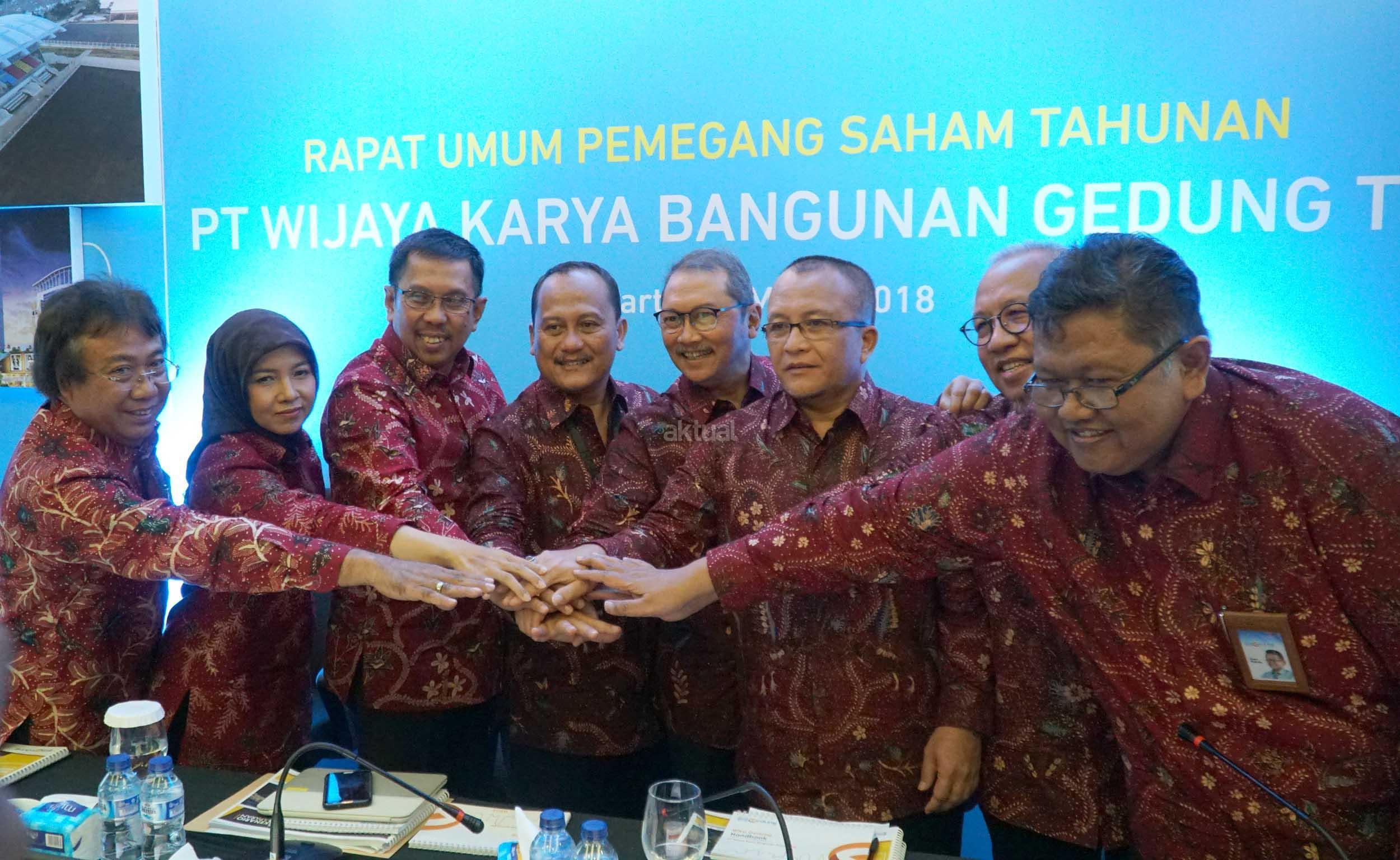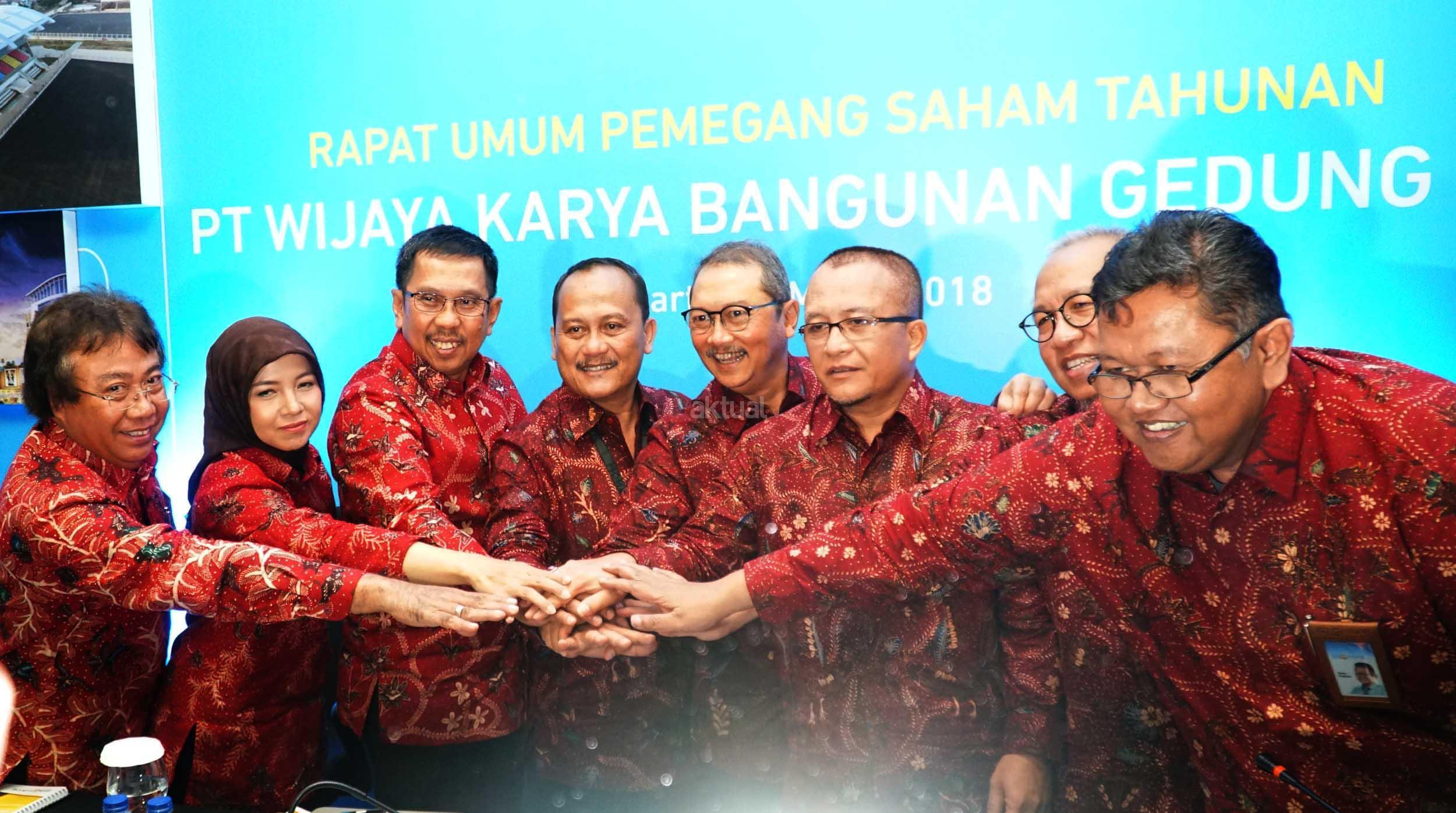 Dirut PT Wijaya Karya Bangunan Gedung Tbk (WEGE), Nariman Prasetyo (keempat kiri) bersama (dari kiri) Komisaris Independen Adji Firmantoro, Komisaris Independen Dini Yulianti, Komut Destiawan Soewardjono, Direktur Independen Abirayadi Riyanto, Direktur Widhi Pudjiono, Direktur Nur Al Fata dan Direktur Djaka Nugraha, saling bertumpu tangan tangan bersama usai Rapat Umum Pemegang Saham Tahunan, di Jakarta, Senin (26/3). PT Wijaya Karya Bangunan Gedung Tbk membagi deviden sebesar Rp56,570,520,000 dari laba bersih per Juli-Desember 2017 sebesar Rp188,476,461,138. AKTUAL/Eko S Hilman