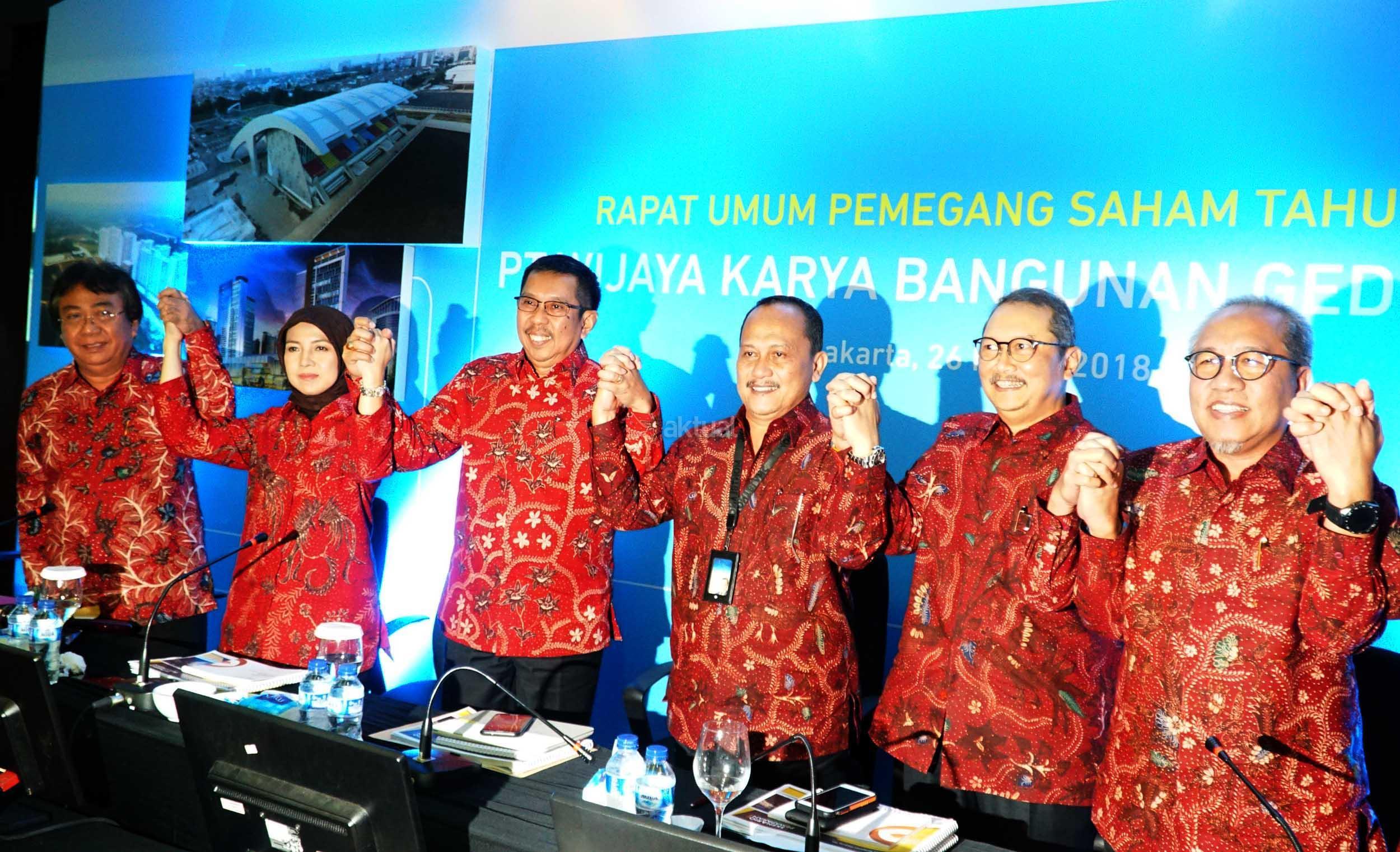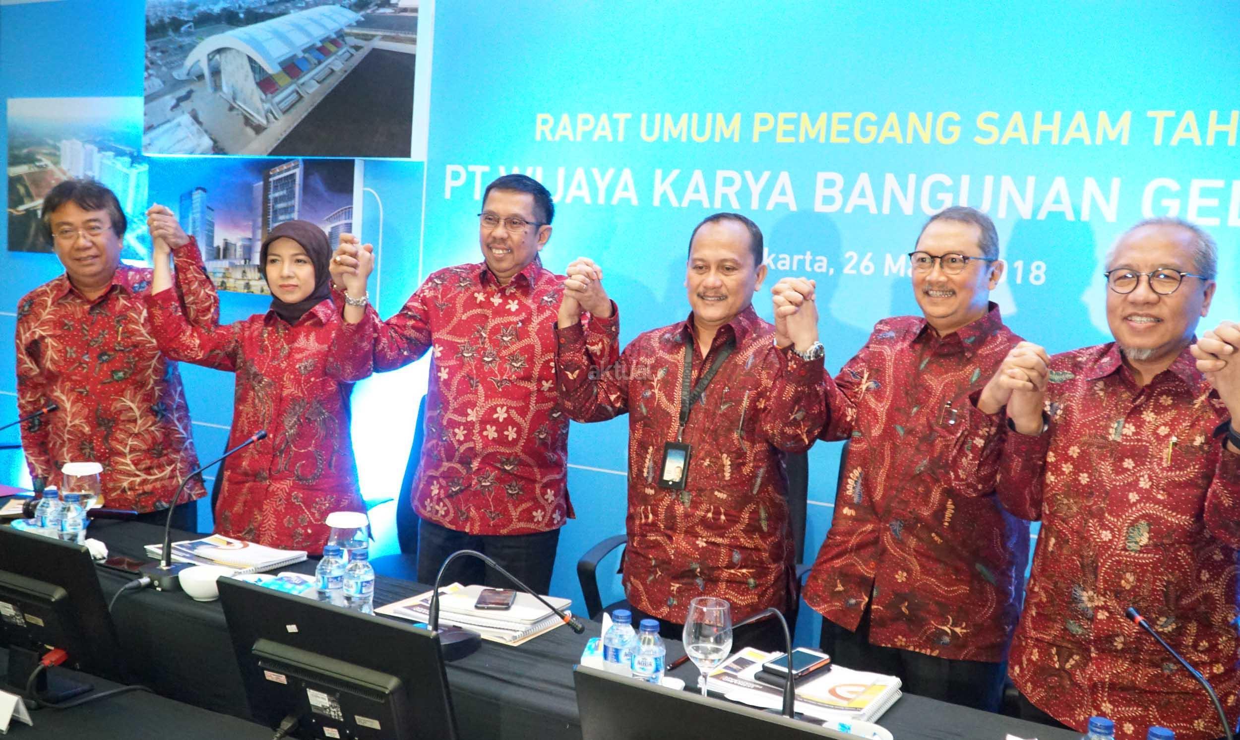 Dirut PT Wijaya Karya Bangunan Gedung Tbk (WEGE), Nariman Prasetyo (keempat kiri) bersama (dari kiri) Komisaris Independen Adji Firmantoro, Komisaris Independen Dini Yulianti, Komut Destiawan Soewardjono, Direktur Independen Abirayadi Riyanto, Direktur Widhi Pudjiono mengangkat tangan tangan bersama usai Rapat Umum Pemegang Saham Tahunan, di Jakarta, Senin (26/3). PT Wijaya Karya Bangunan Gedung Tbk membagi deviden sebesar Rp56,570,520,000 dari laba bersih per Juli-Desember 2017 sebesar Rp188,476,461,138. AKTUAL/Eko S Hilman