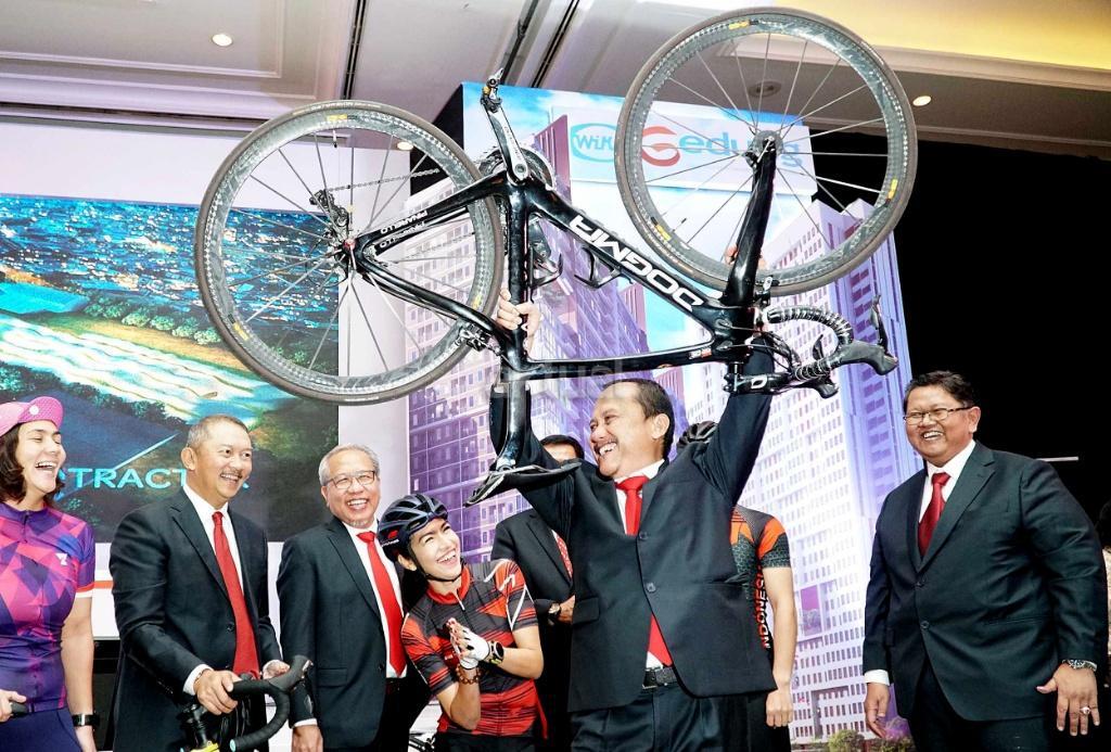(dari kiri ke kanan) Direktur Keuangan, Abiprayadi Riyanto,Direktur pengembangan Investasi dan Human Capital, Nur Al Fata serta Direktur Operasi II, Djaka Nugraha menyaksikan Presiden Direktur, Nariman Prasetyo mengangkat sepeda milik atlit balap sepeda seusai penawaran umum perdana (initial public offering IPO) perseroan di Jakarta, Kamis (26/10). PT Wijaya Karya Bangunan Gedung Tbk (Wika Gedung) sebagai salah satu anak perusahaan PT Wijaya Karya (persero) Tbk (WIKA) berencana untuk menawarkan sebanyak – banyaknya .4.467.000.000 saham atau setara 40% setelah IPO. Perseroan memiliki tiga strategi bisnis yaitu Bisnis Inti (core Bussiness), Backward Integration dan Forwrad Integration. Bisnis inti Wika Gedung adalah penyedia jasa konstruksi high rise building.Selama 9 tahun sejak berdiri di tahun 2008,WIKA Gedung telah memperoleh 154 proyek dengan total nilai Rp 18,74 triliun.Pada semester I 2017,Kontrak baru WIKA Gedung mencapai Rp 4,32 triliun atau naik 59,9% dari pencapaian pada periode yang sama tahun 2016 sebesar Rp 2,7 triliun.Dengan kontrak bawaan (carry over) tahun lalu sebesar Rp 5,7 triliun dan kontrak baru senilai Rp 4,32 triliun. Maka total kontrak perseroan (order book) per semester I 2017 menjadi Rp 10,02 triliun. AKTUAL/Eko S Hilman