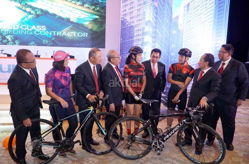 (dari kiri ke kanan) Direktur Operasi Wika Gedung, Widhi Pudjiyono, Direktur Keuangan, Abiprayadi Riyanto,Direktur pengembangan Investasi dan Human Capital, Nur Al Fata, Presiden Komisaris, Destiawan Soewardjono, Presiden Direktur, Nariman Prasetyo serta Direktur Operasi II, Djaka Nugraha berbincang dengan atlit balap sepeda seusai penawaran umum perdana (initial public offering IPO) perseroan di Jakarta, Kamis (26/10). PT Wijaya Karya Bangunan Gedung Tbk (Wika Gedung) sebagai salah satu anak perusahaan PT Wijaya Karya (persero) Tbk (WIKA) berencana untuk menawarkan sebanyak – banyaknya .4.467.000.000 saham atau setara 40% setelah IPO. Perseroan memiliki tiga strategi bisnis yaitu Bisnis Inti (core Bussiness), Backward Integration dan Forwrad Integration. Bisnis inti Wika Gedung adalah penyedia jasa konstruksi high rise building.Selama 9 tahun sejak berdiri di tahun 2008,WIKA Gedung telah memperoleh 154 proyek dengan total nilai Rp 18,74 triliun.Pada semester I 2017,Kontrak baru WIKA Gedung mencapai Rp 4,32 triliun atau naik 59,9% dari pencapaian pada periode yang sama tahun 2016 sebesar Rp 2,7 triliun.Dengan kontrak bawaan (carry over) tahun lalu sebesar Rp 5,7 triliun dan kontrak baru senilai Rp 4,32 triliun. Maka total kontrak perseroan (order book) per semester I 2017 menjadi Rp 10,02 triliun. AKTUAL/Eko S Hilman