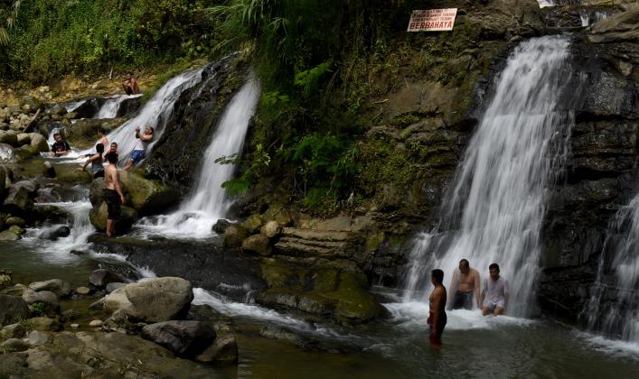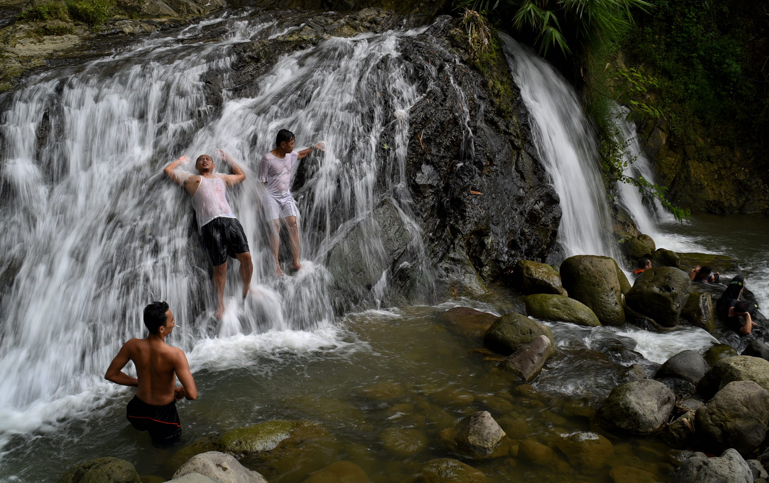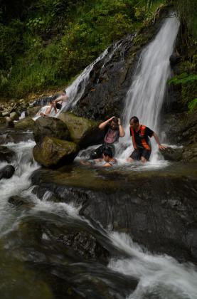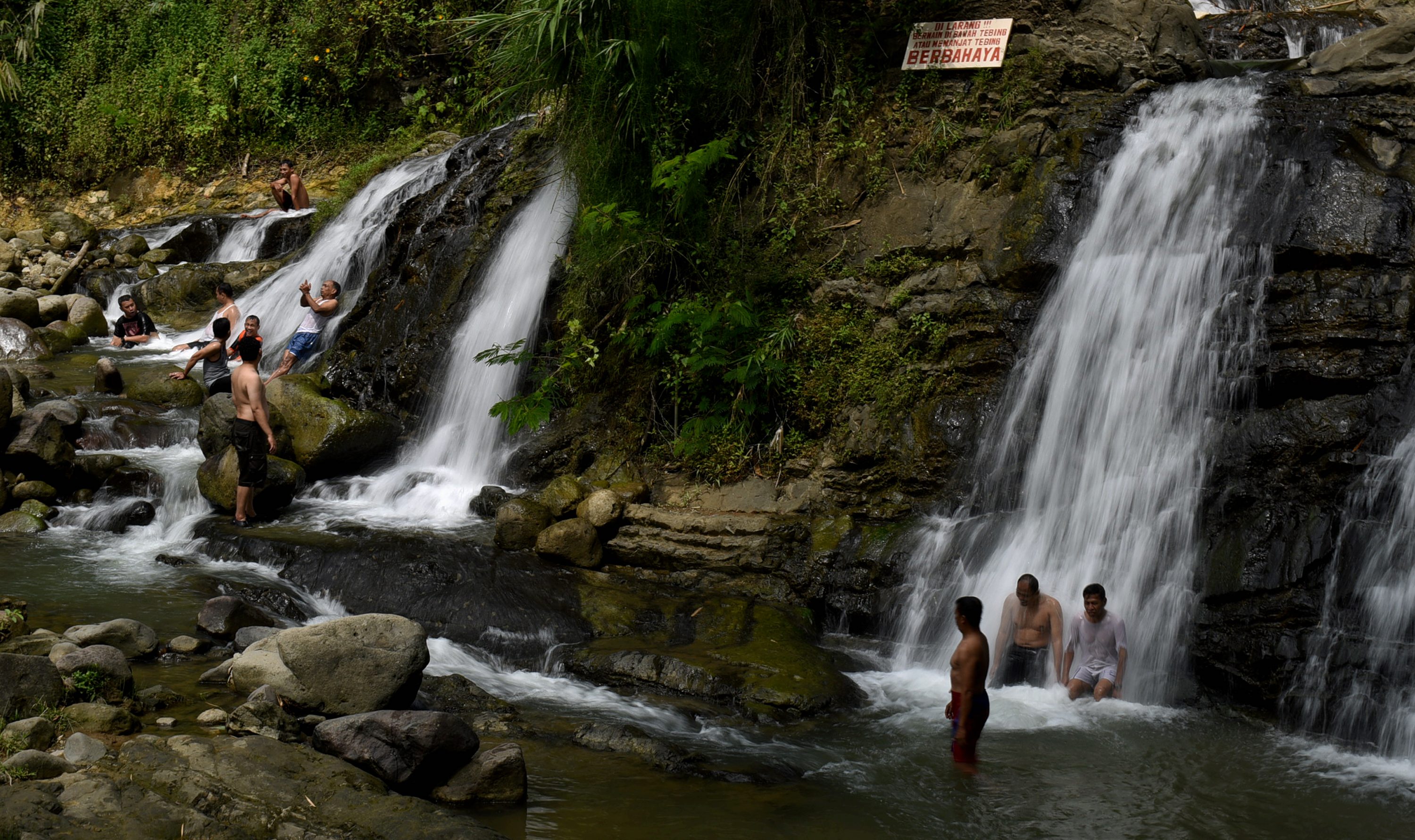 Wisatawan domestik bermain air di lokasi wisata air terjun Curug Tujuh Badadari, di Kabupaten Semarang, Jawa Tengah, Kamis (12/5). Wisata alam air terjun bersusun tiga yang berada di sekitar Gunung Ungaran tersebut menjadi salah satu unggulan wisata di Kabupaten Semarang. ANTARA FOTO/R. Rekotomo/foc/16.