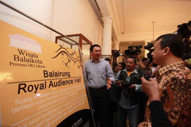 Gubernur DKI Jakarta Basuki Tjahaja Purnama (kiri) menjelaskan salah satu ruangan usai meresmikan wisata Balaikota di gedung Balaikota, Jakarta, Sabtu (12/9). Mulai saat ini masyarakat dapat berwisata ke Gedung Balaikota serta masuk ke dalam kantor Gubernur DKI Jakarta setiap Sabtu dan Minggu mulai pukul 09.00-17.00. ANTARA FOTO/Muhammad Adimaja
