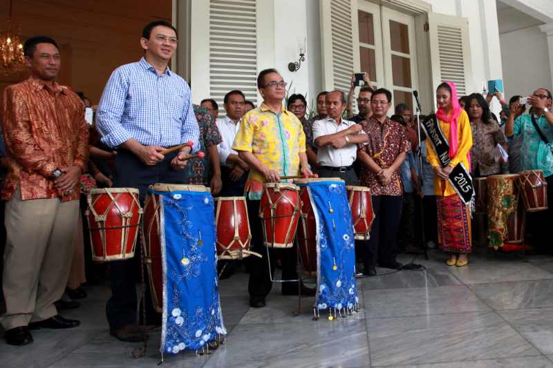 Gubernur DKI Jakarta Basuki Tjahaja Purnama (kiri) memukul gendang tanda dibukanya wisata Balaikota di gedung Balaikota, Jakarta, Sabtu (12/9). Mulai saat ini masyarakat dapat berwisata ke Gedung Balaikota serta masuk ke dalam kantor Gubernur DKI Jakarta setiap Sabtu dan Minggu mulai pukul 09.00-17.00. ANTARA FOTO/Muhammad Adimaja
