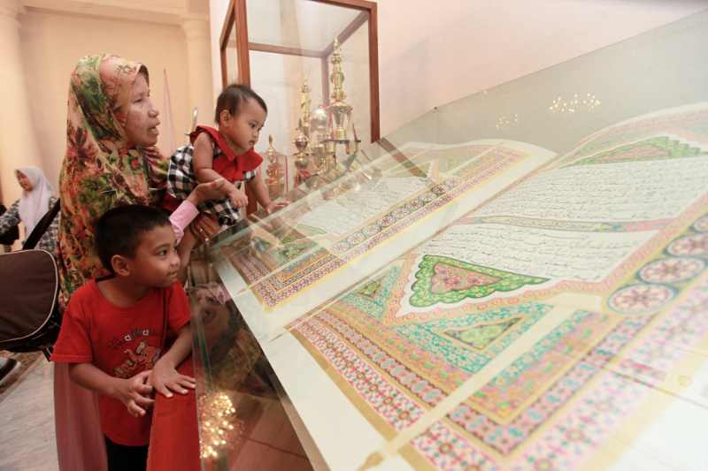 Warga melihat Al-Quran raksasa yang ada di salah satu ruangan saat wisata di Balaikota, Jakarta, Sabtu (12/9). Mulai saat ini masyarakat dapat berwisata ke Gedung Balaikota serta masuk ke dalam kantor Gubernur DKI Jakarta setiap Sabtu dan Minggu mulai pukul 09.00-17.00. ANTARA FOTO/Muhammad Adimaja