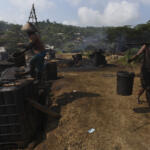 Penambang minyak tradisional memindahkan minyak ke dalam wadah sebelum diangkut ke pusat pengumpul produksi Menggung Cepu di Penambangan Minyak Rakyat, Wonocolo, Bojonegoro, Jawa Timur, Sabtu (23/7). Tambang rakyat tersebut tengah dikembangkan menjadi objek wisata migas petroleum geoheritage Wonocolo dengan harapan masyarakat mengetahui sejarah pengelolaan migas di Indonesia. ANTARA FOTO/Zabur Karuru/ama/16