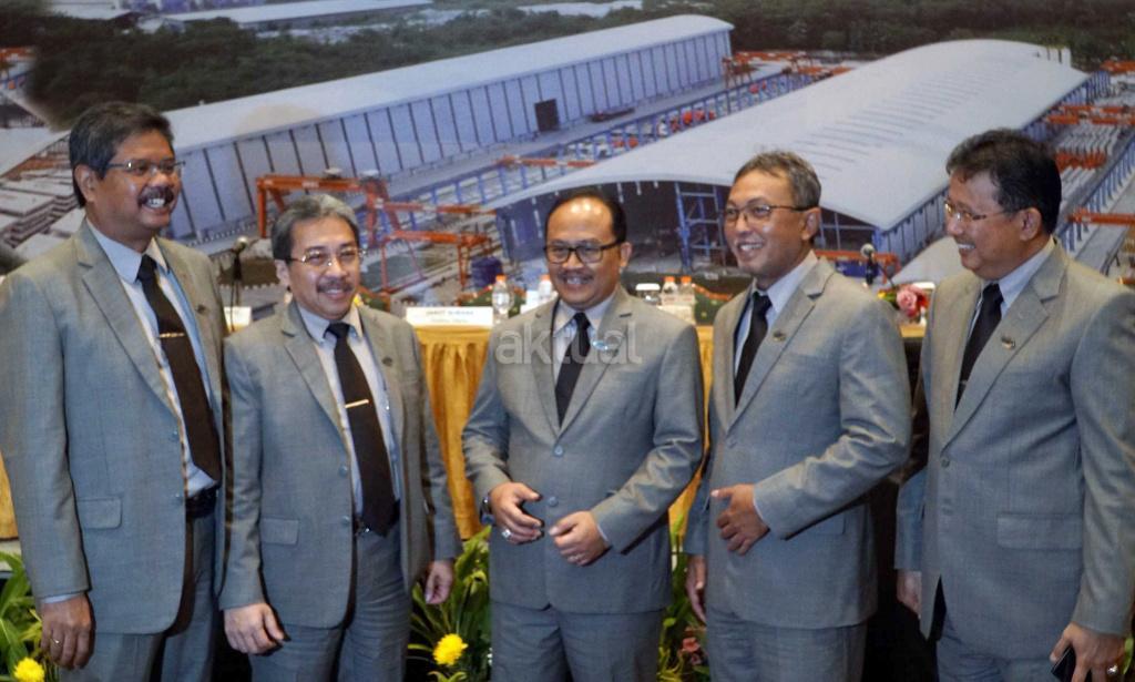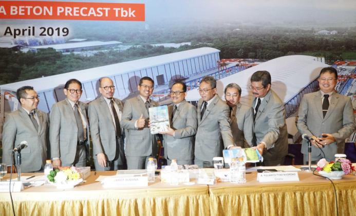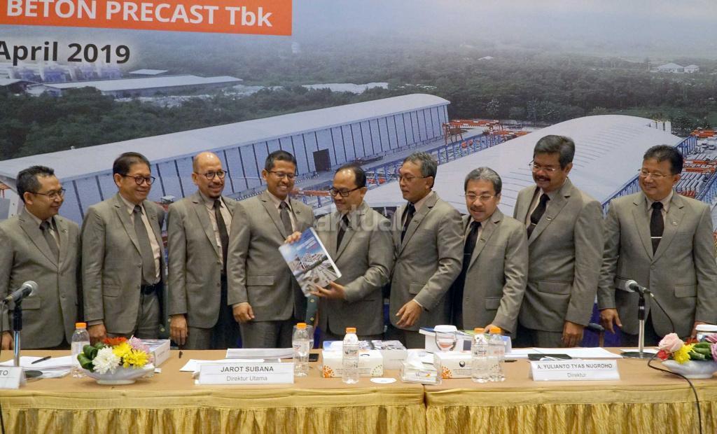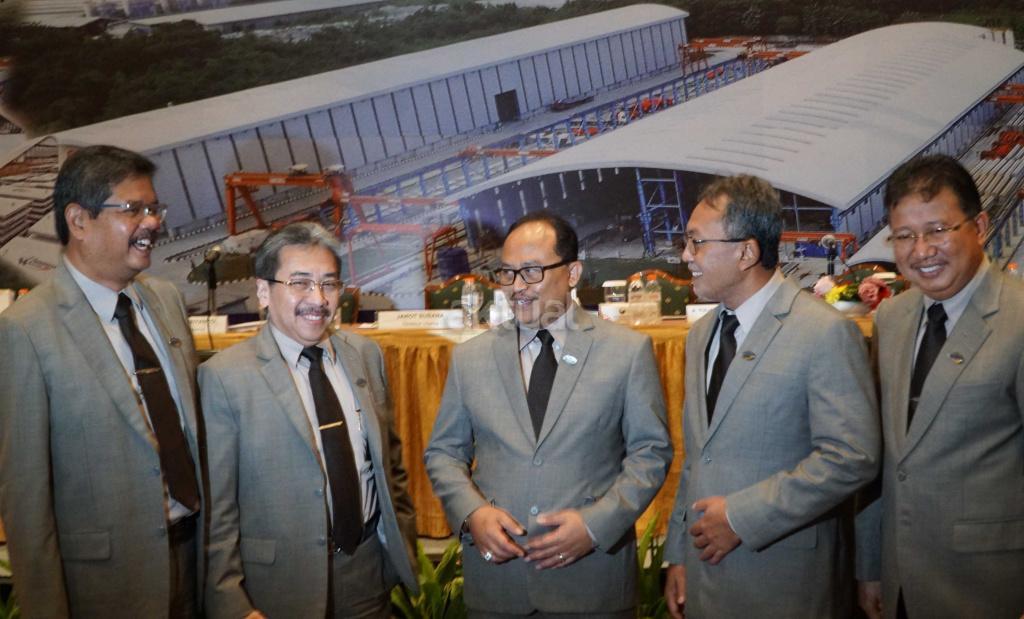 (dari kiri ke kanan) Direktur Pemasaran PT Waskita Beton Precast Tbk (WSBP) Agus Wantoro, Direktur Human Captital & Sistem Munib Lusianto, Direktur Utama Jarot Subana, Direktur Keuangan Anton Y Nugroho serta Direktur Produksi Yudhi Dharmawan berbincang usai Rapat Umum Pemegang Saham Tahunan (RUPST) di Jakarta, Rabu (24/4). AKTUAL/STR-Eko S Hilman