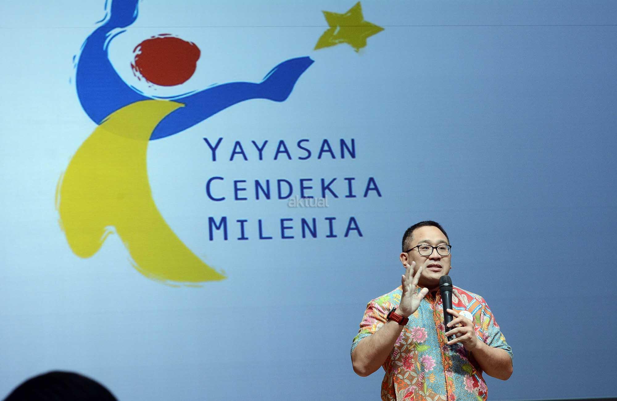 Dewan Pembina Yayasan Cendekia Milenia (YCM), Alexander Rusli menyampaikan sambutan pembuka dalam lelang untuk penggalangan dana bagi YCM dalam kesempatan Gala Dinner di Jakarta Kamis (18/11) malam. AKTUAL/Eko S Hilman