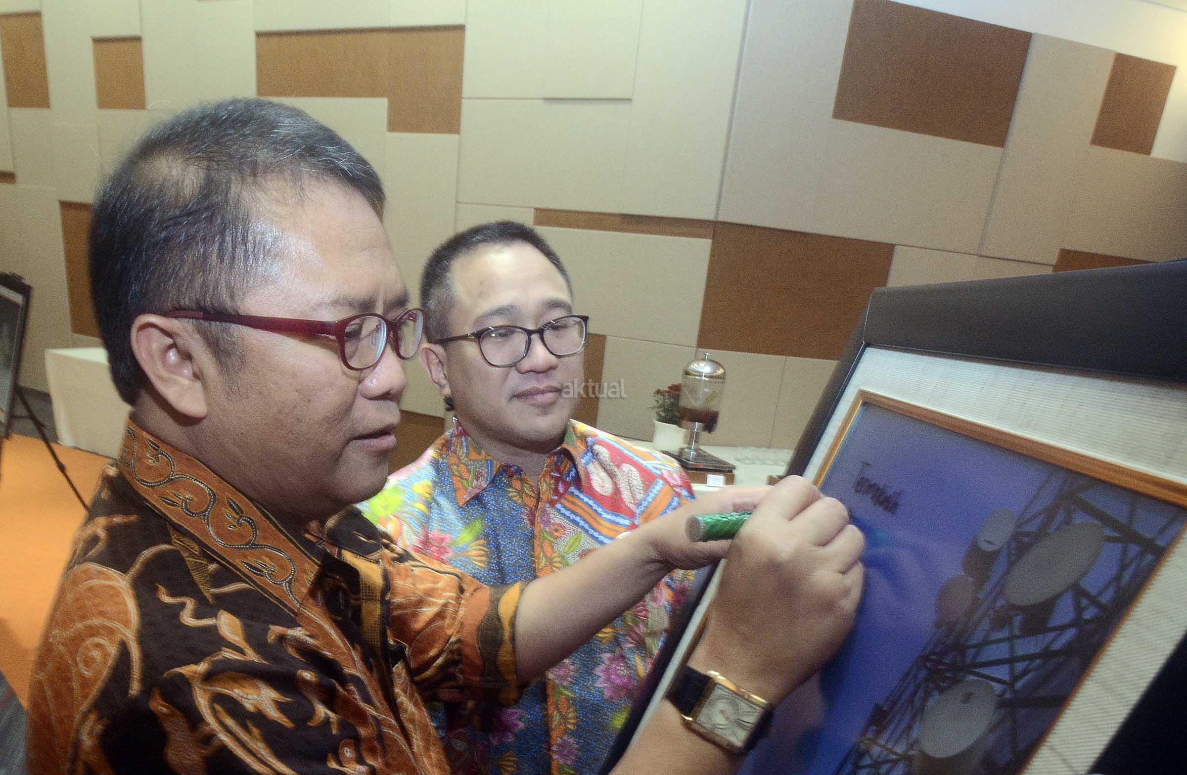 Menteri Komunikasi dan Informatika (Menkominfo), Rudiantara (kiri) didampingi Dewan Pembina Yayasan Cendekia Milenia (YCM), Alexander Rusli menandatangani foto yang laku terjual dalam lelang untuk penggalangan dana bagi YCM dalam kesempatan Gala Dinner di Jakarta Kamis (18/11) malam. Kegiatan YCM ke depannya selain memberikan beasiswa akan lebih luas dan ikut mendukung target kementerian komunikasi dan informasi untuk melakukan revolusi digital untuk merevolusi ekonomi Indonesia dengan menyiapkan sumber daya yang lebih handal. Melalui berbagai program seperti memperbanyak coding class termasuk homeschooling coding class, penyiapan ekosistem yang kondusif bagi developer muda yang berjiwa entrepreneurship. Mempersiapkan milenial menjadi start up, memfasilitasi mentor dan investor serta program-program inkubasi dan co-working space. AKTUAL/Eko S Hilman