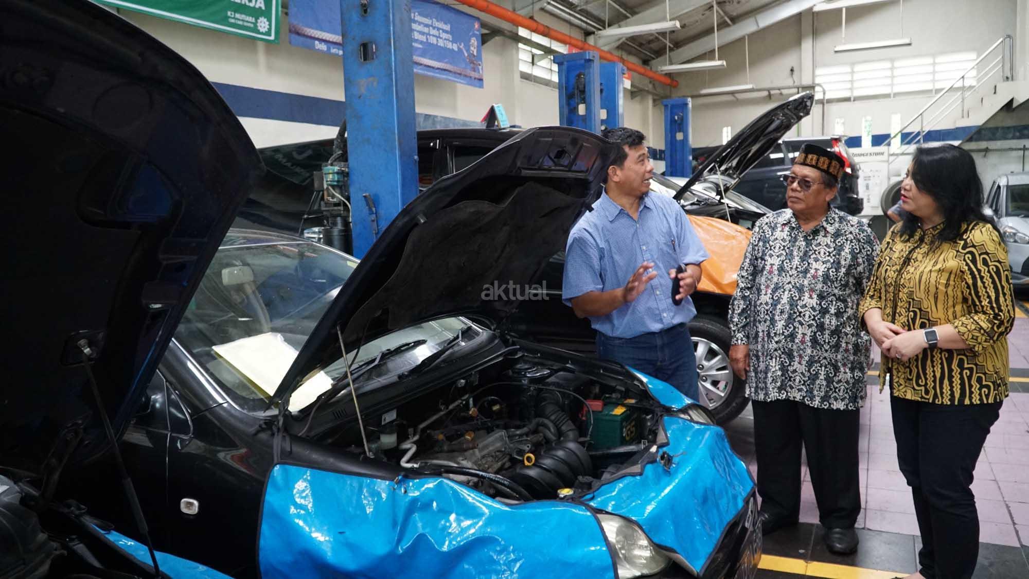 Pimpinan Bengkel Mutiara Car Care Depok, Ahmad Yusuf (kiri) didampingi Pendiri Bengkel Mutiara Car Care, H. Mubin Usman (kanan) menjelaskan proses pengerjaan servis kendaraan bermotor kepada Sekretaris Pengurus Yayasan Dharma Bhakti Astra (YDBA), Ida R.M. Sigalingging pada kegiatan Benchmark UKM Pra Mandiri ke UKM Mandiri YDBA (12/4). Kegiatan ini diadakan YDBA sebagai sarana pertukaran pengalaman dan pengetahuan antar UKM Bengkel untuk naik kelas dan mencapai kemandirian. AKTUAL/Eko S Hilman