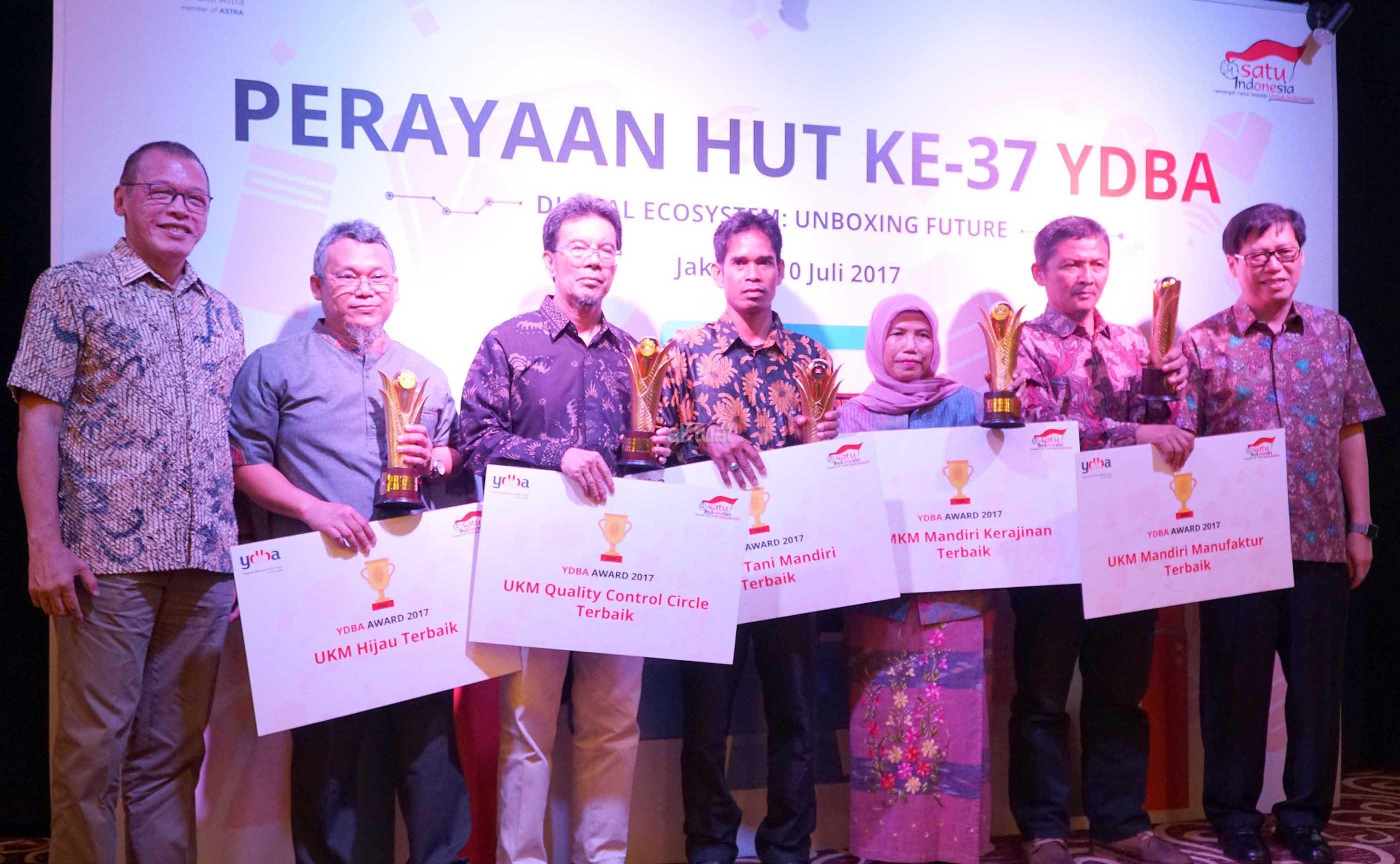 Ketua Pengurus Yayasan Dharma Bhakti Astra (YDBA), Henry C Wijaya (kanan) bersama Ketua Pembina YDBA, Johannes Loman (kedua dari kanan) menyerahkan trophy dan penghargaan kepada perwakilan UKM dari berbagai kategori antara lain UKM Hijau Terbaik, UKM Quality Control Circle, Usaha Tani mandiri, UMKM Mandiri Kerajinan Terbaik, UKM Mandiri Manufaktur saat penyerahan YDBA Award 2017 di Jakarta, Senin (10/7) Pada kesempatan yang sama juga dilakukan peluncuran Digital Ecosystem yang merupakan ekosistem digital YDBA berbentuk onlife platform yang beriringan dengan offline platform yang sudah ada, Ekosistem digital tersebut tertuang dalam kanal hebatnyaukm.org yang berisikan fitur Blog dan News yang berisi informasi seputar UKM dan kewirausahaan yang lebih mendalam. AKTUAL/Eko S Hilman