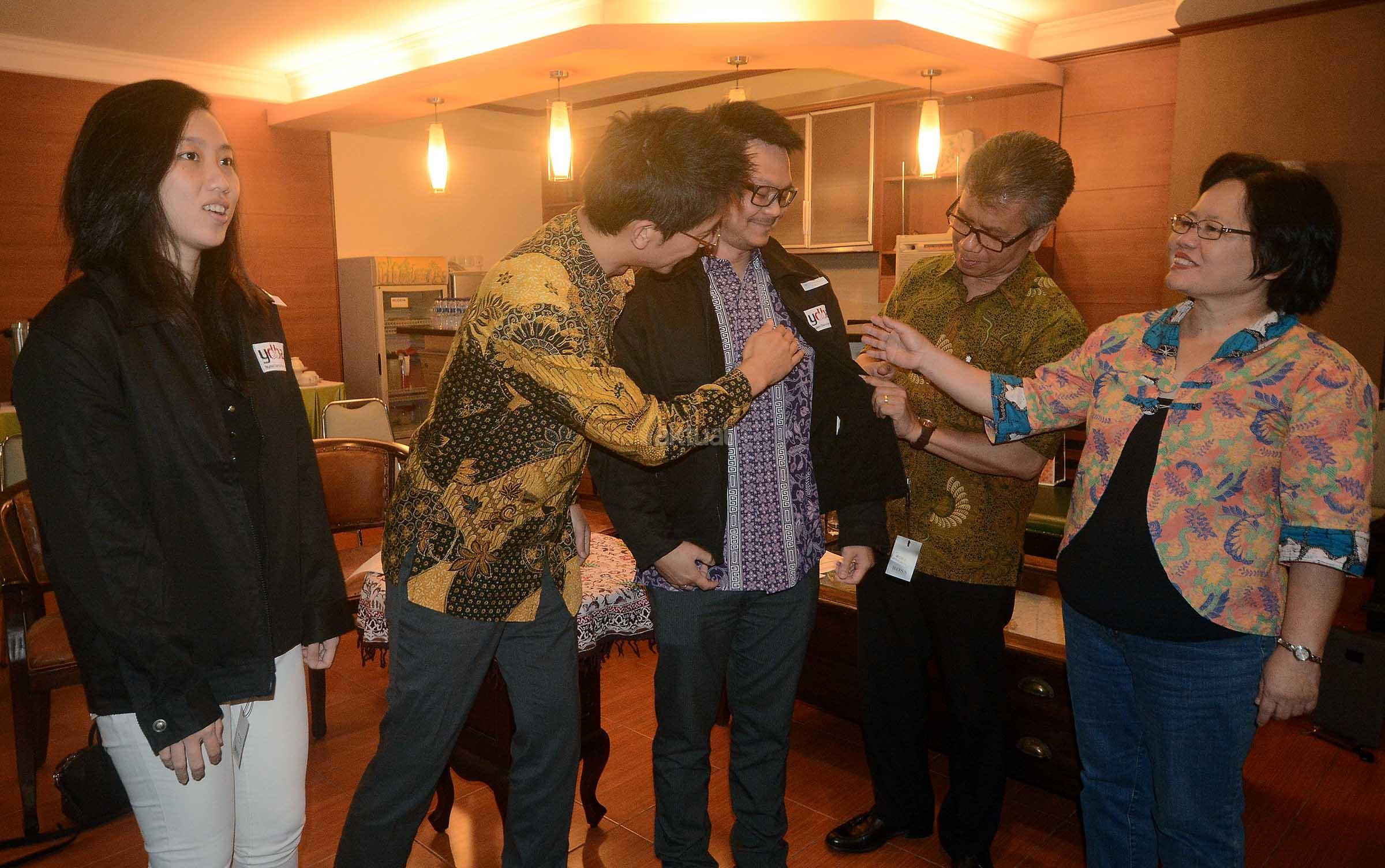 Sekretaris Jenderal Himpunan Alumni AOTS-HIDA Indonesia, Robby Kambey (kedua dari kanan) bersama General Manager HIDA Jakarta Office, Hayato Tanaka (kedua kiri) disaksikan Bendahara Pengurus Yayasan Dharma Bhakti Astra (YDBA), Fati Hendrayani membantu mengenakan jaket secara simbolis kepada perwakilan mitra UMKM YDBA yang akan mengikuti seminar binis ke Jepang saat pelepasannya di Jakarta, Jumat (20/1). Tahun ini YDBA memberangkatkan kembali UMKM mitranya untuk mengikuti seminar on family bussiness management for ASEAN yang di jadwalkan berlansung di Kansai Kenshu Center, Osaka pada tanggal 23-27 Januari 2017 mendatang. AKTUAL/Eko S Hilman