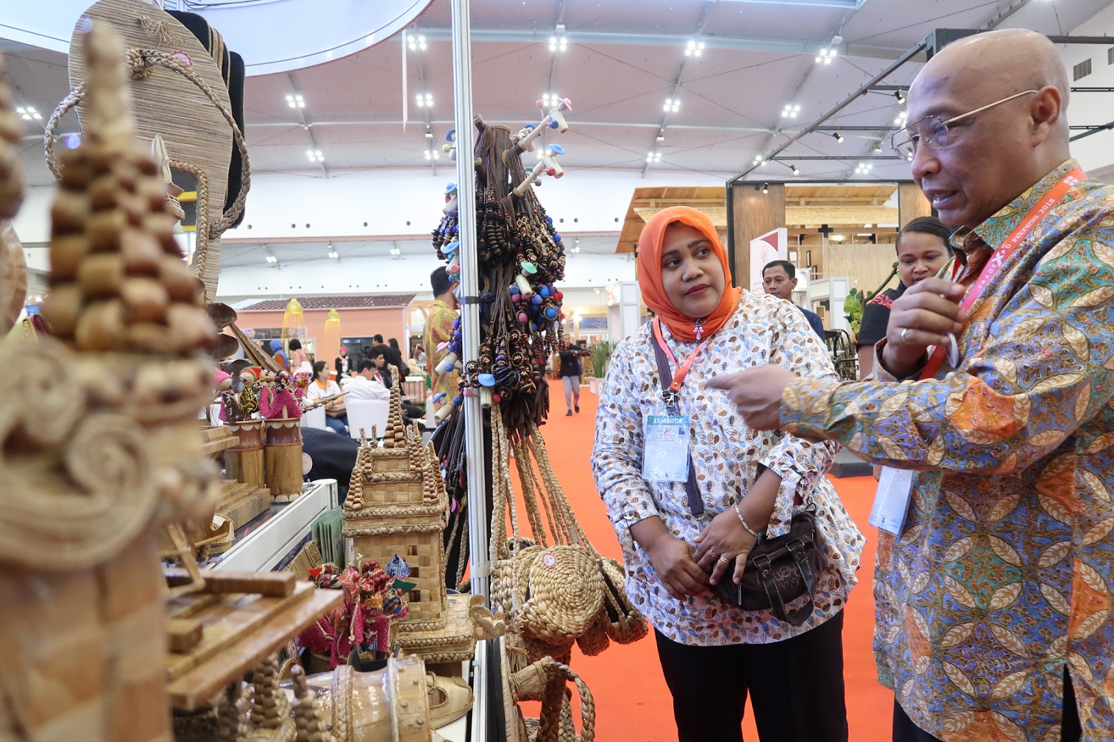Chief of Corporate Communications, Social Responsibility & Security PT Astra International Tbk Pongki Pamungkas (tengah) dan Head of Corporate Communication PT Astra International Tbk Boy Kelana Soebroto (kanan) antusias terhadap karya produk UMKM Kerajinan Mitra Yayasan Dharma Bhakti Astra (YDBA) yang ditampilkan dalam pameran berkelas internasional Trade Expo Indonesia 2018 di ICE BSD City, Kamis (25/10). Sebanyak 8 UMKM Kerajinan mitra YDBA mengikuti pameran yang berlangsung pada 24 – 28 Oktober 2018 ini. Diikutsertakannya UMKM dalam pameran tersebut sebagai salah satu program fasilitasi pemasaran oleh YDBA. AKTUAL/Eko S Hilman