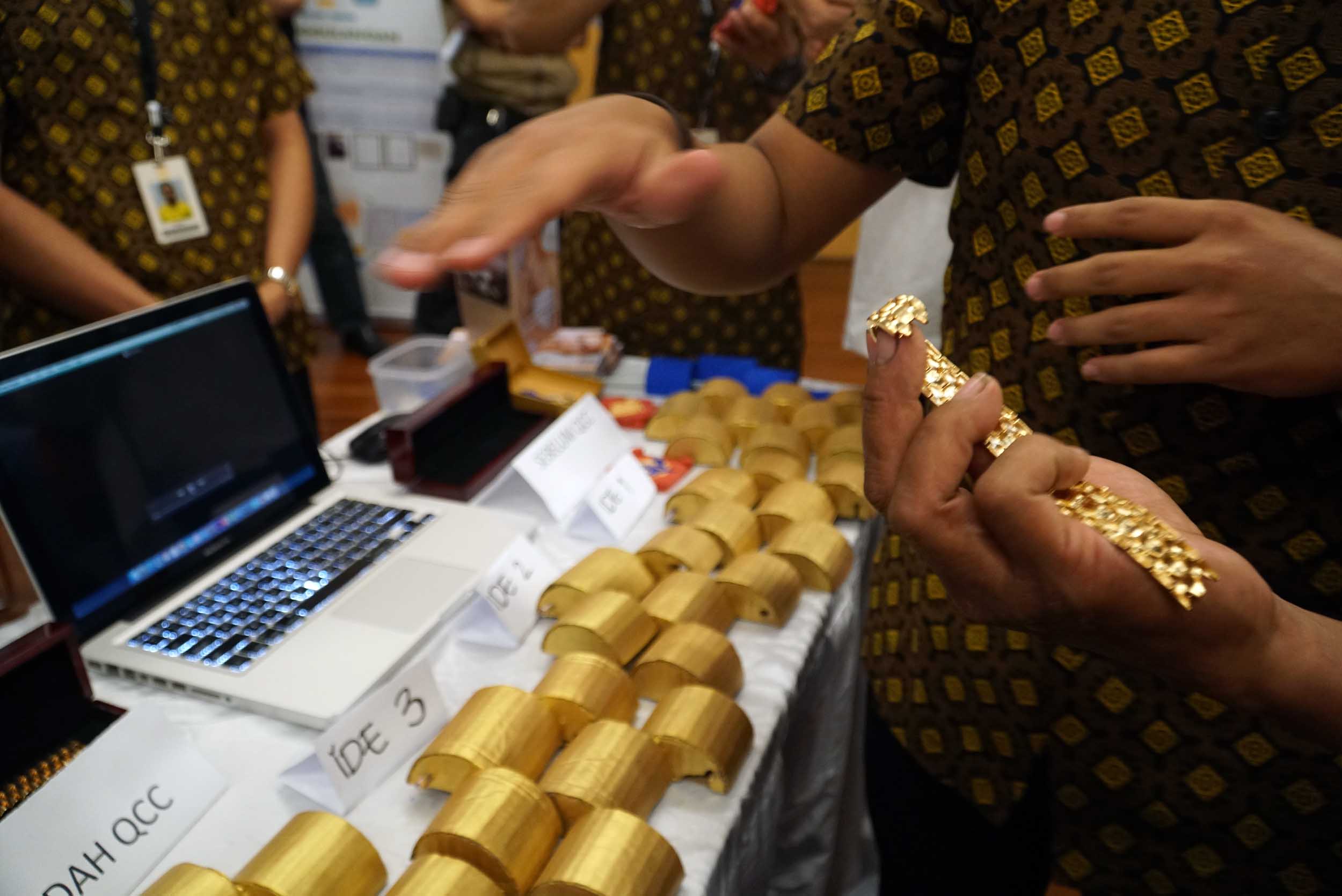Sejumlah peserta UKM kelompok Quality Control Circle (QCC) mempresentasikan hasil improvisasi dalam mengembangkan inovasi teknologi dalam menciptakan produk saat Konvensi QCC untuk UKM yang ketiga diselenggaran oleh Yayasan Dharma Bhakti Astra (YDBA) di Cikarang Barat, Jumat (21/9/2018). Konvensi QCC yang ketiga ini merupakan salah satu kegiatan yg diselenggarakan Yayasan Dharma Bhakti Astra (YDBA) sebagai sarana bagi UKM untuk berkompetisi. AKTUAL/Eko S Hilman