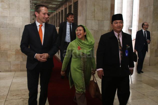 Menteri Luar Negeri Denmark Kristian Jensen (kiri) didampingi Direktur The Wahid Institute Yenny Wahid (tengah) melakukan kunjungan ke Masjid Istiqlal, Jakarta, Kamis (22/10). Kunjungan tersebut bertujuan untuk melihat secara langsung kondisi kerukunan umat beragama di Indonesia. ANTARA FOTO/Rivan Awal Lingga/ama/15
