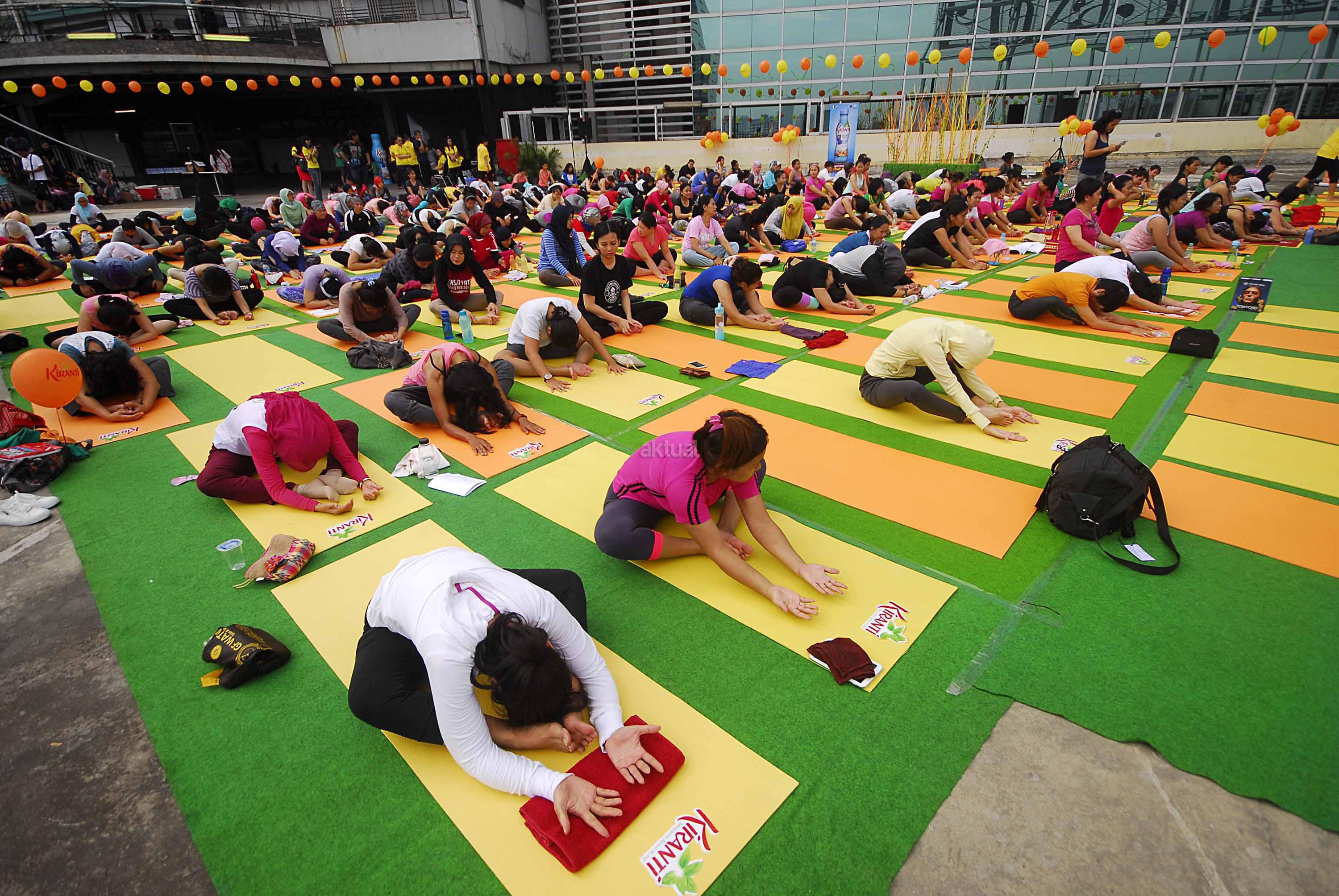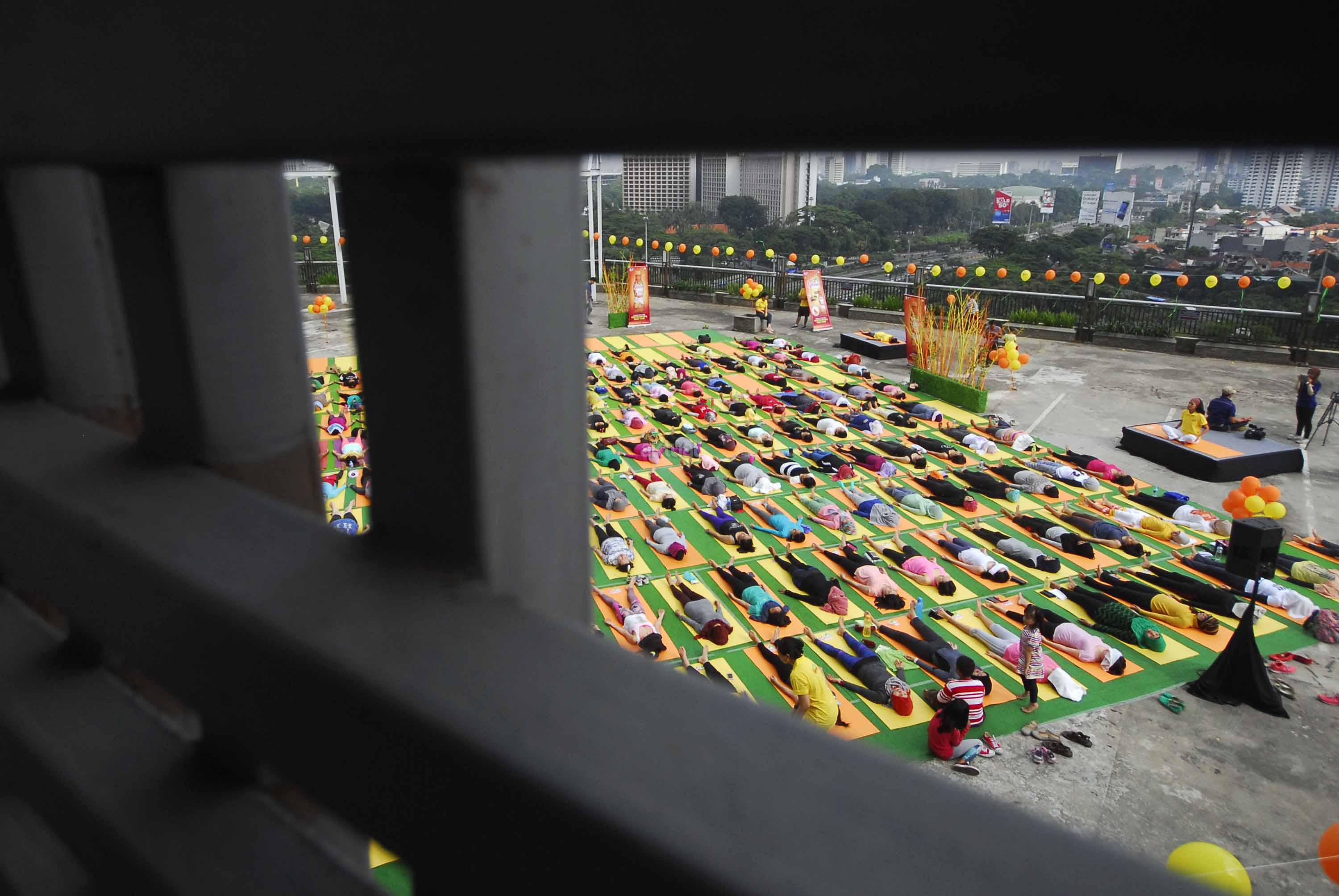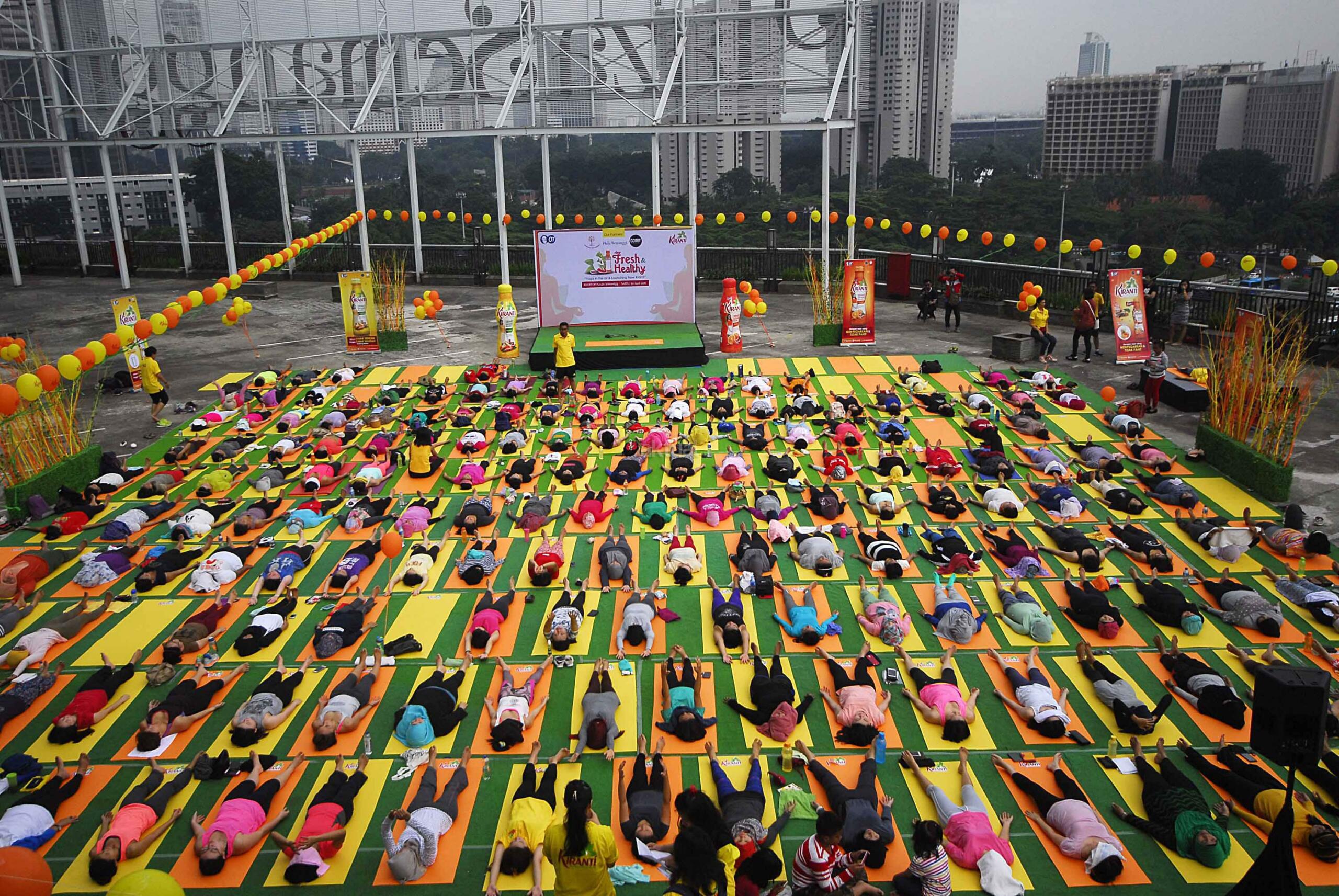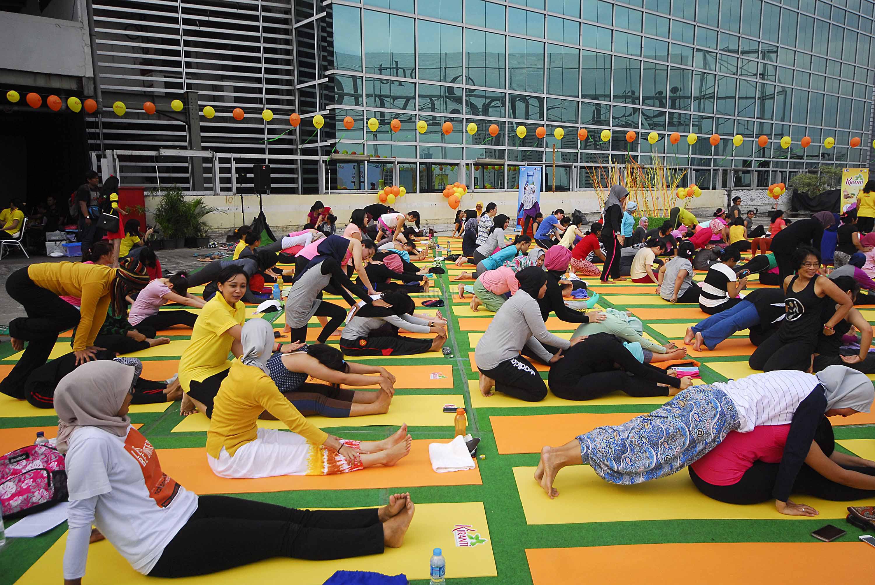Sejumlah peserta mengikuti gerakan Yoga in the Air di rooftop Plaza Semanggi, Jakarta, Sabtu (30/4/2016). Kegiatan ini dilakukan sebagai bentuk kampanye "Stay fresh and healthy with Kiranti" yang bertujuan mengajak wanita Indonesia untuk memilih cara yang sehat saat datang bulan. AKTUAL/TINO OKTAVIANO