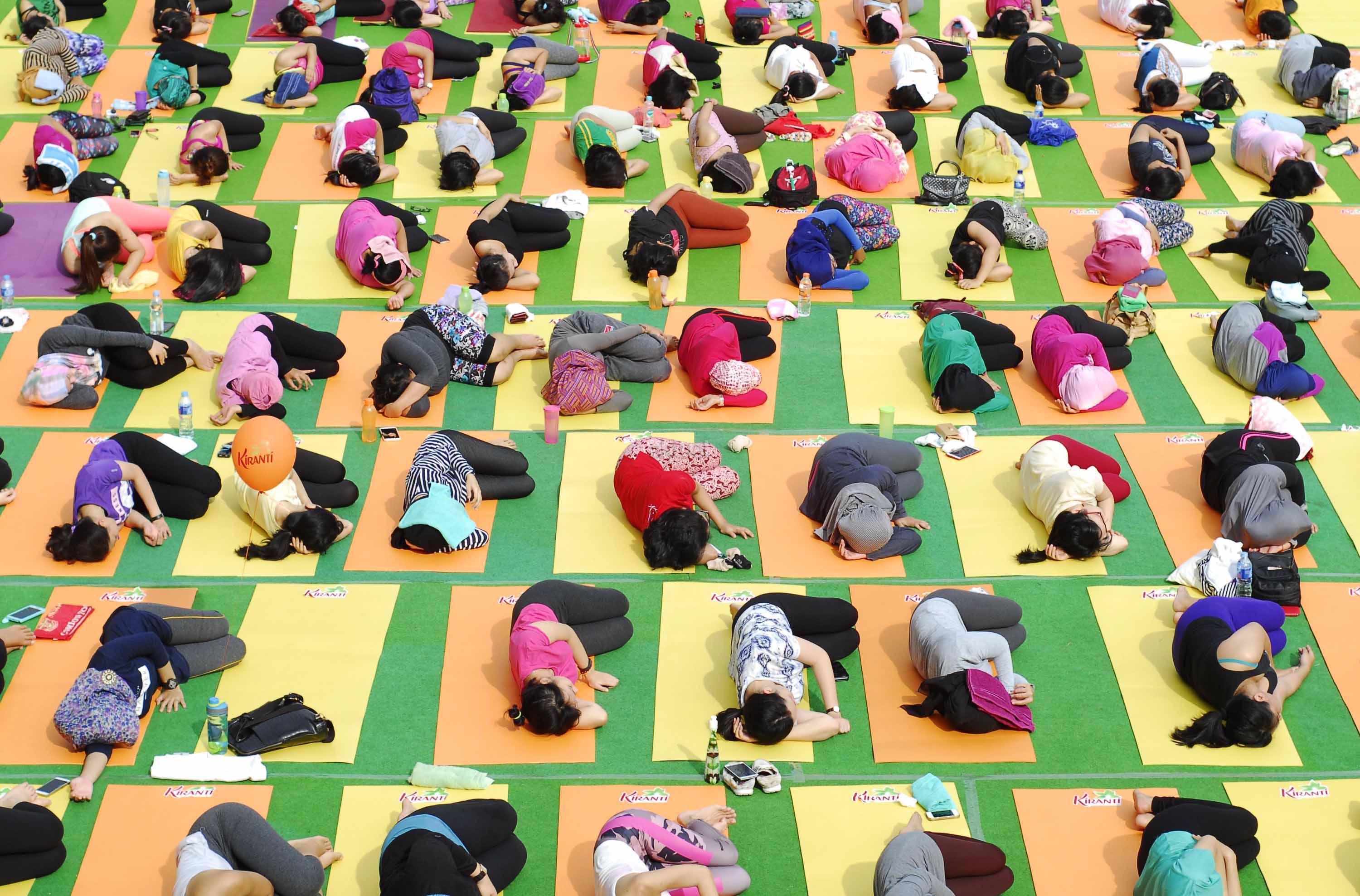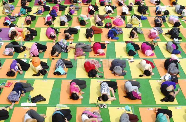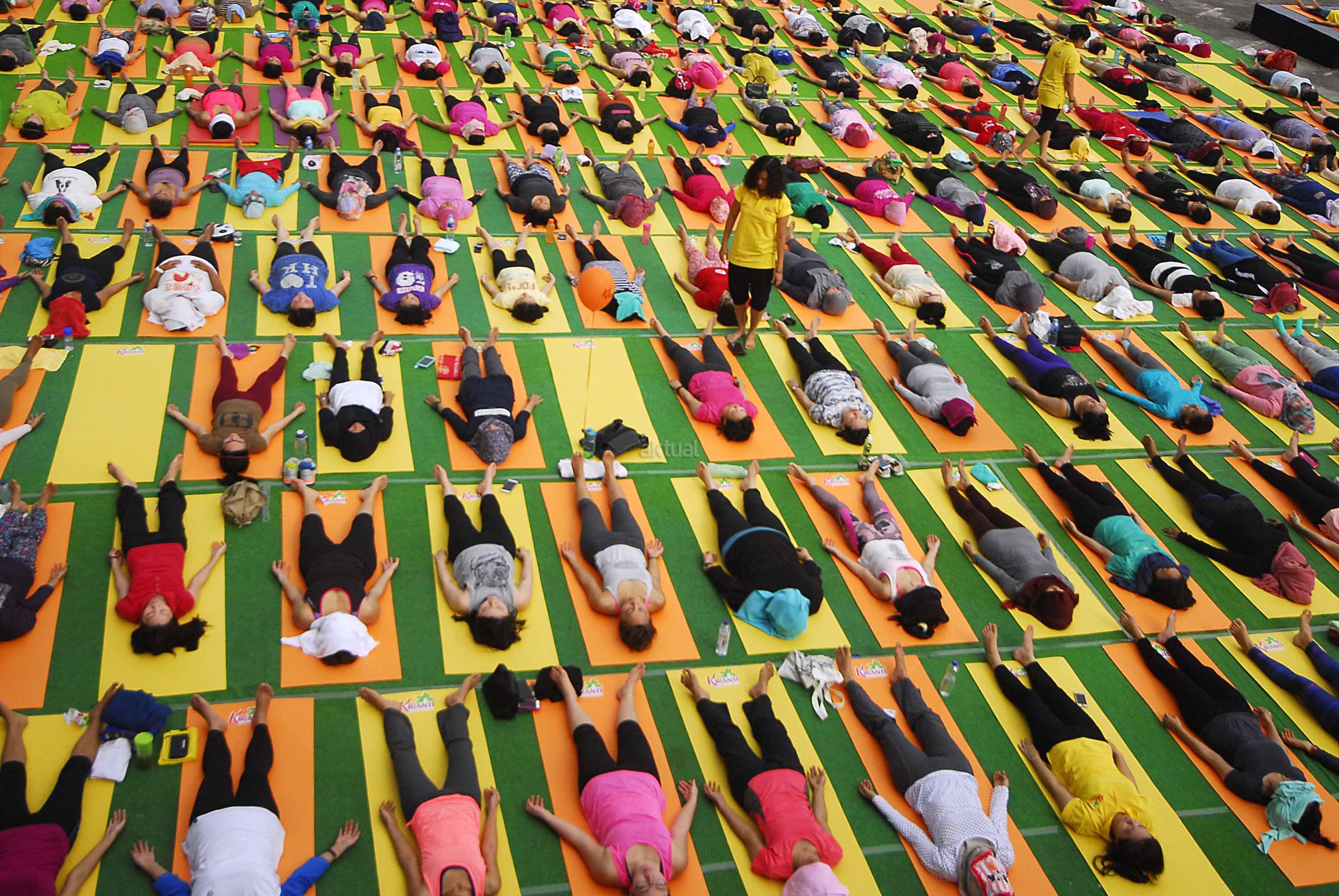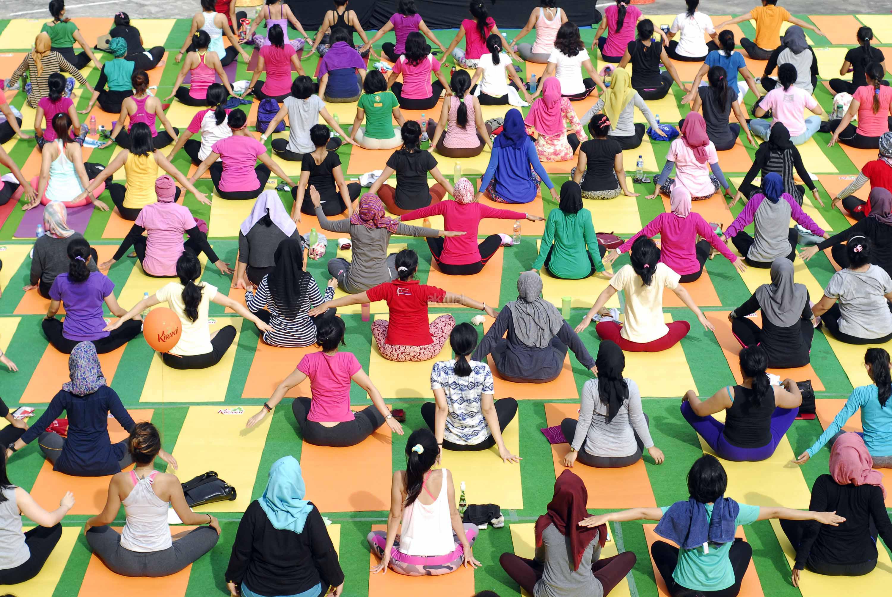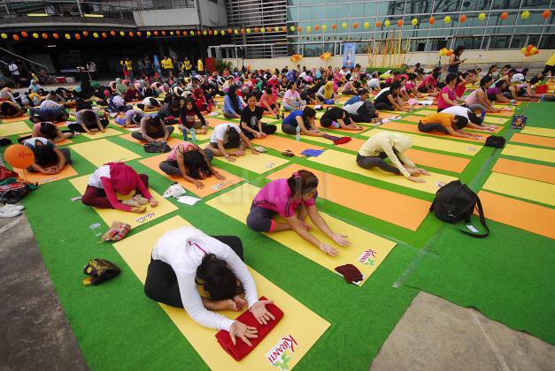 Sejumlah peserta mengikuti gerakan Yoga in the Air di rooftop Plaza Semanggi, Jakarta, Sabtu (30/4/2016). Kegiatan ini dilakukan sebagai bentuk kampanye "Stay fresh and healthy with Kiranti" yang bertujuan mengajak wanita Indonesia untuk memilih cara yang sehat saat datang bulan. AKTUAL/TINO OKTAVIANO